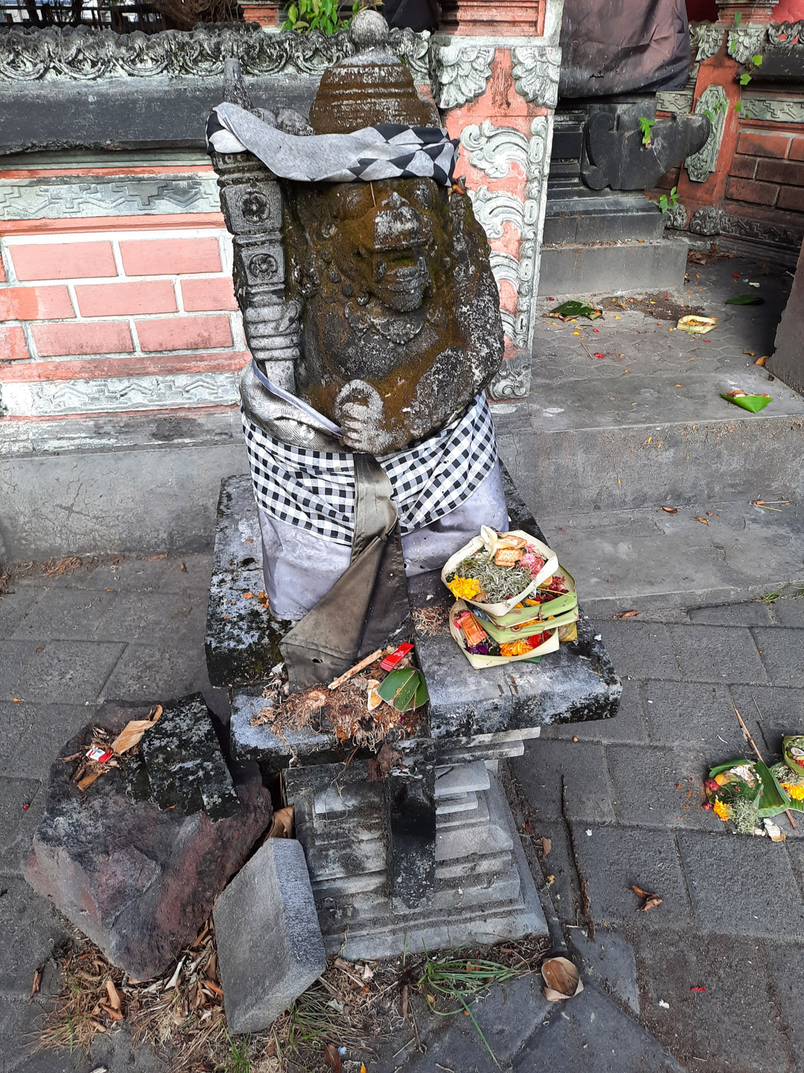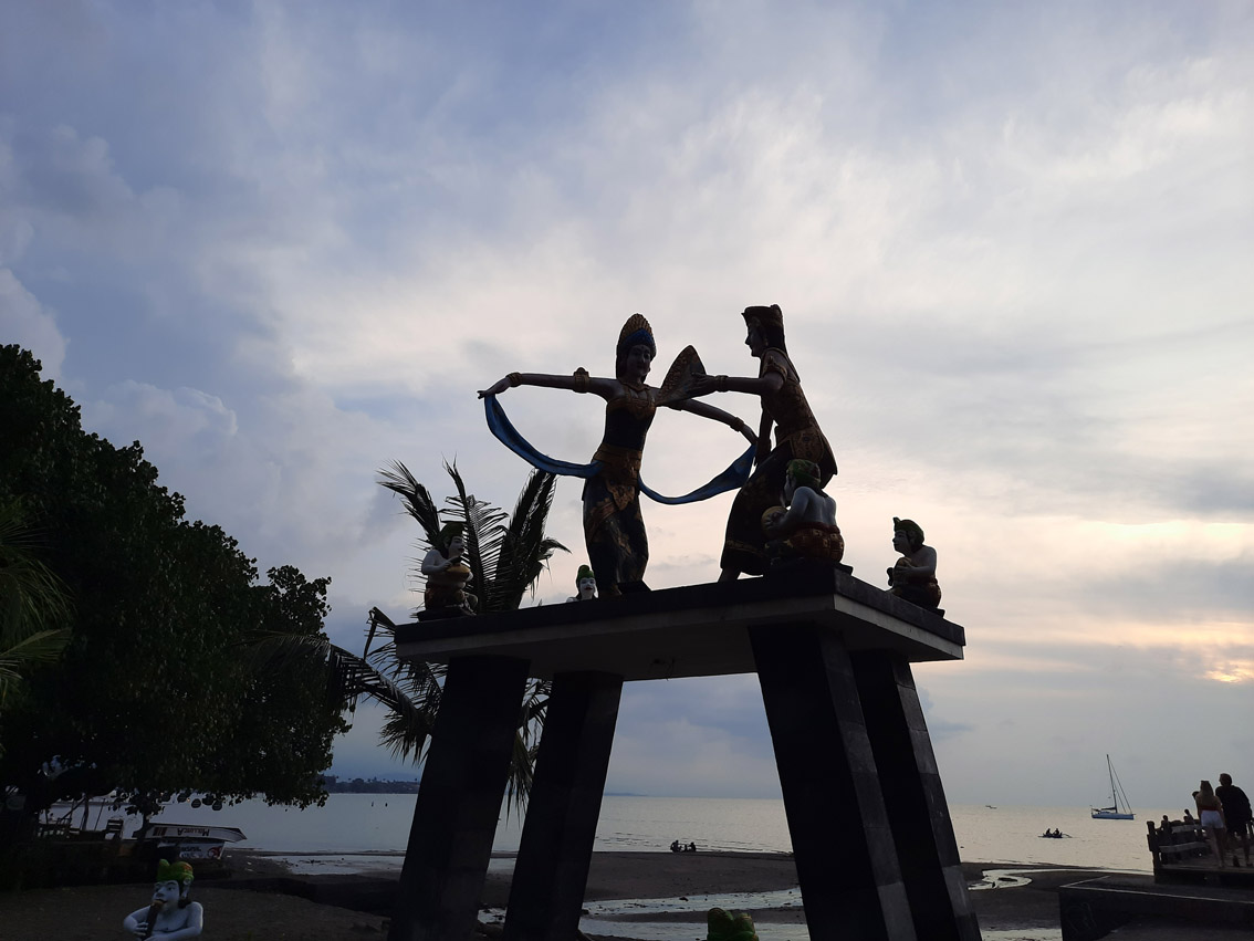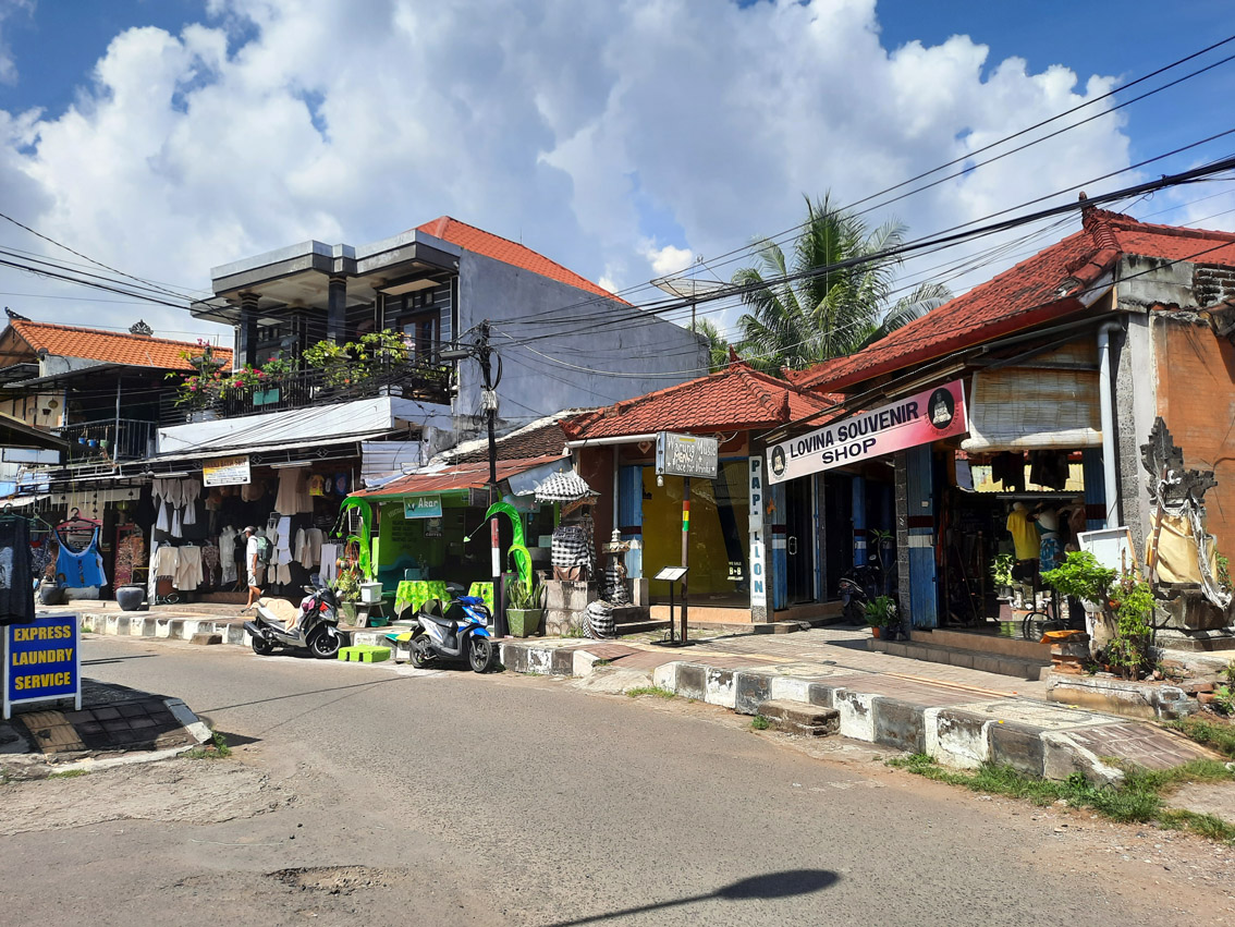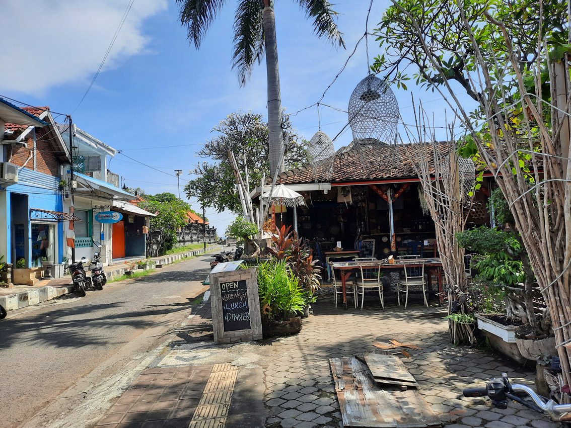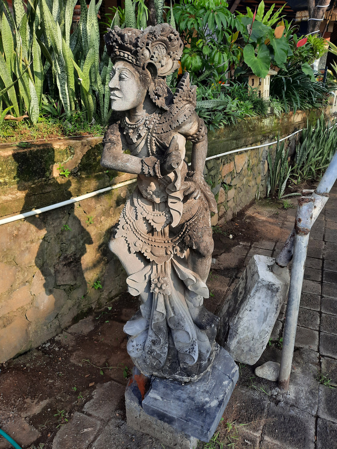 La première chose qui frappe quand on descend à terre c’est les fioritures et autres scultures d’inspiration hindou qui ornent tous les bâtiments fussent-ils temples, commerces restaurants ou maisons d’habitation. Chaque île d’Indonésie est vraiment un pays à part ! La deuxième chose c’est le désespoir des habitants qui ont dû survivre tant bien que mal à ces deux années de COVID,eux dont l’économie est entièrement basée sur le tourisme. Du coup ils sautent littéralement sur le premier étranger qu’ils voient (aujourd’hui c’est nous:() pour lui vendre des bijoux traditionnels, des perles, des fruits, de la boisson, une promenade en bateau pour aller voir les dauphins ou en voiture pour aller voir les cascades ou des temples et il est très difficile de leur faire lâcher prise et de les convaincre que pour l’instant on veut juste se dégourdir les jambes le long du bord de mer. Pour les chutes d’eau et les temples on aura tout le temps d’en faire la tournée avec nos amis Régine et Michel à la fin du mois.