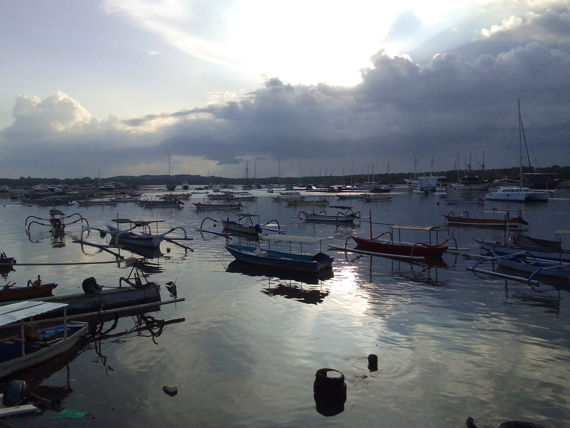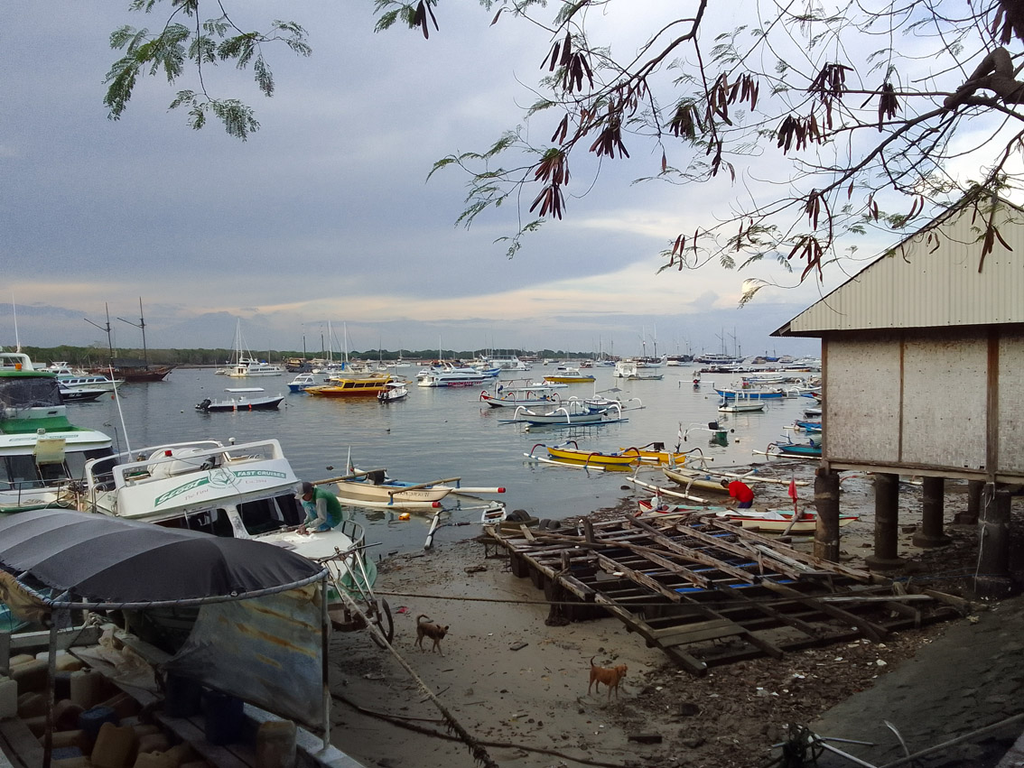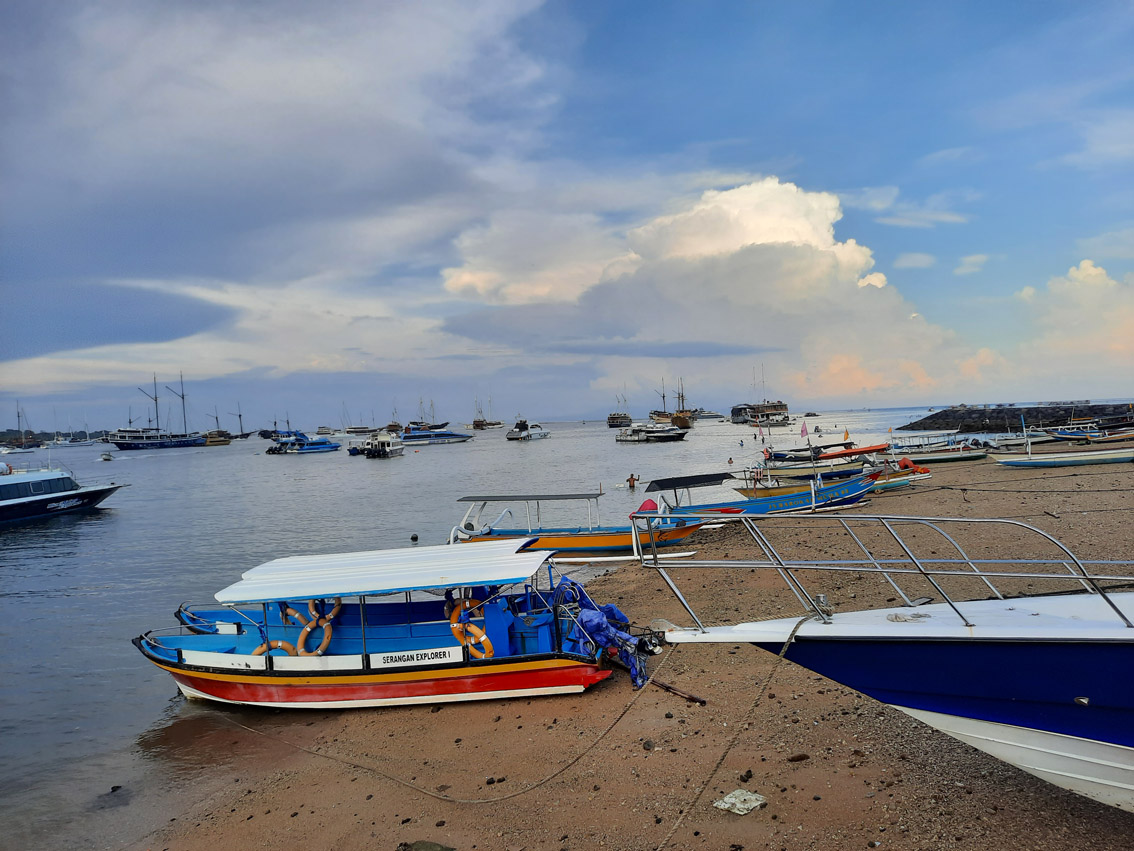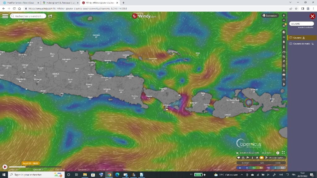 Rentré au bateau nous étudions les possibilités qui s’offrent à nous. Le port est manifestement plein et nous ne savons pas combien de temps nous pourrons utiliser cette bouée, ce matin en arrivant sur le ponton un quidam nous en a demandé 150 Krp par jour mais comme il n’a pas insisté, c’était sans doute une arnaque. Autant donc aller dès que possible sur Gili Asahan ou nous voulons laisser Rêve à Deux pendant que nous visiterons Bali et Lombok avec nos amis. Mais nous ne sommes pas à la bourre non plus. Pour éviter les déboires de la nuit dernière et passer des heures à lutter contre le courant nous étudions donc en profondeur les fichiers météo et toutes les cartes de courants. Deux options se dessinent 1) partir demain matin avec le courant descendant, passer par le sud de Nusapenida (côté océan) et retrouver le courant montant pour franchir le détroit de Lombok dans un vent de sud est de 10 à 12 nœuds (travers). Ou 2) partir le jour suivant de très bonne heure (avant la renverse) passer par le nord de Nusapenida pour traverser le détroit sur plus ou moins la même trajectoire que les ferrys. La solution 1 est sur le papier la plus rapide mais on risque de rencontrer une mer plus formée, la solution 2 risque de nous faire arriver très tard voir d’être obligé de remonter sur Gili Air.