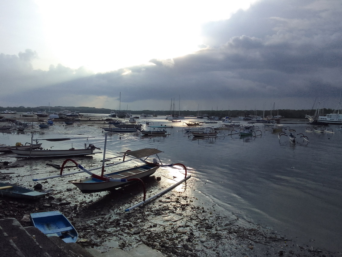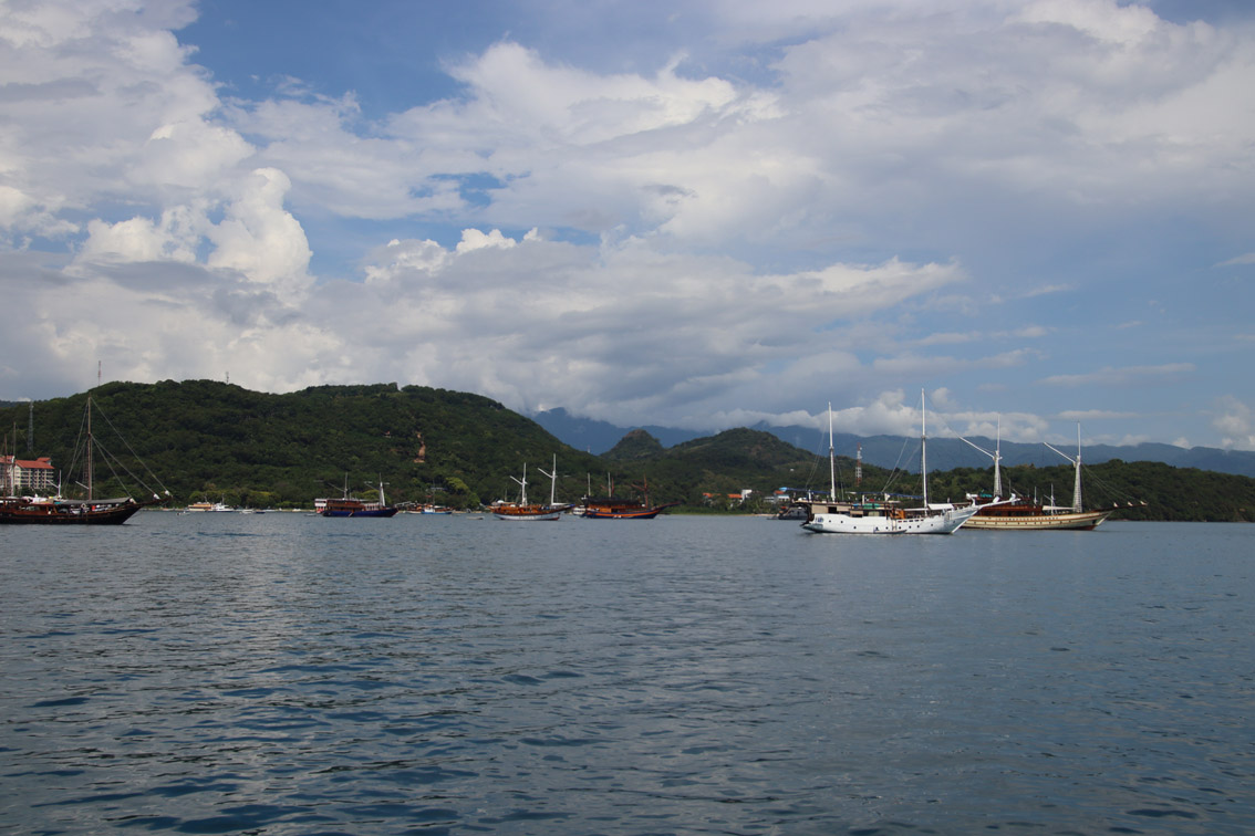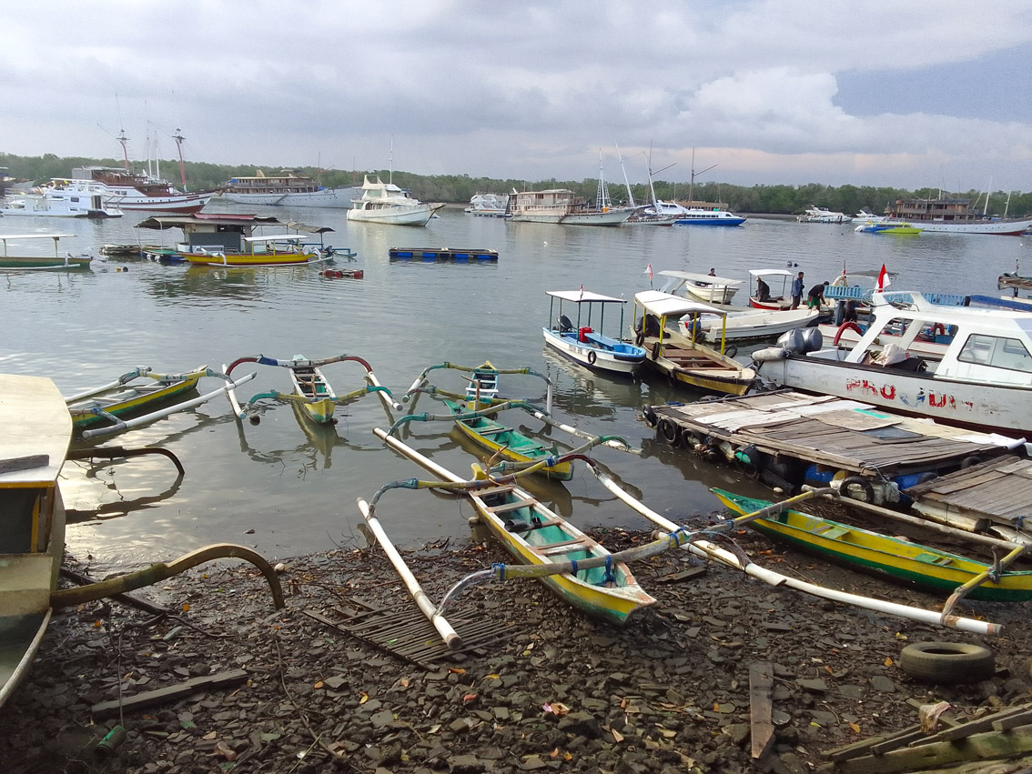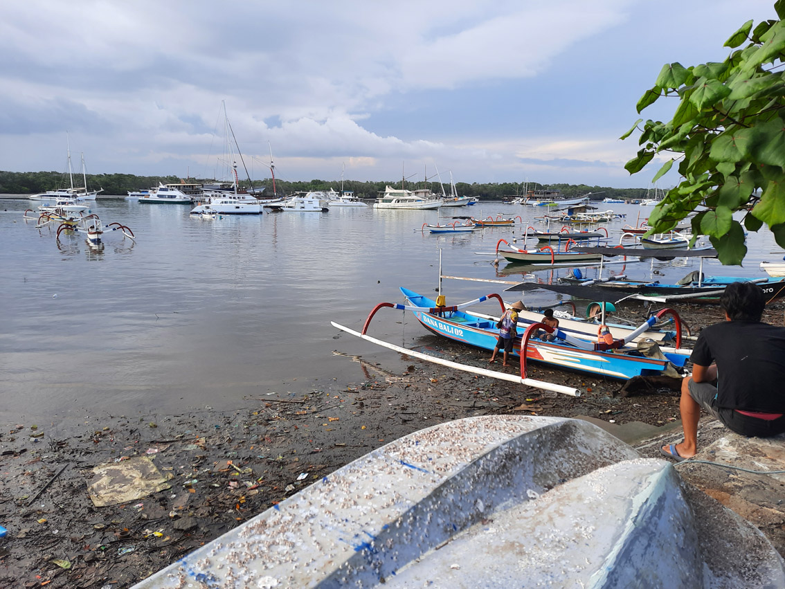 Rentré au bateau nous étudions les possibilités qui s’offrent à nous. Le port est manifestement plein et nous ne savons pas combien de temps nous pourrons utiliser cette bouée, ce matin en arrivant sur le ponton un quidam nous en a demandé 150 Krp par jour mais comme il n’a pas insisté, c’était sans doute une arnaque. Autant donc aller dès que possible sur Gili Asahan ou nous voulons laisser Rêve à Deux pendant que nous visiterons Bali et Lombok avec nos amis. Mais nous ne sommes pas à la bourre non plus. Pour éviter les déboires de la nuit dernière et passer des heures à lutter contre le courant nous étudions donc en profondeur les fichiers météo et toutes les cartes de courants. Deux options se dessinent 1) partir demain matin avec le courant descendant, passer par le sud de Nusapenida (côté océan) et retrouver le courant montant pour franchir le détroit de Lombok dans un vent de sud est de 10 à 12 nœuds (travers). Ou 2) partir le jour suivant de très bonne heure (avant la renverse) passer par le nord de Nusapenida pour traverser le détroit sur plus ou moins la même trajectoire que les ferrys. La solution 1 est sur le papier la plus rapide mais on risque de rencontrer une mer plus formée, la solution 2 risque de nous faire arriver très tard voir d’être obligé de remonter sur Gili Air.