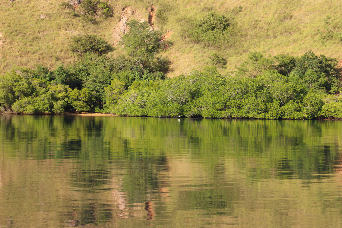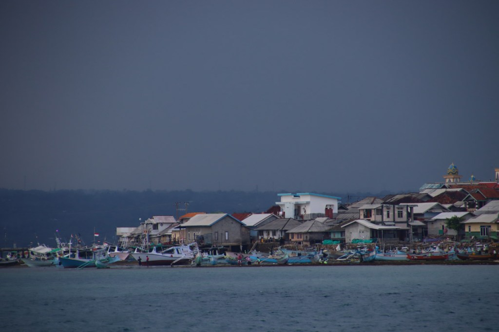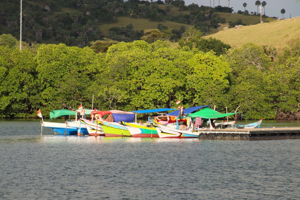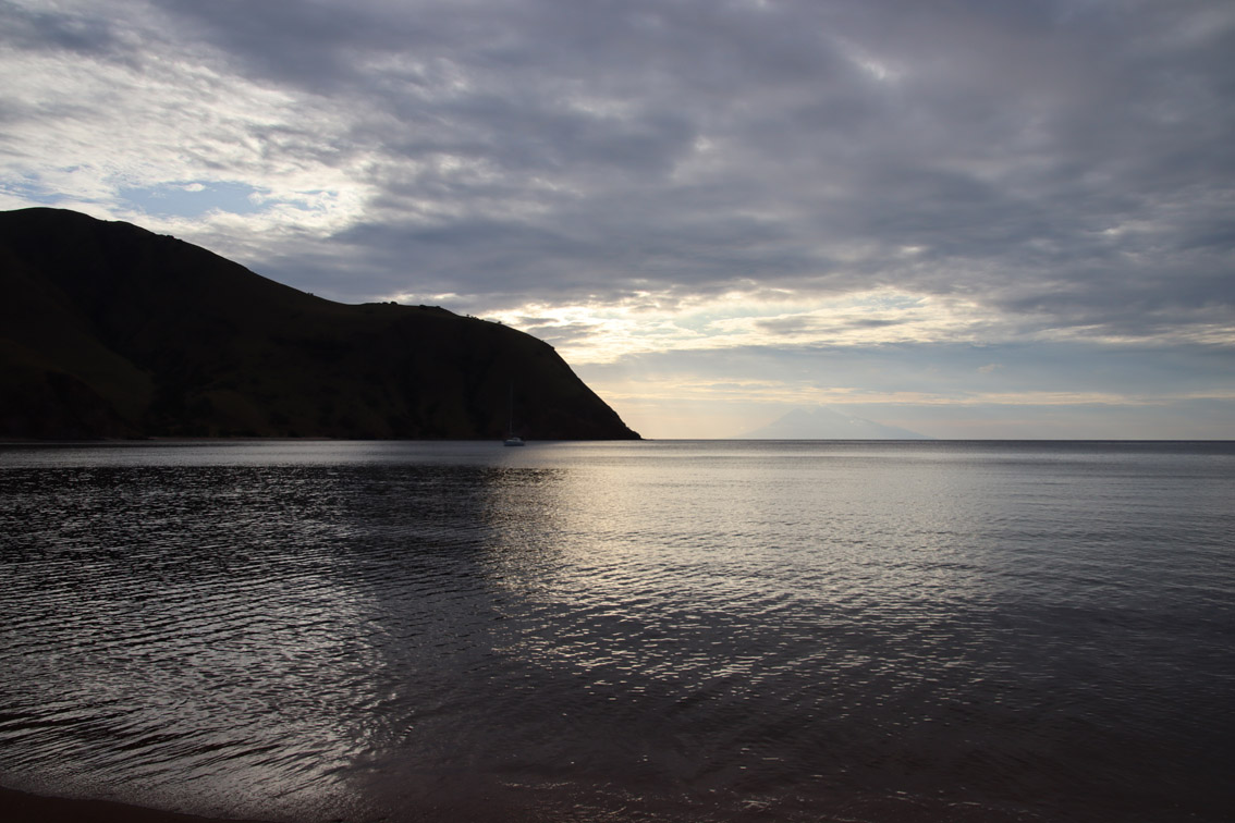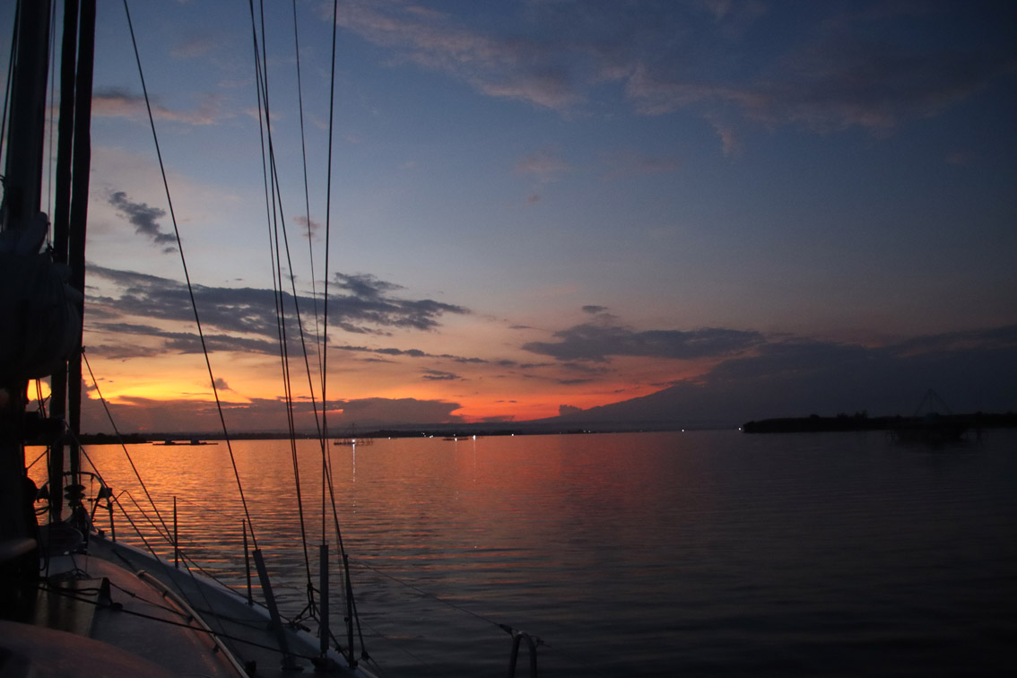 Dimanche matin nous levons l’ancre direction la pointe Ouest de l’île. Le vent est faible mais on a tout le temps alors on s’amuse à chasser les risées . Il est 17:00 quand nous ancrons au milieu de la petite baie de Banyuwedang. C’est une très jolie baie parfaitement protégée de tous les vents, on y rentre par une passe étroite mais sans danger, elle est entourée de mangrove et de collines boisées. La vue depuis le mouillage est époustouflante, à l’Ouest le sommet des volcans de Java flamboient dans le soleil couchant, du sud et à l’Est les sommets découpés des montagnes de Bali sont mis en valeur par les derniers rayons. Dîner au restaurant du Menjangan Dynasty resort, sur la plage. Décors superbe mais repas décevant, prix élevés et portions à peine suffisantes pour une midinette anorexique.