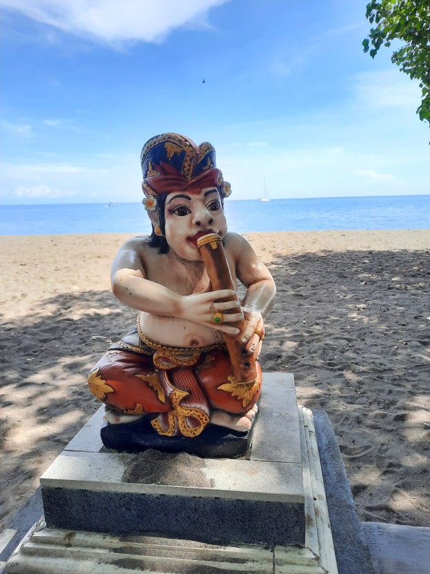 La première chose qui frappe quand on descend à terre c’est les fioritures et autres scultures d’inspiration hindou qui ornent tous les bâtiments fussent-ils temples, commerces restaurants ou maisons d’habitation. Chaque île d’Indonésie est vraiment un pays à part ! La deuxième chose c’est le désespoir des habitants qui ont dû survivre tant bien que mal à ces deux années de COVID,eux dont l’économie est entièrement basée sur le tourisme. Du coup ils sautent littéralement sur le premier étranger qu’ils voient (aujourd’hui c’est nous:() pour lui vendre des bijoux traditionnels, des perles, des fruits, de la boisson, une promenade en bateau pour aller voir les dauphins ou en voiture pour aller voir les cascades ou des temples et il est très difficile de leur faire lâcher prise et de les convaincre que pour l’instant on veut juste se dégourdir les jambes le long du bord de mer. Pour les chutes d’eau et les temples on aura tout le temps d’en faire la tournée avec nos amis Régine et Michel à la fin du mois.