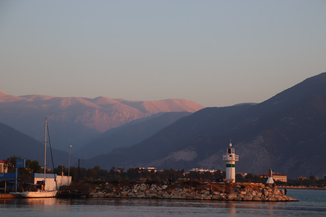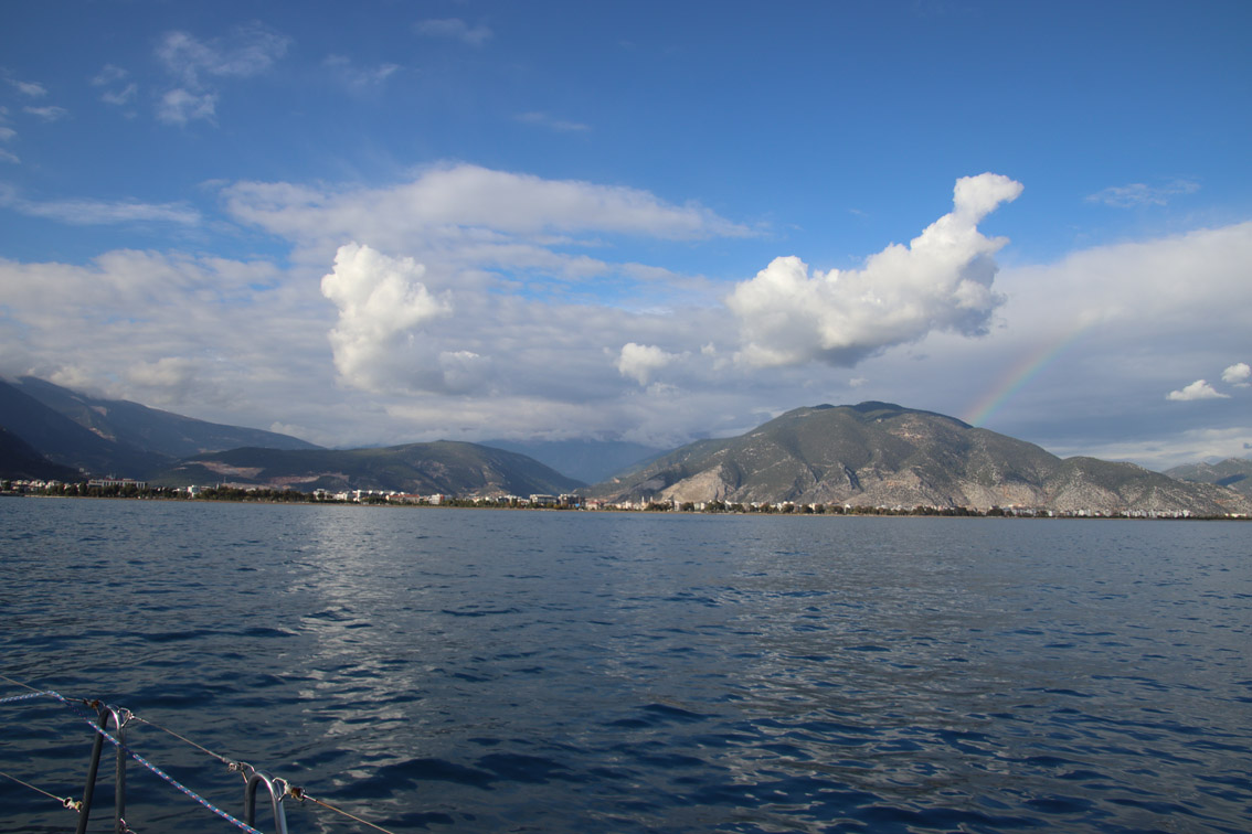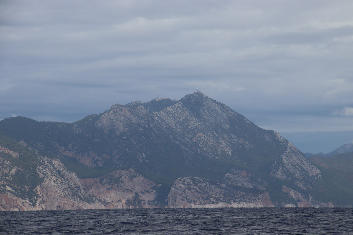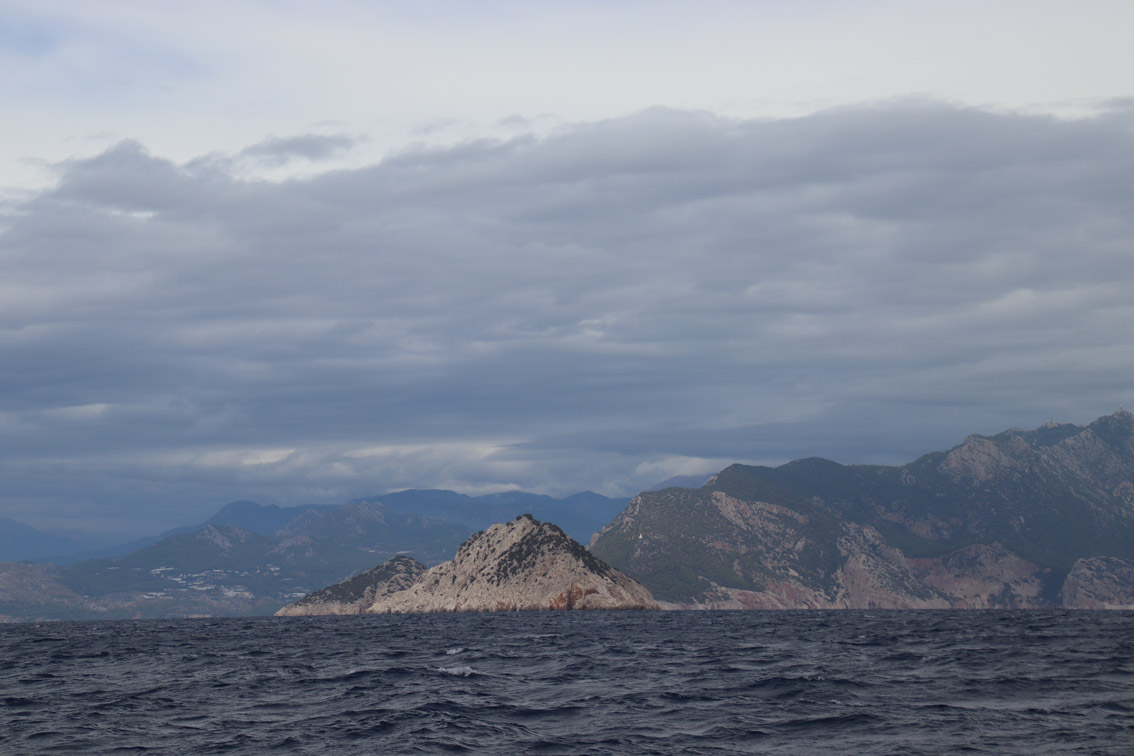 La traversée de Latchi (Chypre) à Finike (Turquie) s’est faite en grande partie dans du tout petit temps avec un vent tout juste suffisant pour nous déhaler à quelques nœuds sans avoir à trop mettre le moteur et surtout deux très gros orages avec éclairs dans tous les sens, pluie diluvienne et surtout violentes rafales montant jusqu’à 35 nds en quelques minutes. Heureusement on les voyait bien arriver ce qui nous a permis de réduire la toile à temps. A noter que les gribs n’indiquait des rafales jusqu’à 20 nds mais pas de tendance orageuse marquée (CAPE < 300 J/kg). Le dernier orage nous laisse peu après le levé du jour en vue de la côte Turque et c’est vers 15:00 Lundi 7/11/2022, sous un ciel encore bien chargé de nuages que nous nous amarrons au quai de la Marina de Finike .