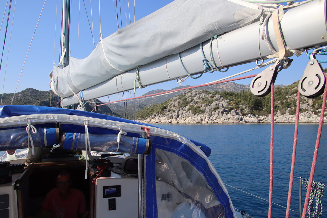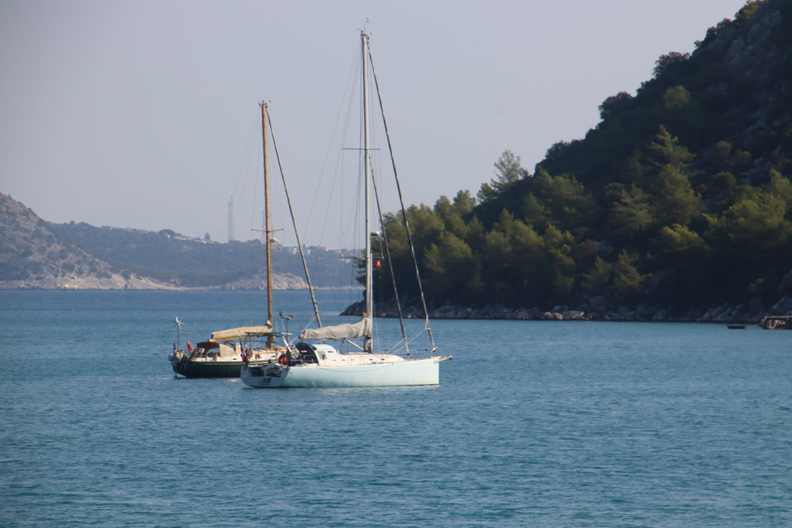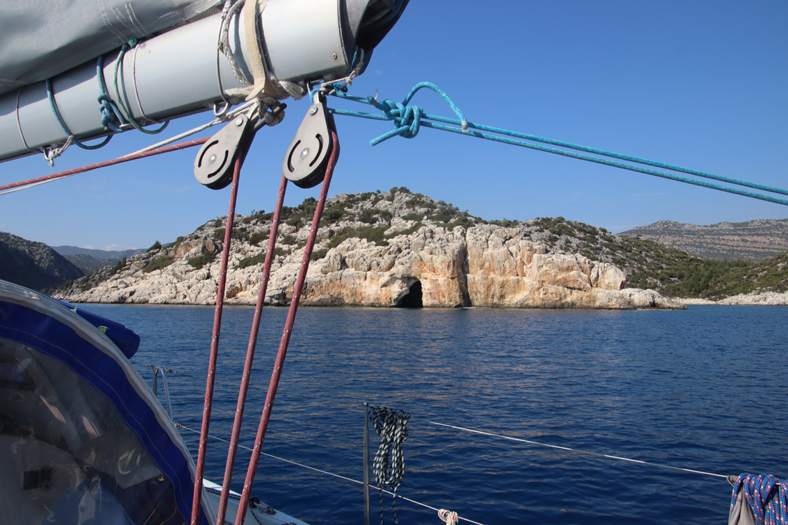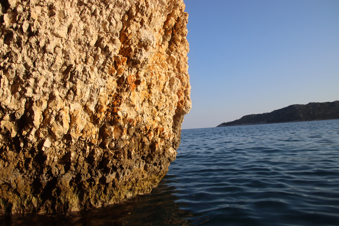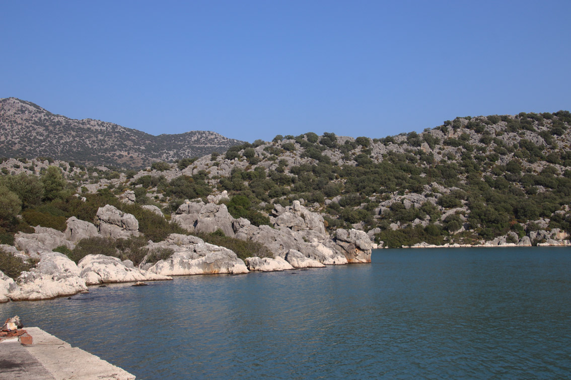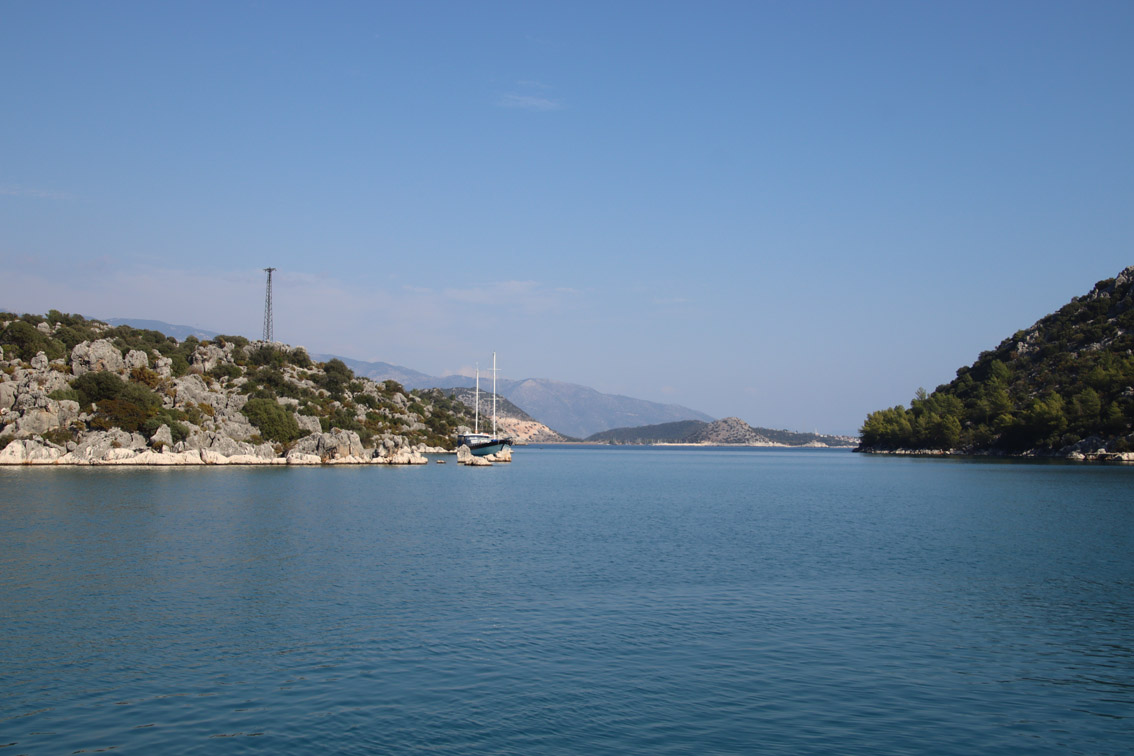 Cette partie de la côte sud-ouest de la Turquie est bordée d’îles et d’îlots et découpée de baies bien protégées formant un vrai labyrinthe: un paradis pour faire du rase cailloux en toute décontraction surtout quand le temps s’y prête comme aujourd’hui: vent faible, mer plate, ciel bleu limpide et la mer transparente . La moindre crique est parait-il constellée de ruines le plus souvent antiques.