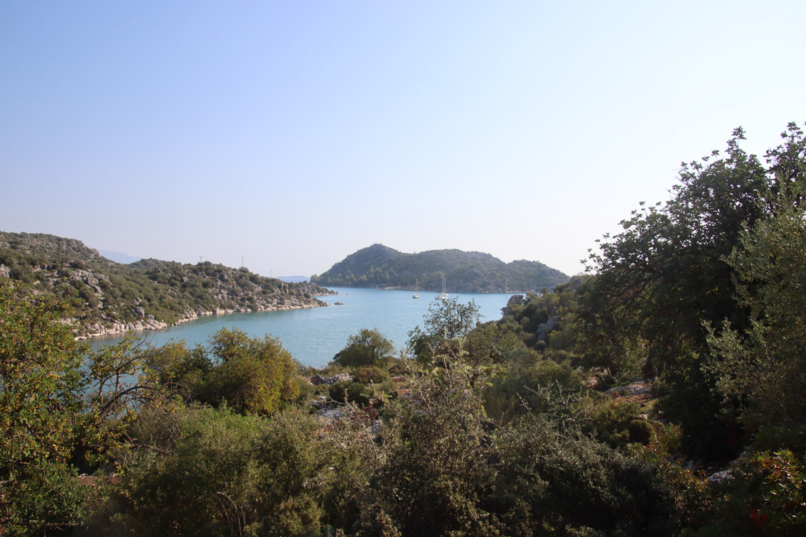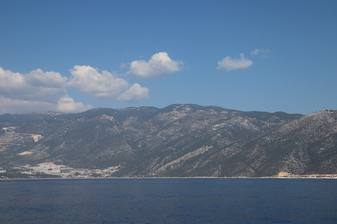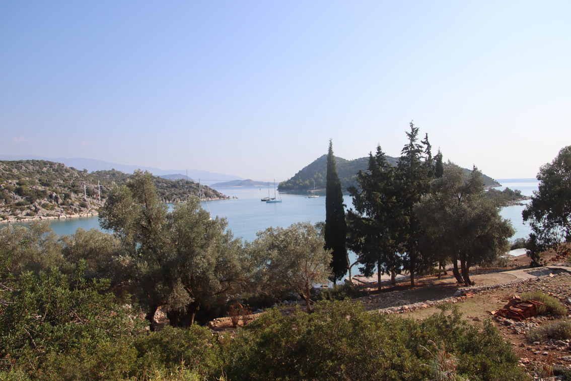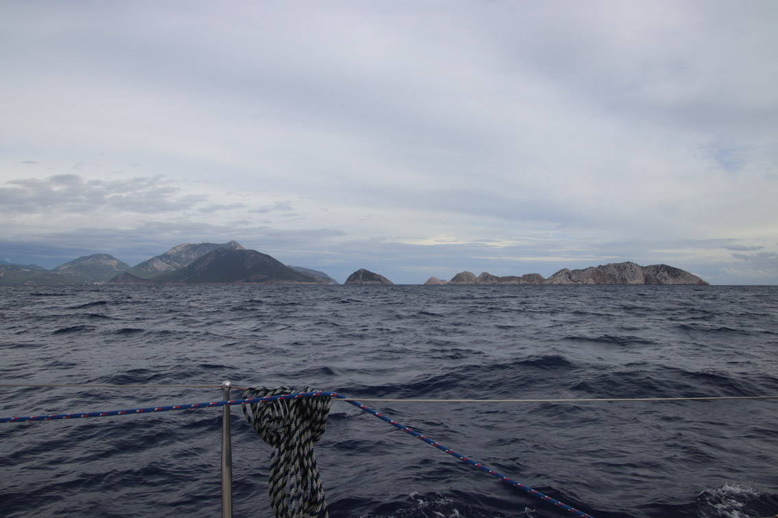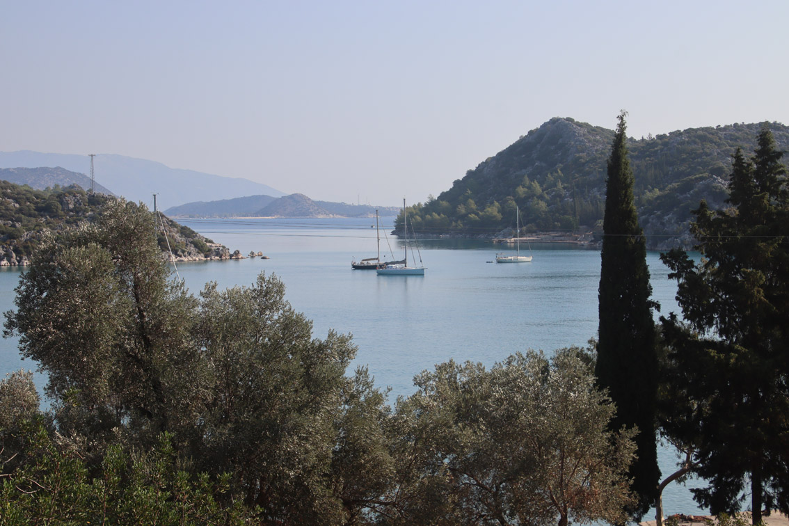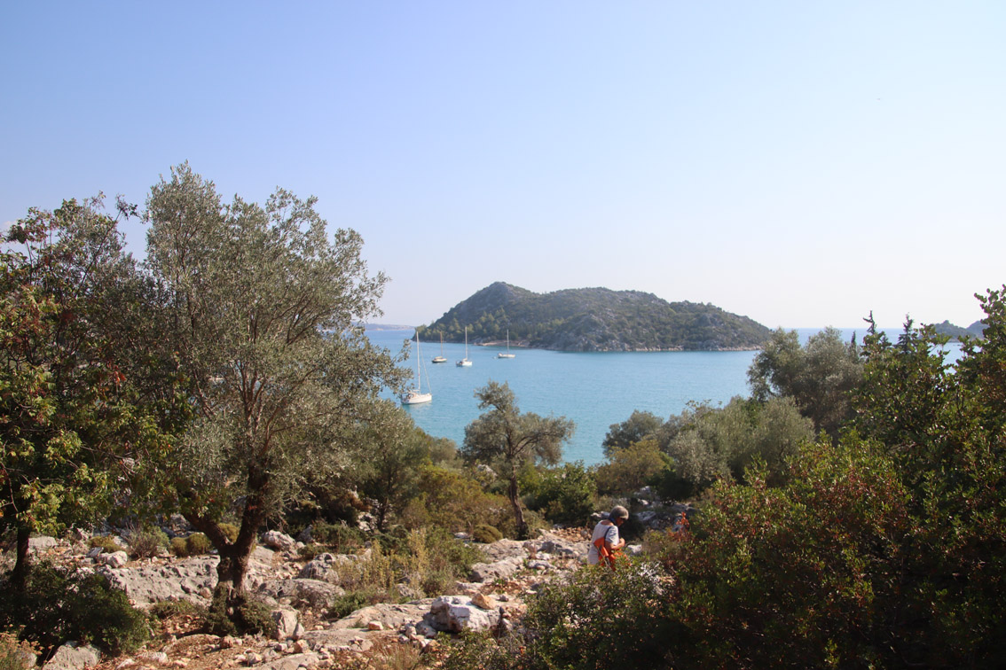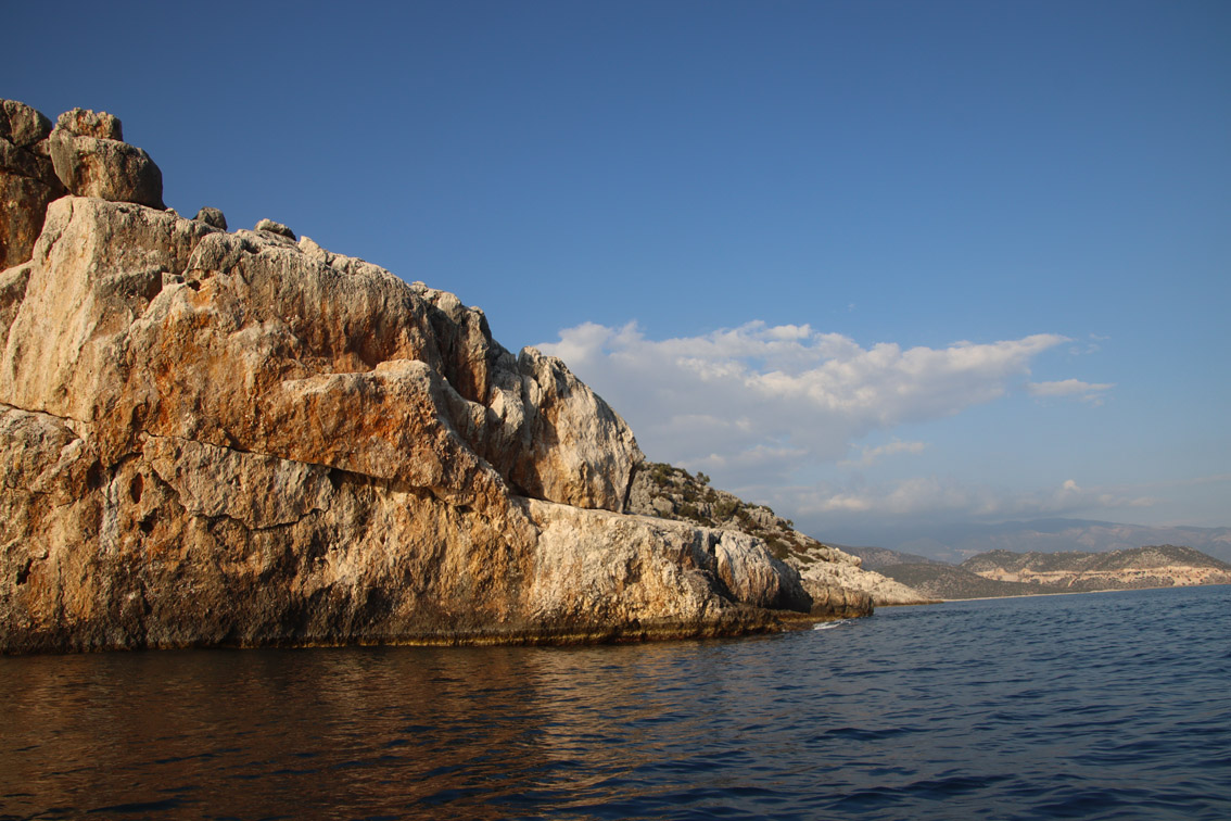 Cette partie de la côte sud-ouest de la Turquie est bordée d’îles et d’îlots et découpée de baies bien protégées formant un vrai labyrinthe: un paradis pour faire du rase cailloux en toute décontraction surtout quand le temps s’y prête comme aujourd’hui: vent faible, mer plate, ciel bleu limpide et la mer transparente . La moindre crique est parait-il constellée de ruines le plus souvent antiques.