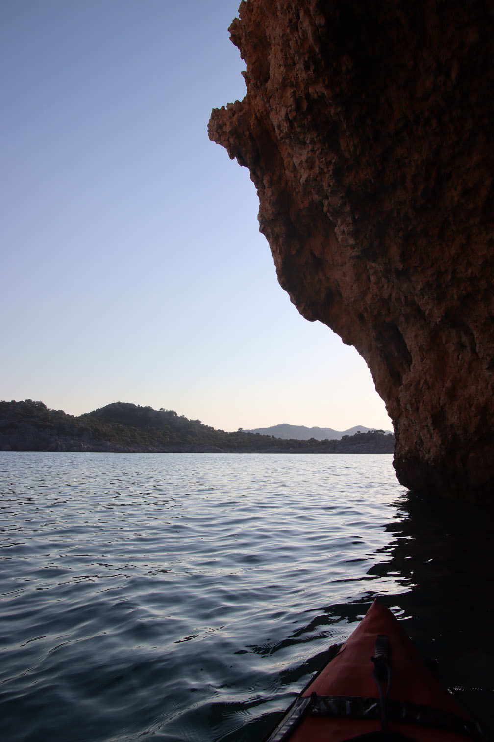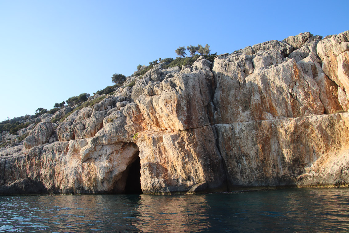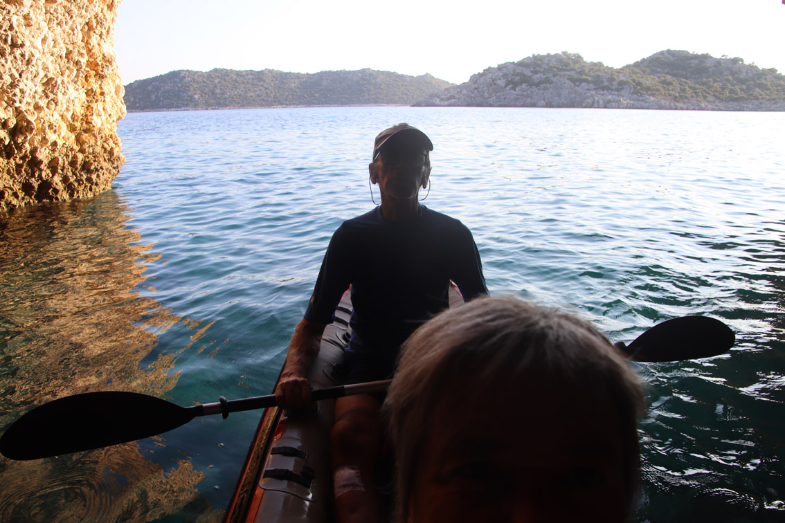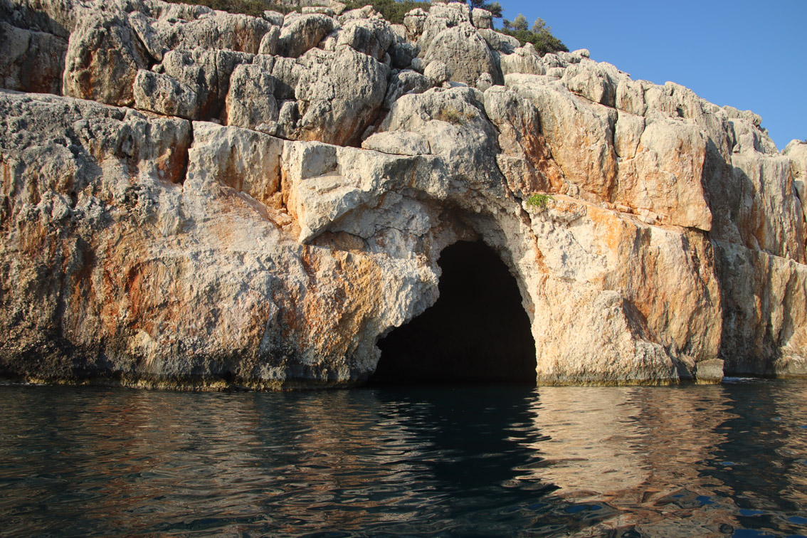 l’endroit est truffé de ruines et de grottes nous avons plaisir à suivre les chemins des chèvres et à explorer les îlots en kayak (ici la grotte de Korsan Magarasi)