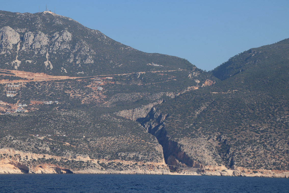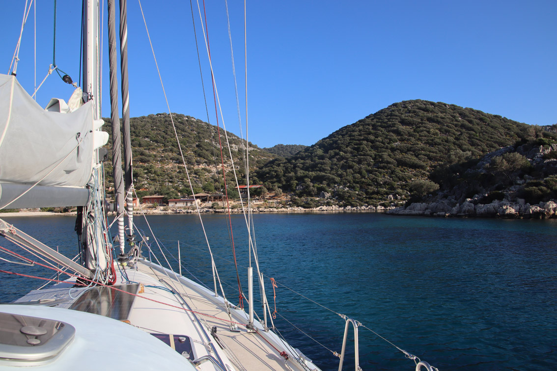 Nous quittons la baie de Kekova avec un vent faible mais suffisant pour avancer. En début d’après midi nous ancrons dans la baie de Facdere, bien dissimulée derrière deux îlots rocheux au fond d’une grande baie aux rives abruptes. Seulement quelques maisons, un sentier de randonnée, le cadre est idyllique mais c’est le cas de toute la côte on commence à s’habituer.