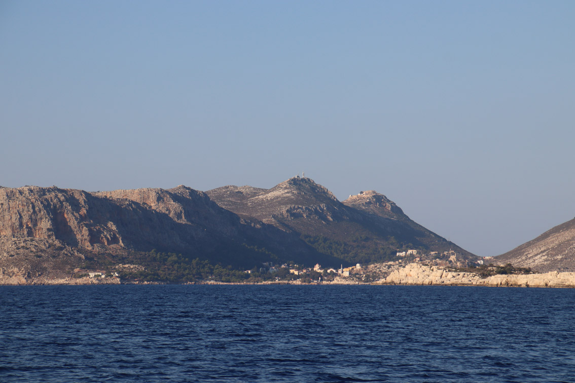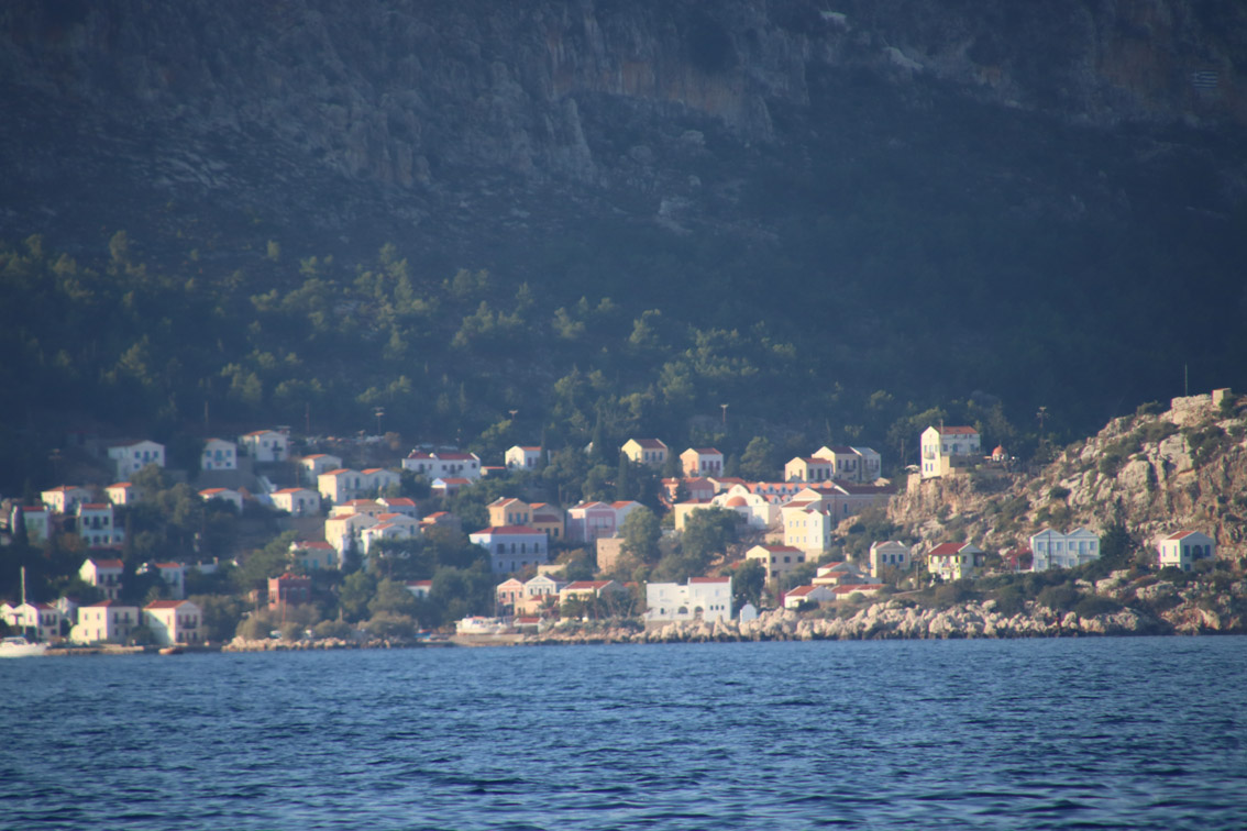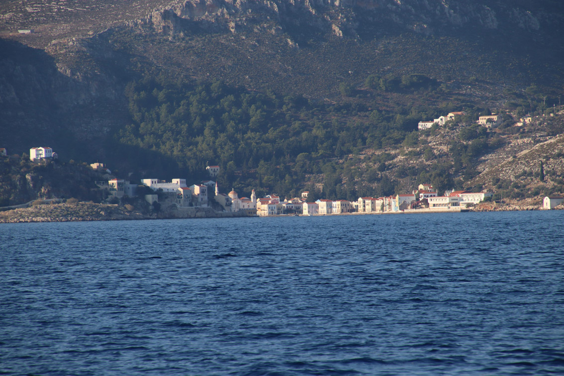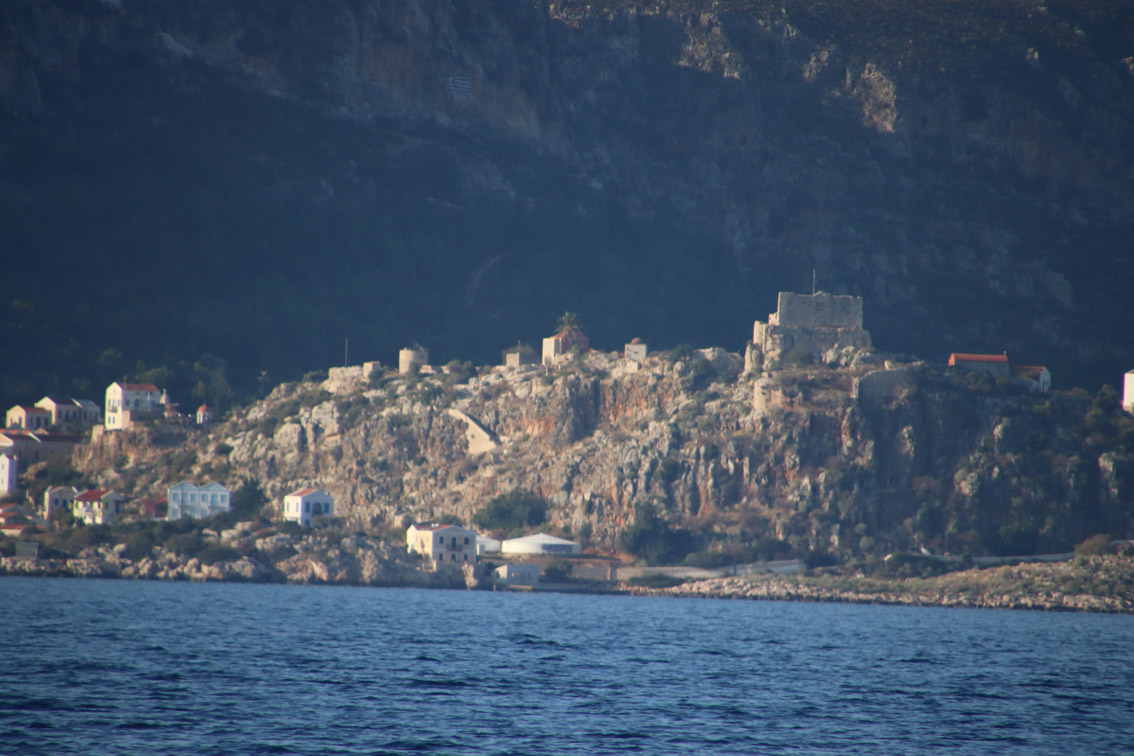 Le lendemain 13 Novembre 2022, nous reprenons notre progression paresseuse vers l’ouest. Nous passons entre le continent et Kastellórizo / Megisti. C’est une île Grecque située à seulement 1,5 milles (3km) de la côte Turque continentale et 70 milles de Rhodes dont elle dépend. On comprend facilement pourquoi les relations entre les deux pays sont si tendues et on fait bien attention de ne pas dépasser la limite des eaux territoriales: on ne veut pas d’ennui avec les gardes côtes ne l’un ni de l’autre pays!