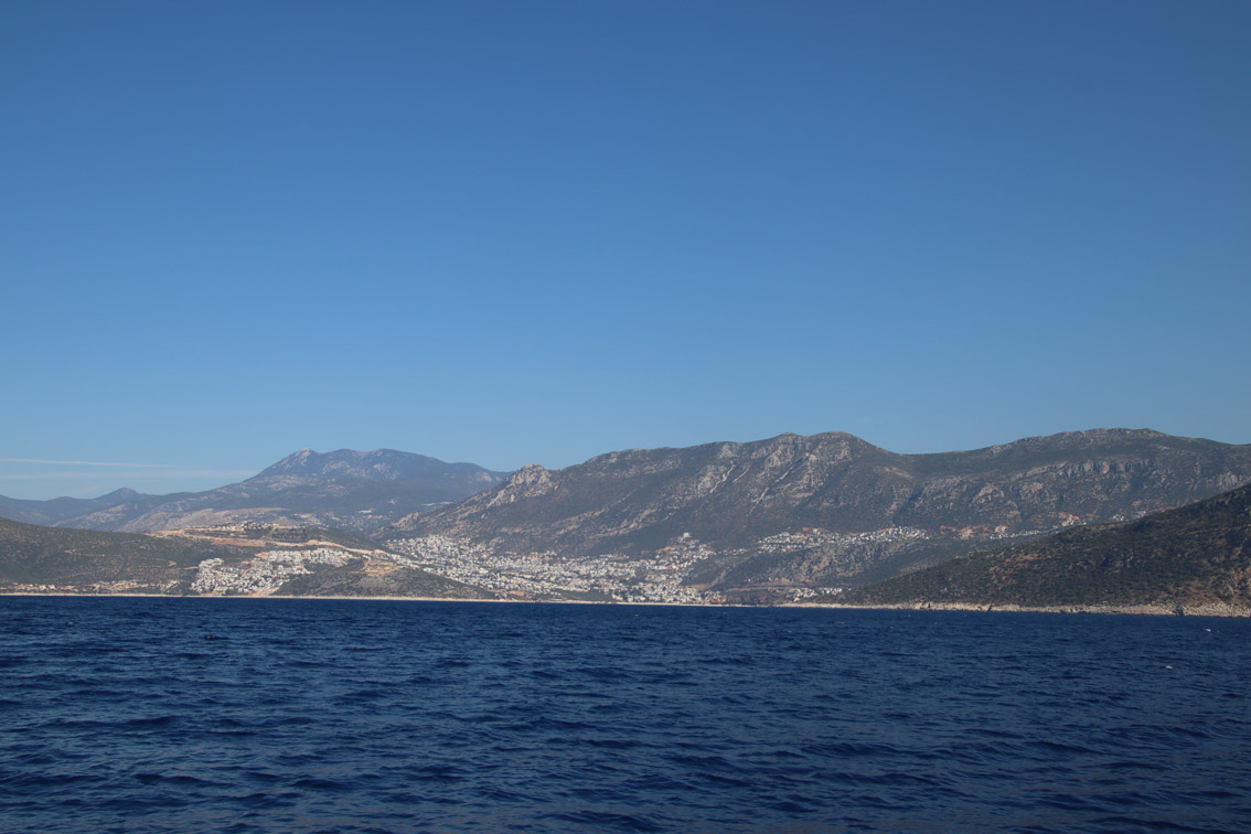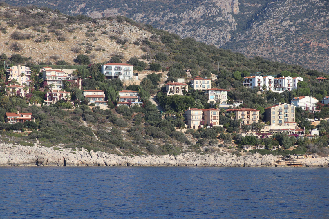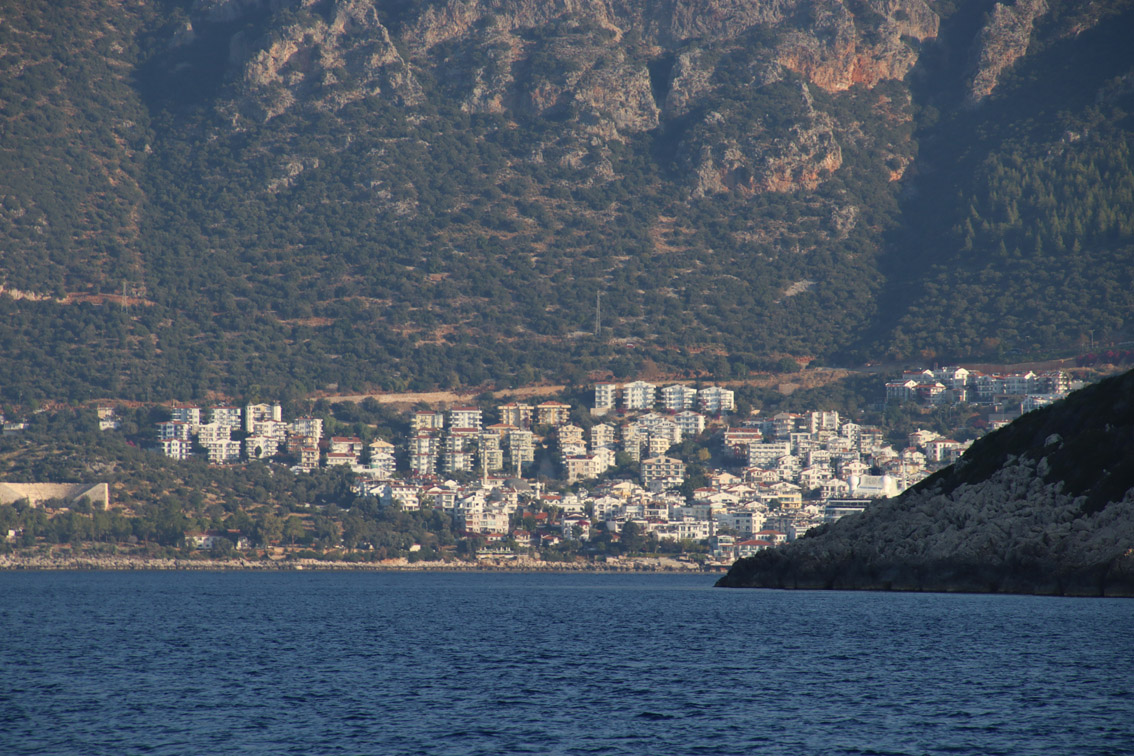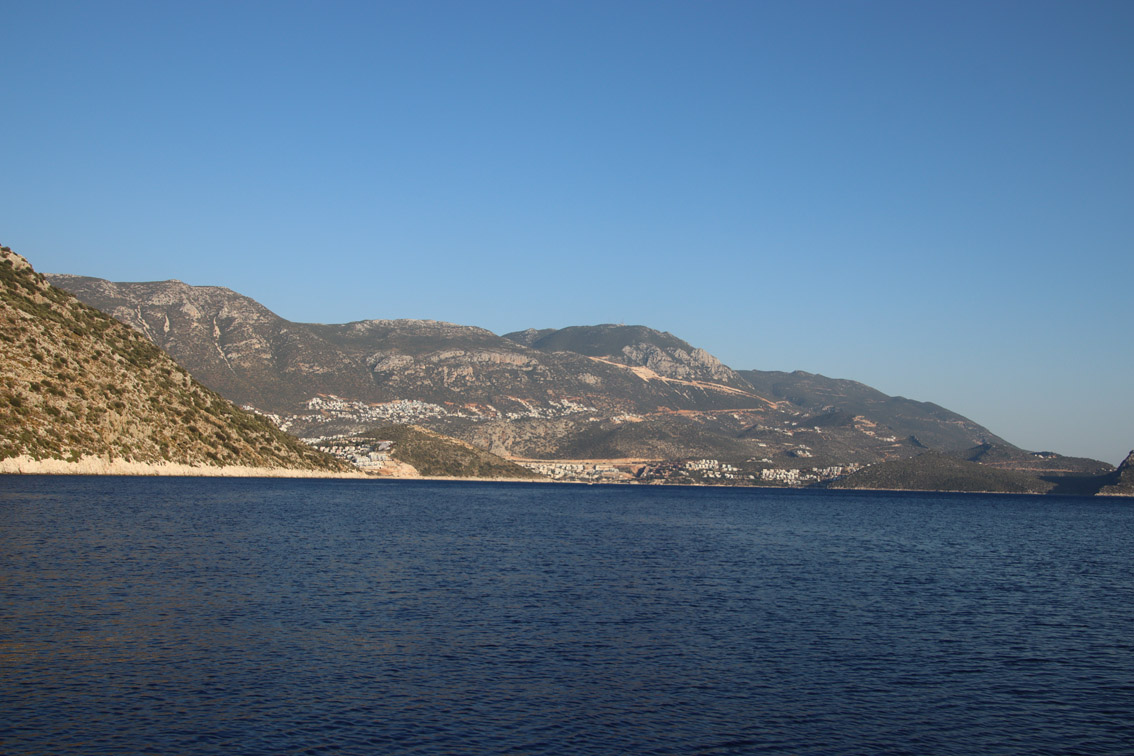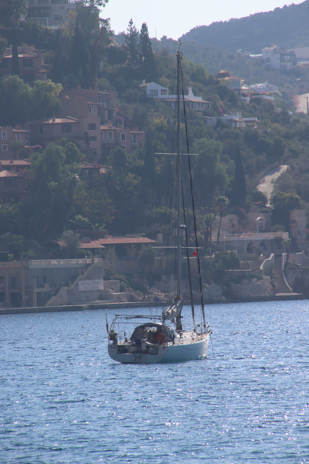 Nous ancrons dans la grande baie d’Yeşilköy (on a pas encore pu déterminer comment doit se prononcer le S cédille) après une après midi relax et une bonne nuit (encore une) nous traversons la baie pour nous rendre au village de Kalkan, petite station balnéaire nichée à flanc de côteau. Nous ancrons devant la plage juste à côté de l’entrée du port. Les environs sont un peu défigurés par des lotissements de vacances sans cachet mais la vieille ville est jolie avec ses petites maisons au murs blanchis à la chaux et sa vieille mosquée. Plus haut il y a un super marché Carrefour mais il est petit et pas très bien achalandé en produits d’alimentation par contre il dispose d’un rayon alcools avec un très bon choix de vins Turcs: si si çà existe! Ils ne sont pas mauvais du tout et à des prix raisonnables.