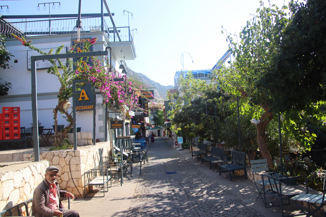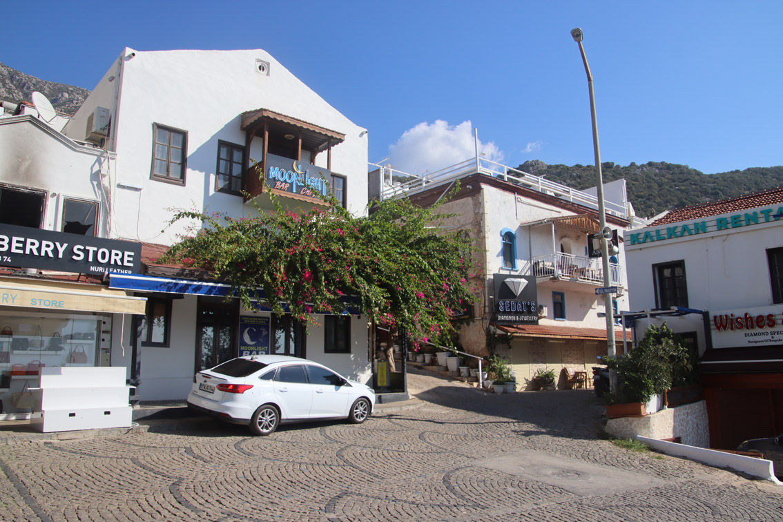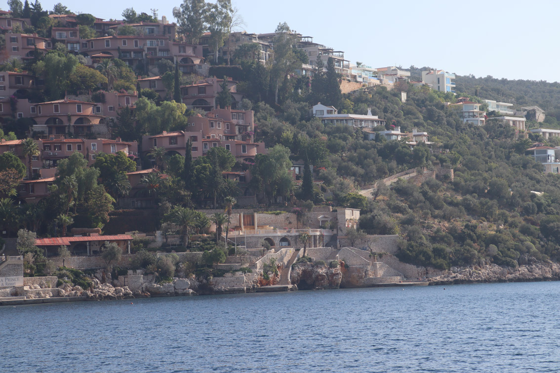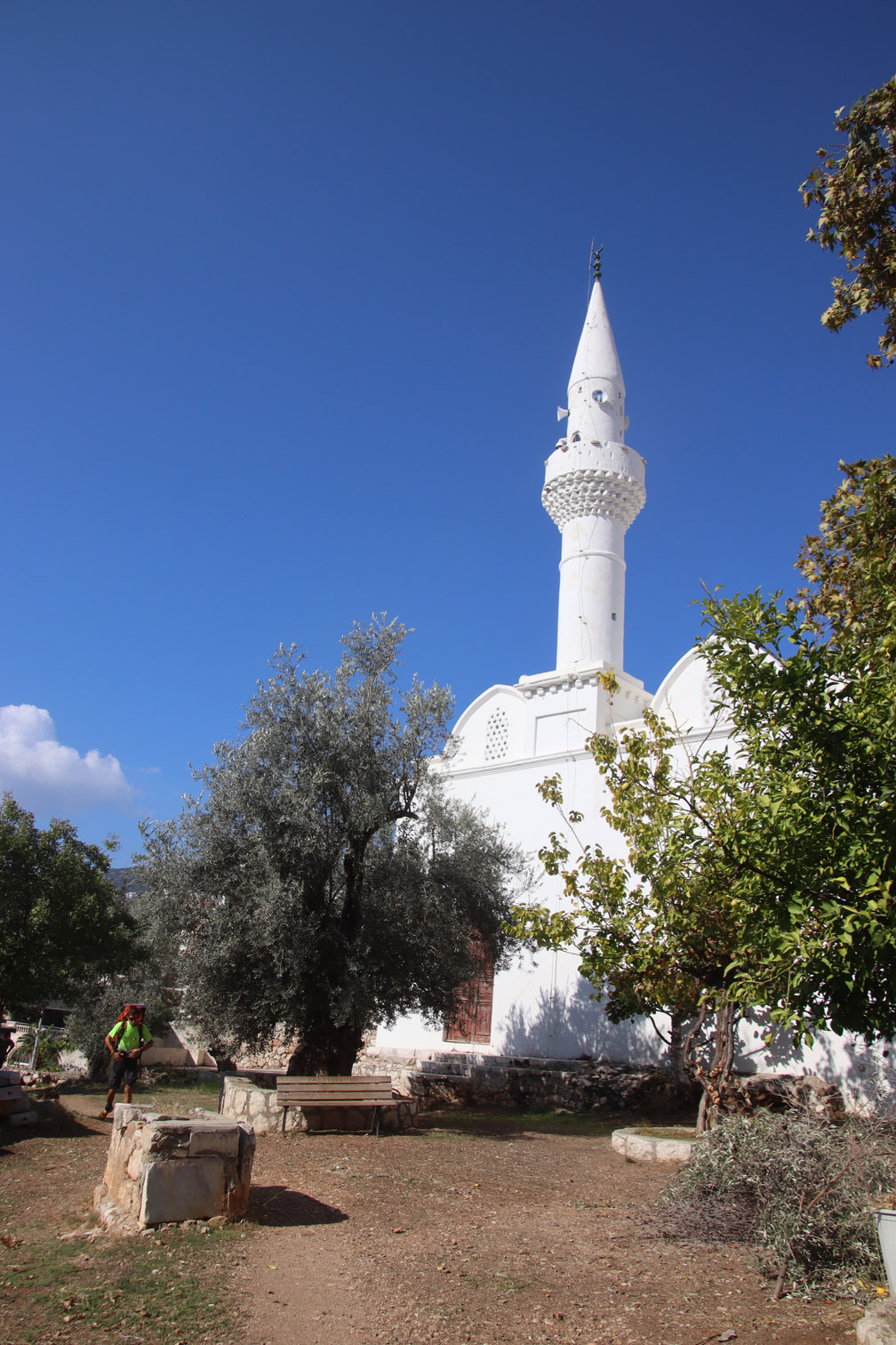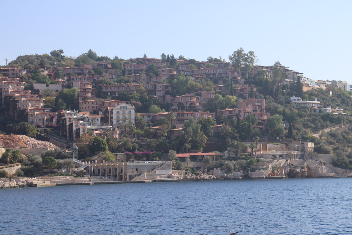 Nous ancrons dans la grande baie d’Yeşilköy (on a pas encore pu déterminer comment doit se prononcer le S cédille) après une après midi relax et une bonne nuit (encore une) nous traversons la baie pour nous rendre au village de Kalkan, petite station balnéaire nichée à flanc de côteau. Nous ancrons devant la plage juste à côté de l’entrée du port. Les environs sont un peu défigurés par des lotissements de vacances sans cachet mais la vieille ville est jolie avec ses petites maisons au murs blanchis à la chaux et sa vieille mosquée. Plus haut il y a un super marché Carrefour mais il est petit et pas très bien achalandé en produits d’alimentation par contre il dispose d’un rayon alcools avec un très bon choix de vins Turcs: si si çà existe! Ils ne sont pas mauvais du tout et à des prix raisonnables.
