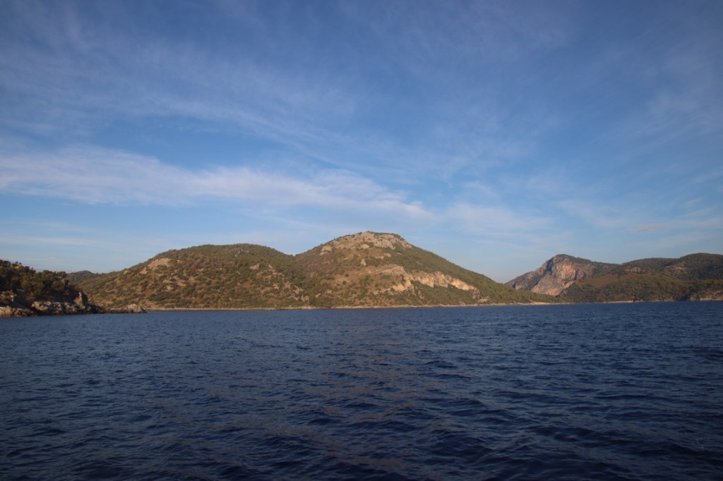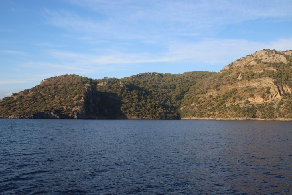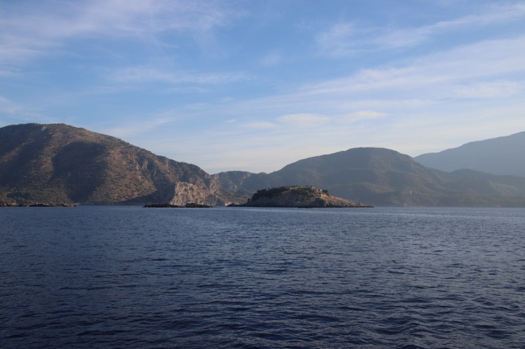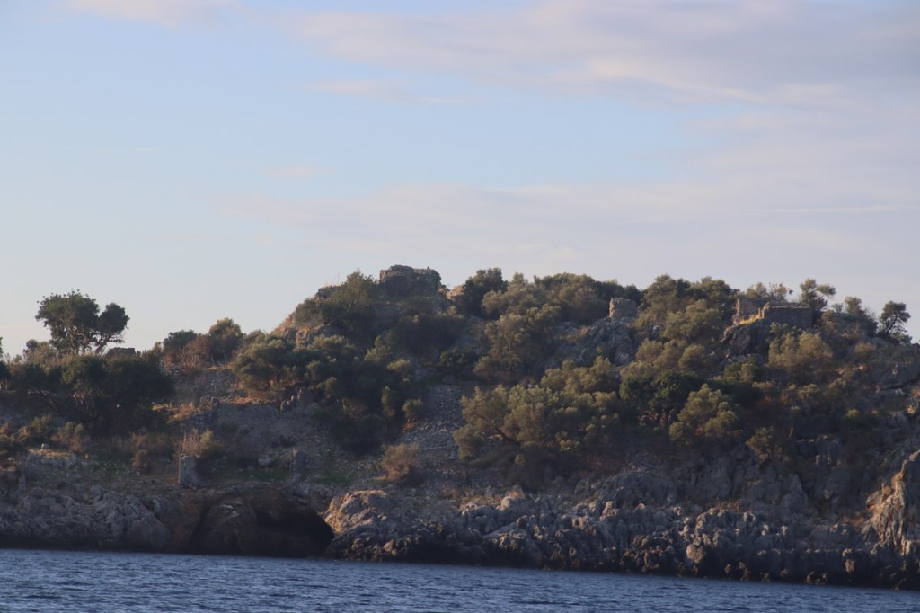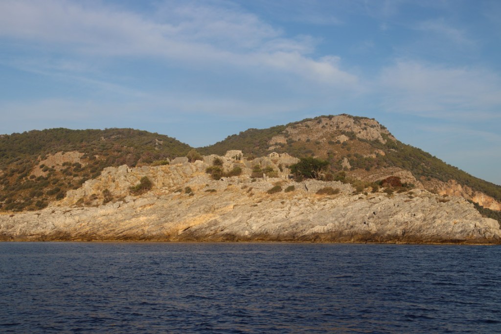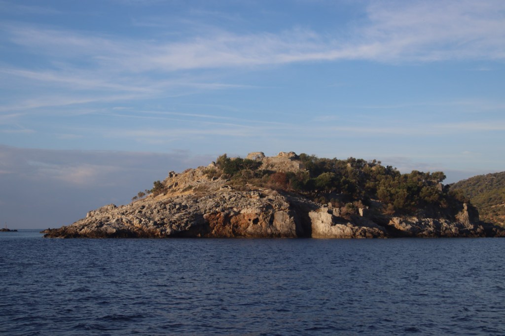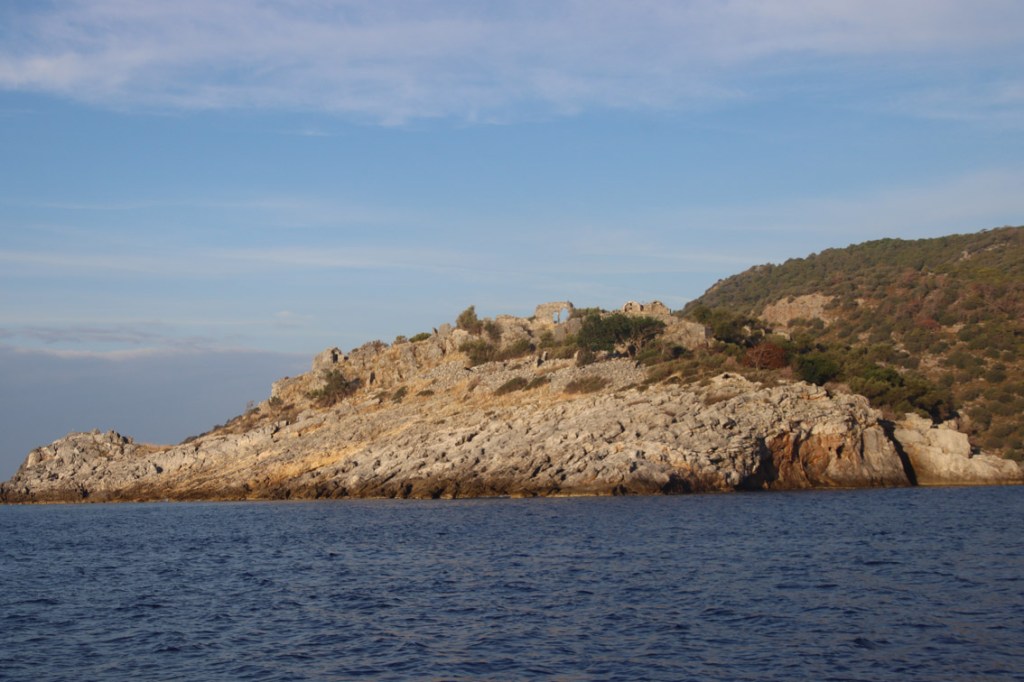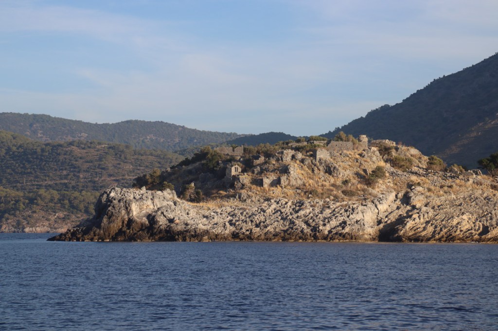 Jeudi 17/11/2022, en tout début de matinée, nous quittons donc les fantômes de St Nicolas et de ces moines. On se rend compte au passage qu’ils étaient d’ailleurs bien défendus (ou souvent attaqués). Les ruines d’une église et des restes de maisons et peut-être de fortifications sont encore bien visibles sur l’île de Karacaoren à la sortie de la baie. D’après des archéologues une cheminée spéciale, dont les restes sont encore visible sur l’île, servait à avertir le gros de la communauté de Gemiler que des navires d’apparence hostile approchaient.