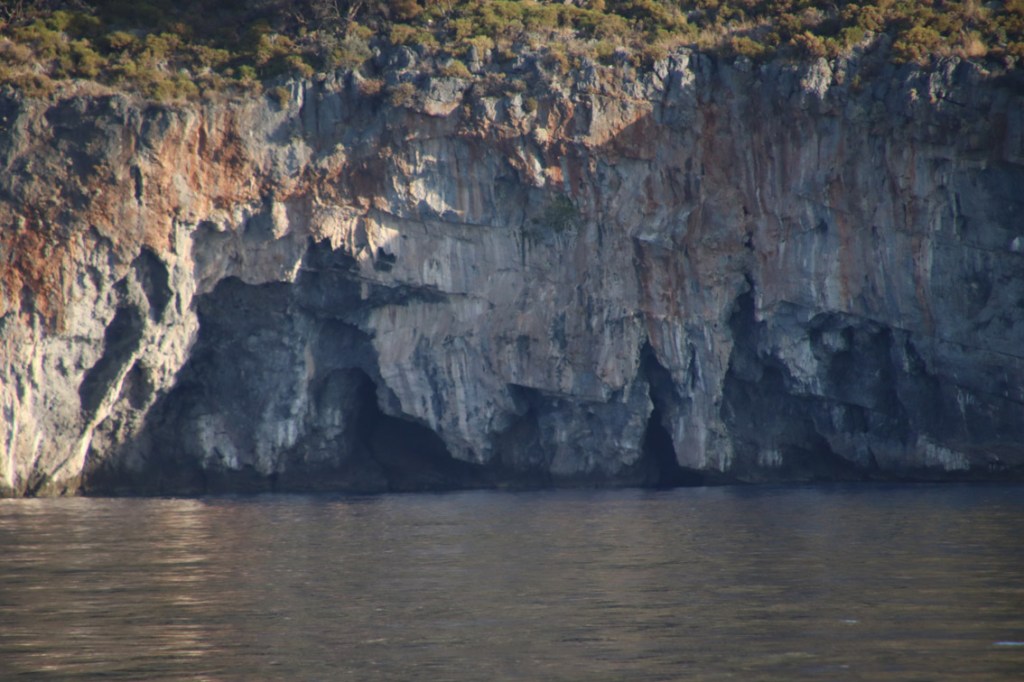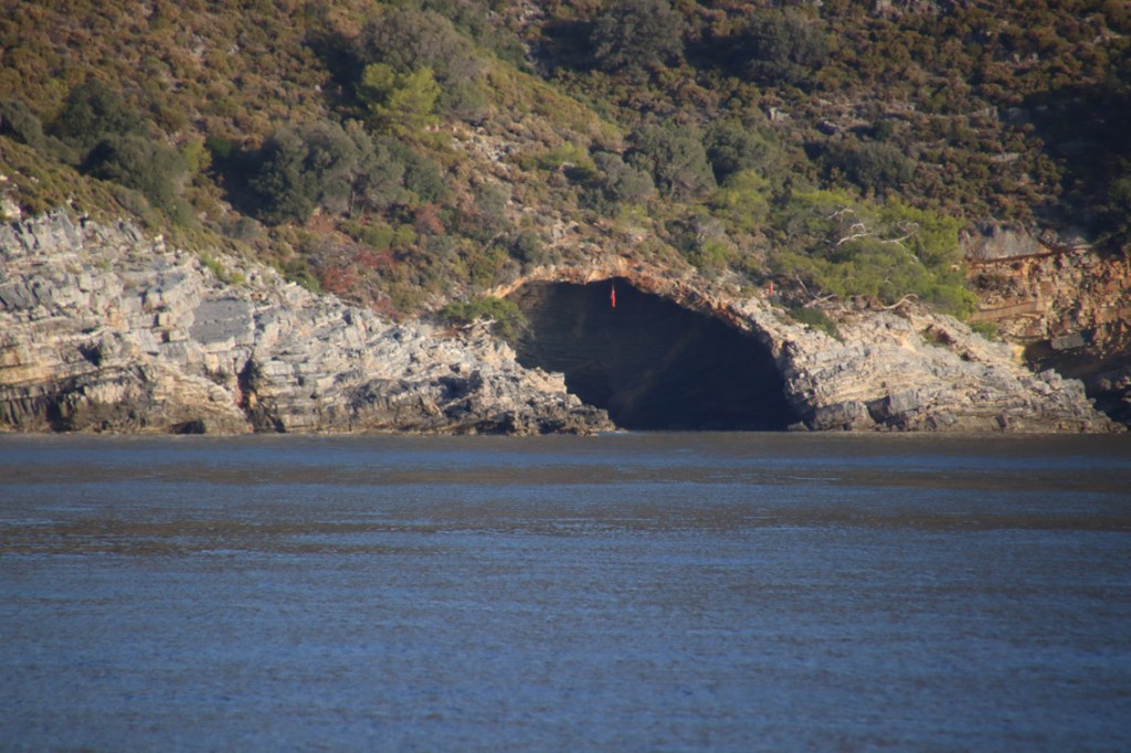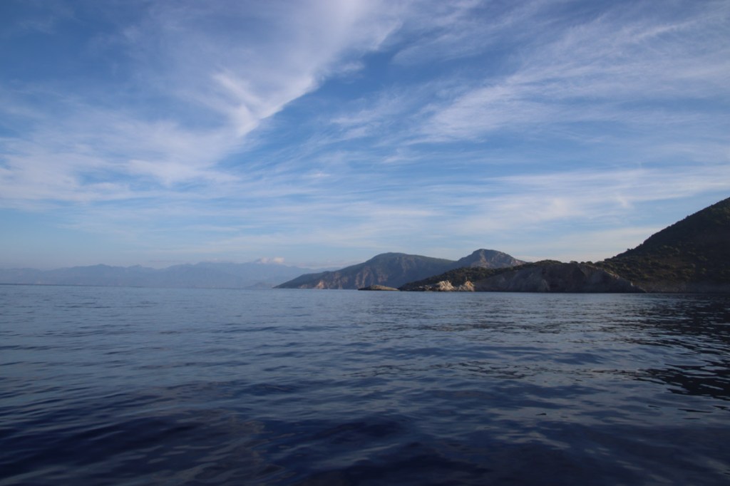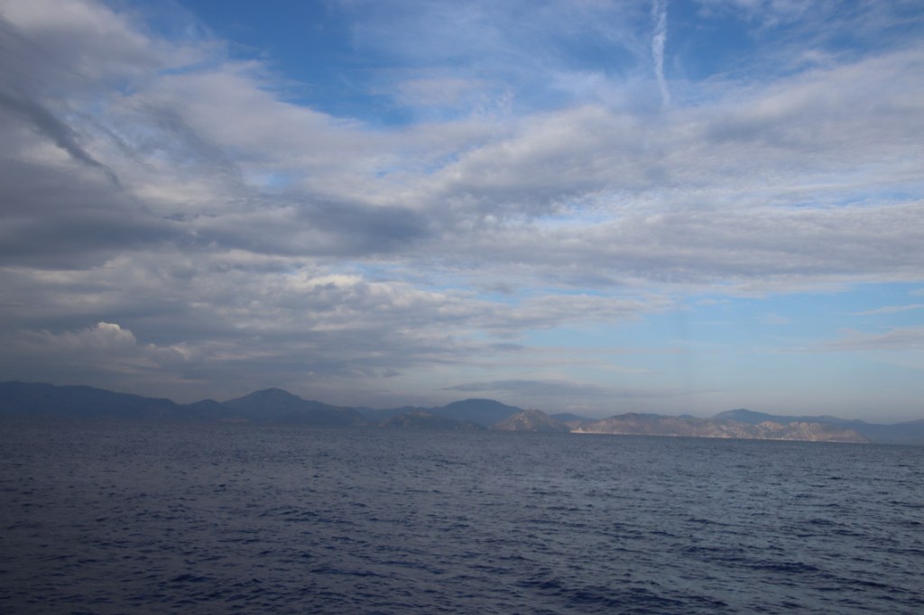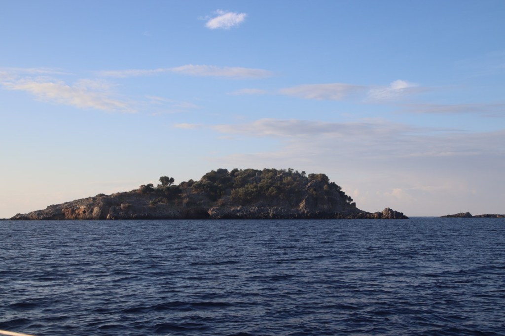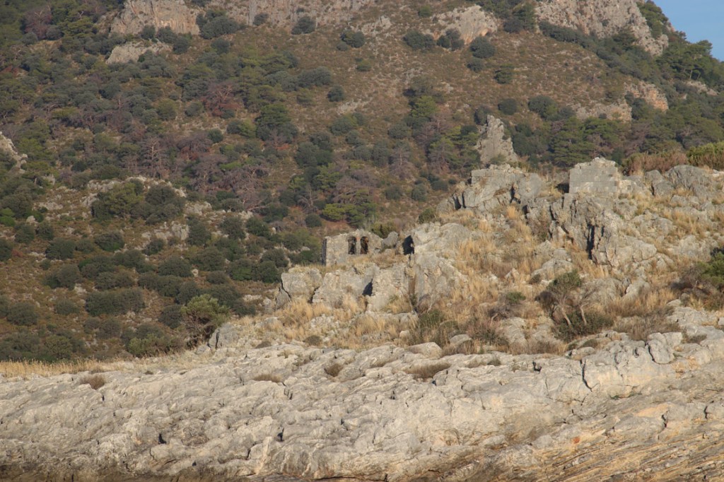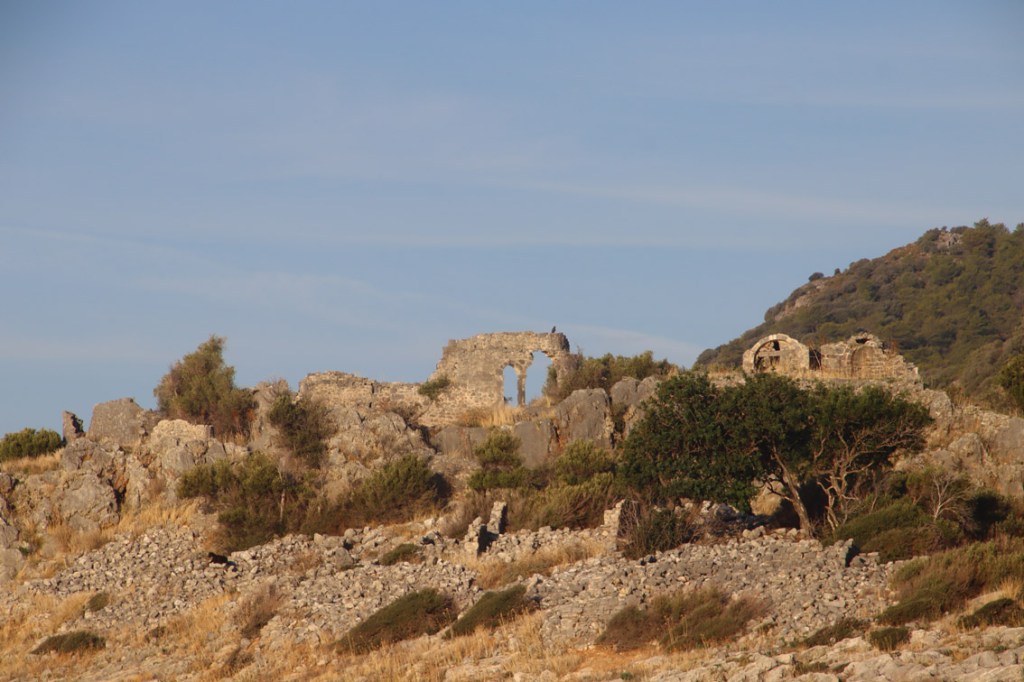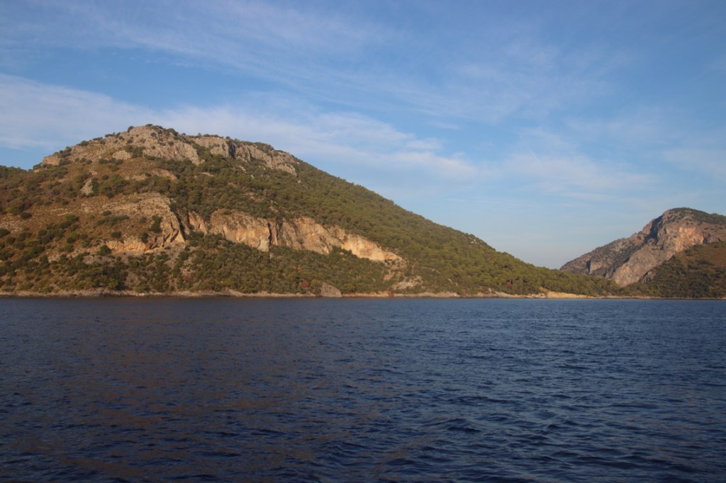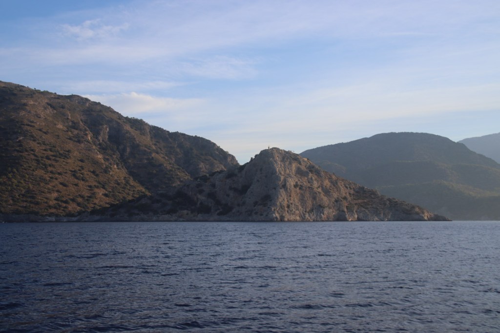 Jeudi 17/11/2022, en tout début de matinée, nous quittons donc les fantômes de St Nicolas et de ces moines. On se rend compte au passage qu’ils étaient d’ailleurs bien défendus (ou souvent attaqués). Les ruines d’une église et des restes de maisons et peut-être de fortifications sont encore bien visibles sur l’île de Karacaoren à la sortie de la baie. D’après des archéologues une cheminée spéciale, dont les restes sont encore visible sur l’île, servait à avertir le gros de la communauté de Gemiler que des navires d’apparence hostile approchaient.