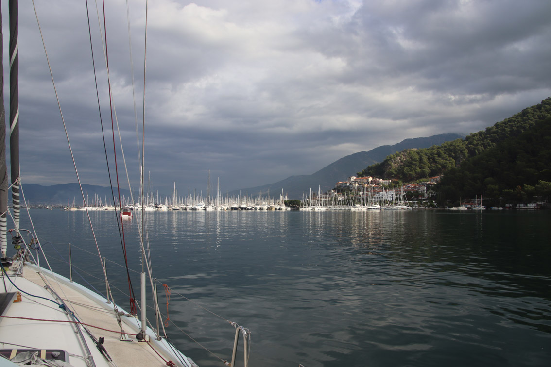 Du très mauvais temps est annoncé pour la fin de la semaine, le week end et le début de semaine prochaine avec vent fort, orages et pluie. Gemiler est bien protégé mais on risquerait d’y être bloqué un moment. On recherche donc un endroit protégé plus à l’Ouest. Pourquoi pas une marina, de toute façon il faut qu’on aille vidanger notre cuve d’eaux noires avant lundi sous peine d’une amende de 1700 EUR et çà nous permettrait de laisser le bateau quelques jours pour explorer un peux l’intérieur du pays. Mais à Fithiye, la marina est archi pleine et n’accepte plus de visiteurs. Il y a encore de la place à Göcek mais à 129 EUR/nuit non merci. Fithiye accepte que l’on vienne à la station service vider la cuve. La baie semble propice au mouillage on pourra y rester au moins pour la nuit çà ne coûte rien.