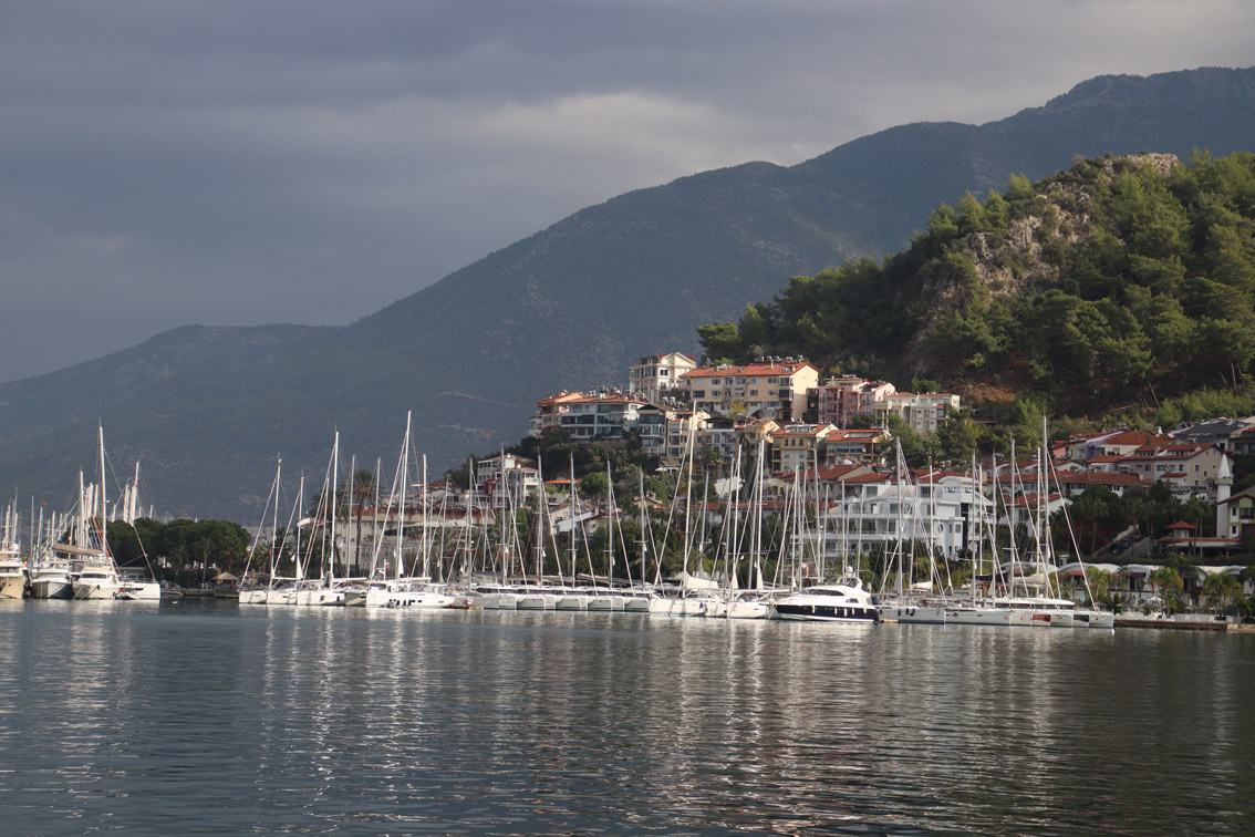 Fethiye est une ville moyenne d’environ 85 000 habitants (hors touristes). En pleine saison le coin doit regorger de touristes si l’on juge d’après les dizaines de caïques et gulet (goélettes locales traditionnelles) alignés le long des quais et de bateaux de location aux pontons de la marina.