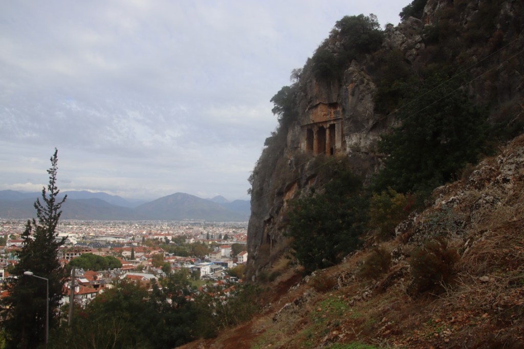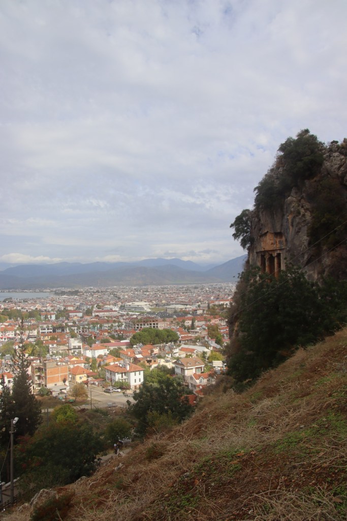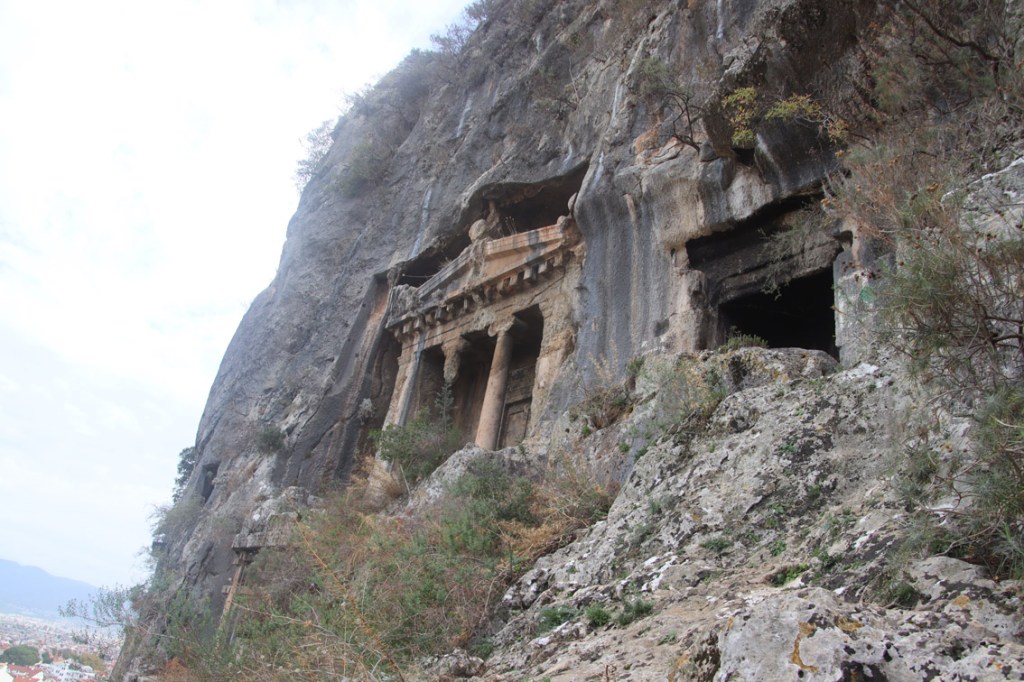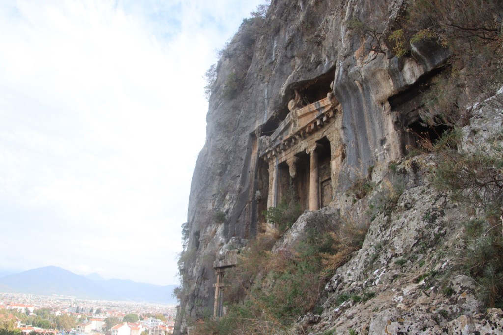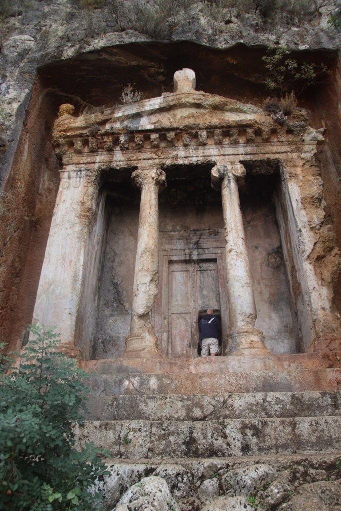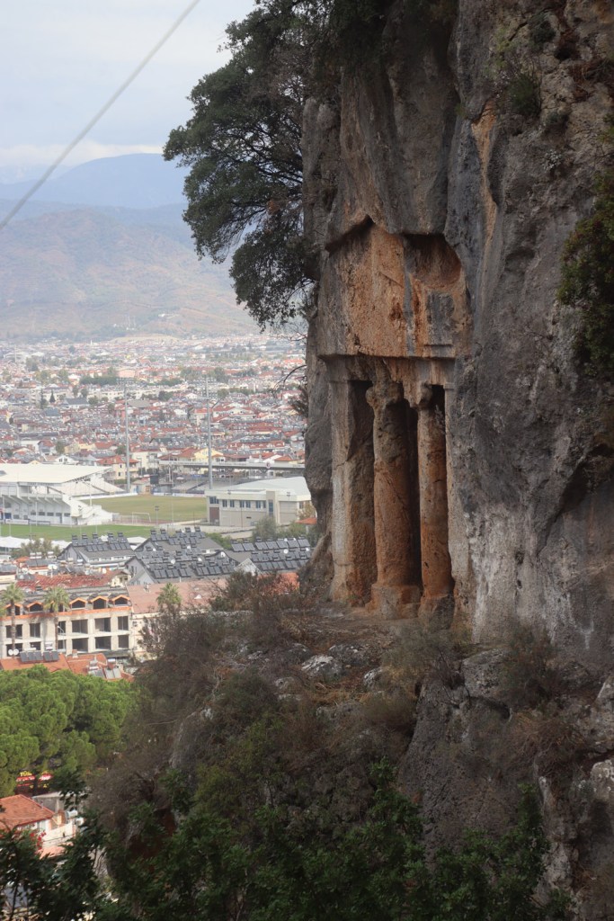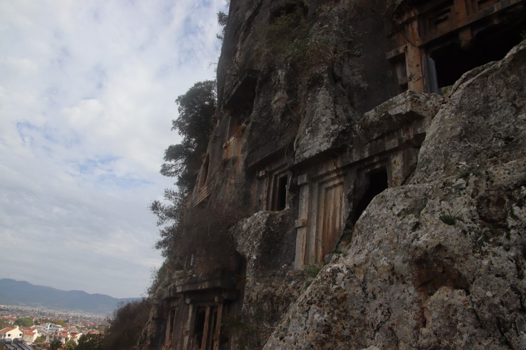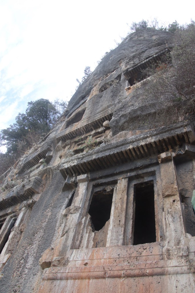 Une nécropole Lycienne du 5ème siècle av.JC surplombe la ville. Les tombeaux aux airs de temples grecs sont creusés et sculptés à même la falaise. Les façade sont tellement impressionnantes qu’on s’attend aussi à quelque chose de grandiose à l’intérieur, mais non, il y juste une petite cavité peu profonde avec trois banquettes taillées à même le roc. Le manque de confort est largement compensé par la vue du moins tant que la tombe n’était pas scellées. Les défunts inhumés là étaient très certainement des notables ou des princes et devaient surement payer fort cher pour bénéficier d’une telle villégiature! .