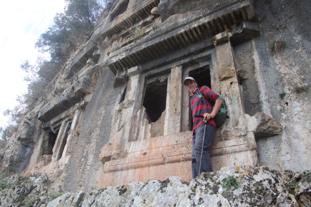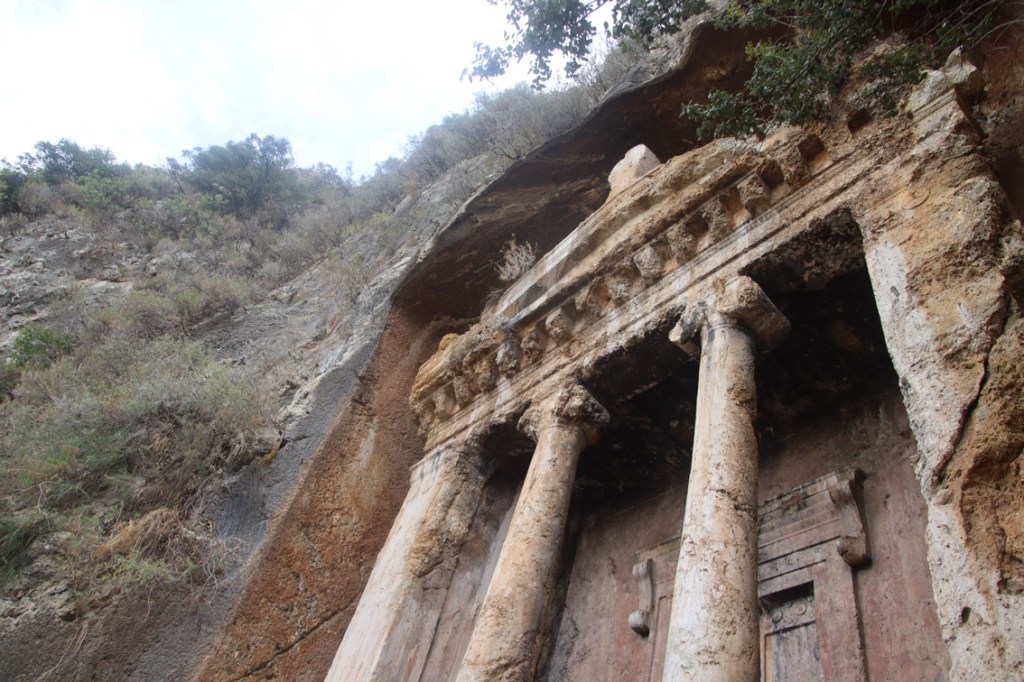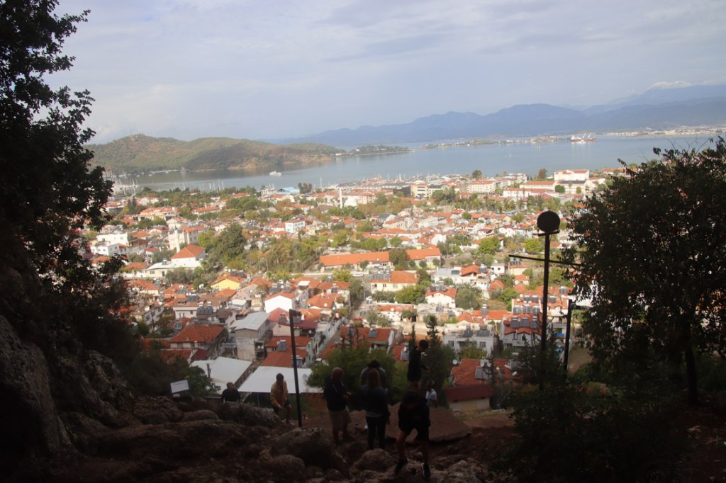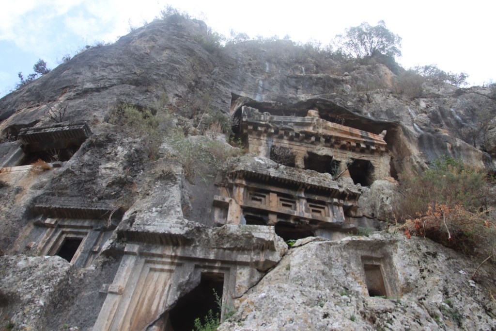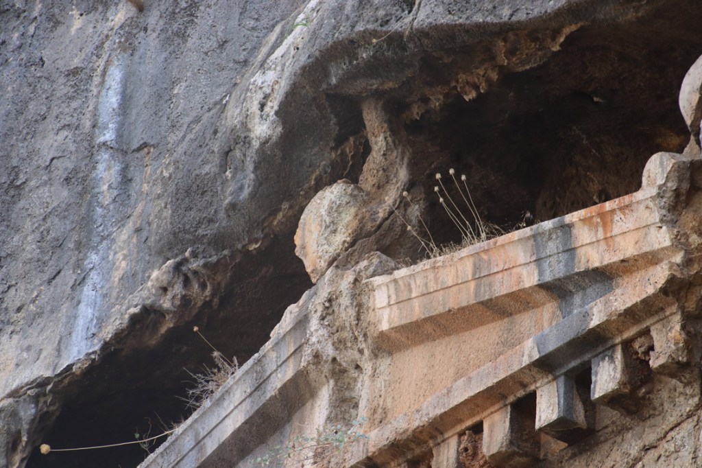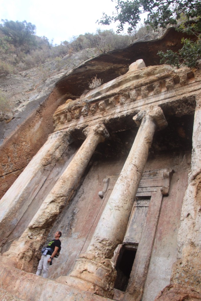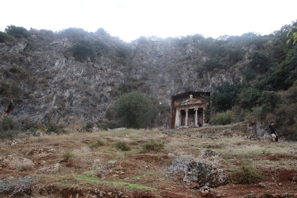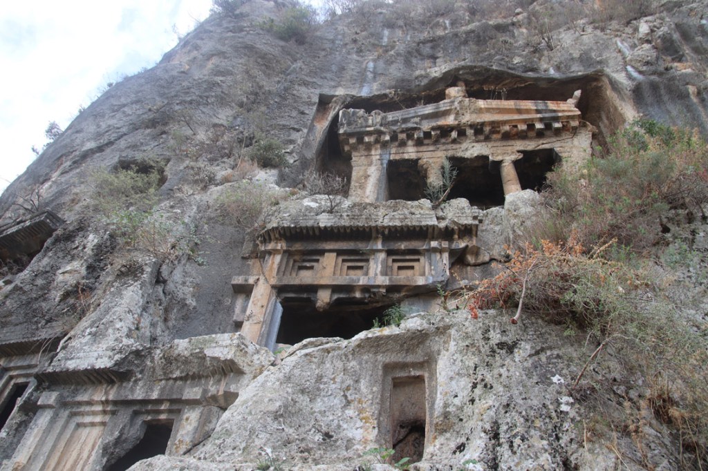 Une nécropole Lycienne du 5ème siècle av.JC surplombe la ville. Les tombeaux aux airs de temples grecs sont creusés et sculptés à même la falaise. Les façade sont tellement impressionnantes qu’on s’attend aussi à quelque chose de grandiose à l’intérieur, mais non, il y juste une petite cavité peu profonde avec trois banquettes taillées à même le roc. Le manque de confort est largement compensé par la vue du moins tant que la tombe n’était pas scellées. Les défunts inhumés là étaient très certainement des notables ou des princes et devaient surement payer fort cher pour bénéficier d’une telle villégiature! .