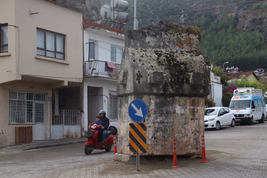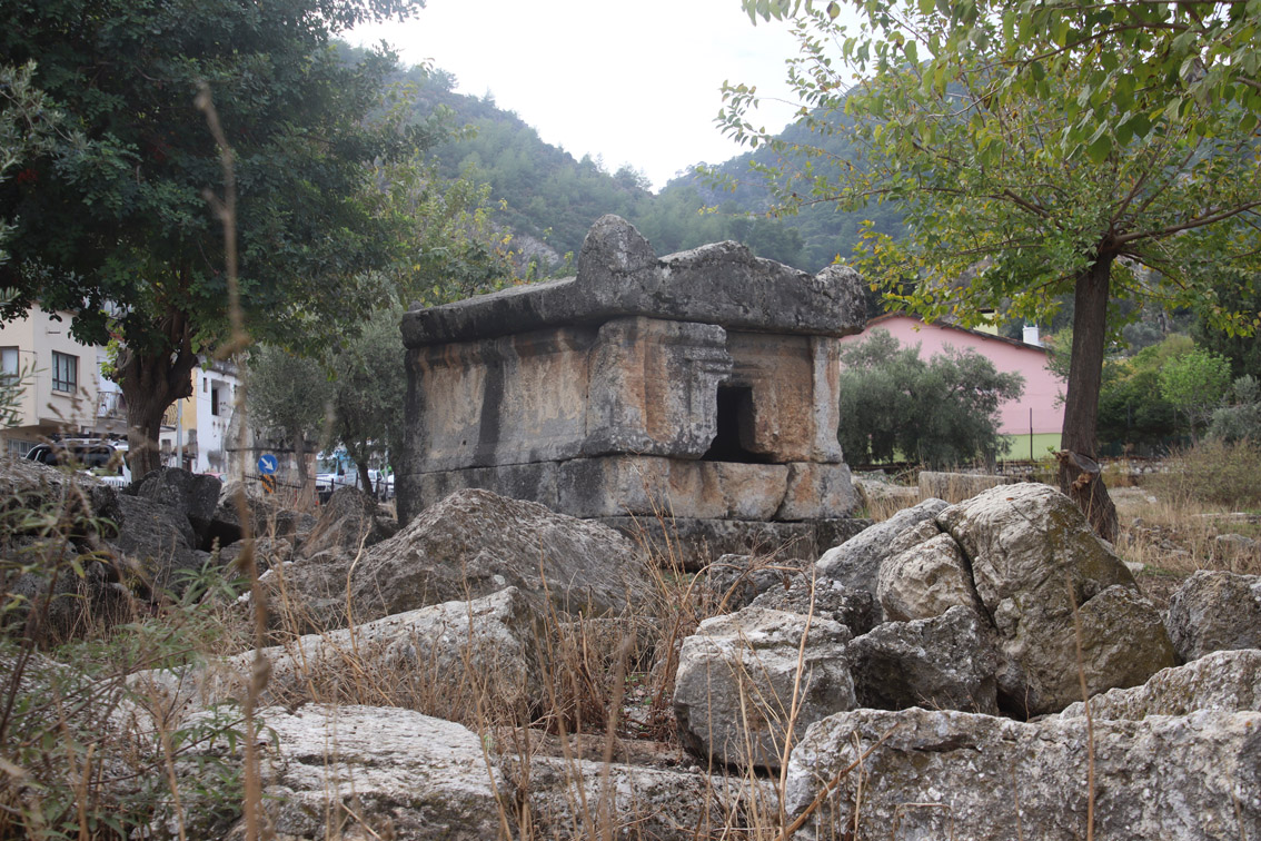 Dans la ville on trouve aussi plusieurs sarcophage de pierre Lyciens de la même époque. contrairement au grecs, les lycien préféraient garder leur morts parmi les vivants. Il y avait donc des sarcophages disséminés un peu partout dans la ville comme celui-ci au beau milieu de la rue (à moins qu’il ne soit tombé du ciel depuis…)