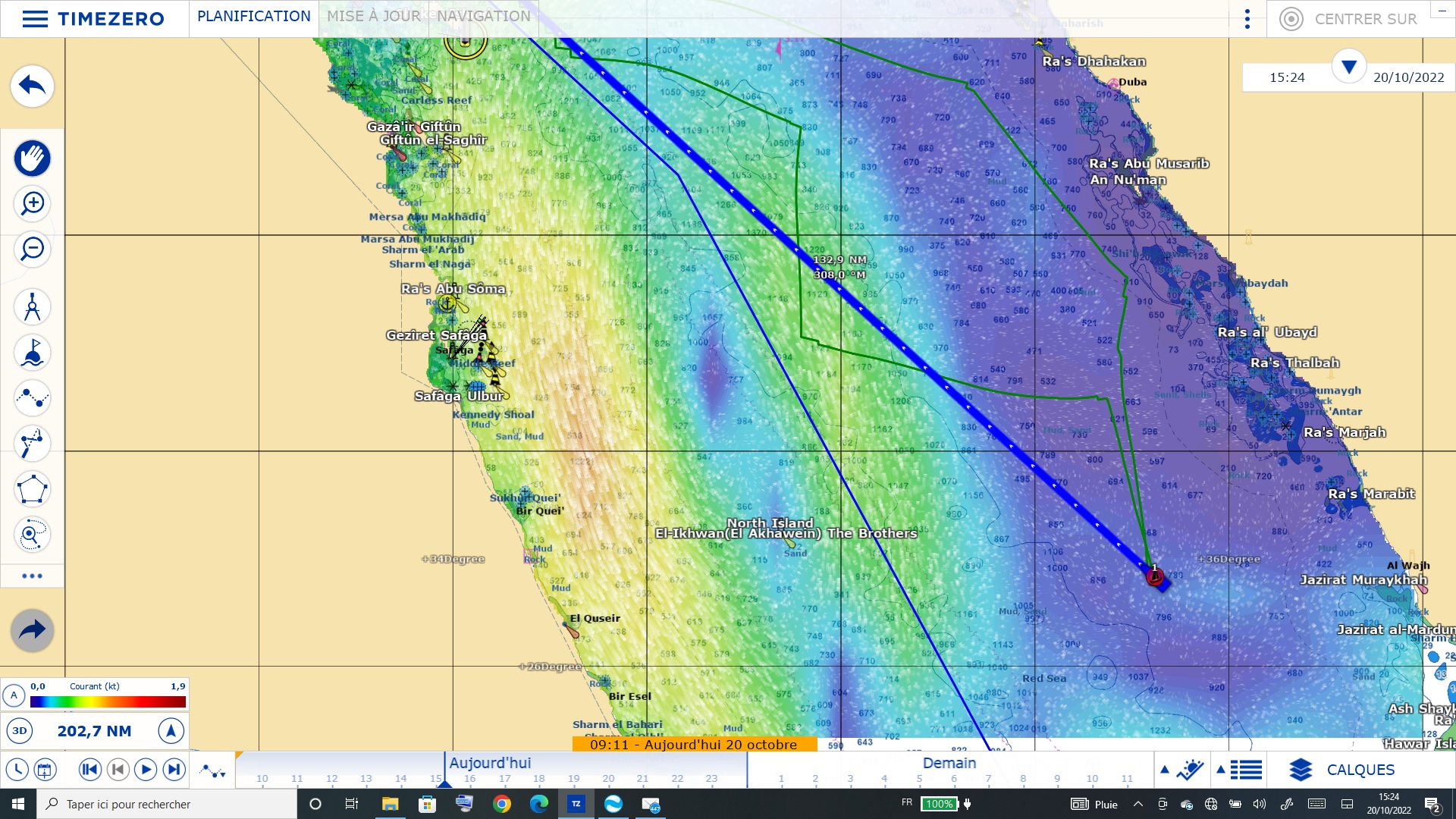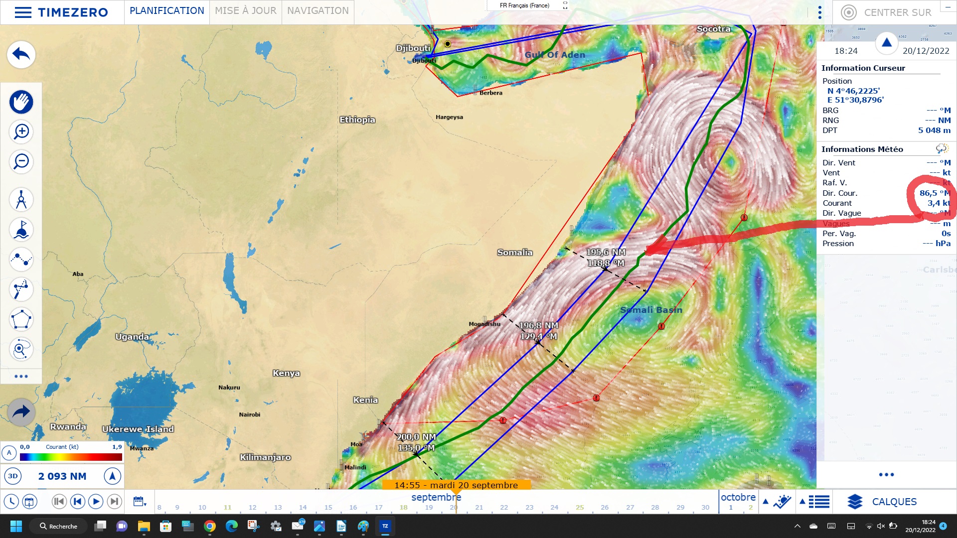 Nous avions planifié de quitter la Tanzanie vers le 20 septembre pour pouvoir contourner Socotra durant les premiers jours d’octobre. Et c’est exactement ce jour là que les GRIBS GFS à 16 jours (pour ce qu’ils valent) nous donnaient le meilleur créneau. Pendant tout le trajet, de Tanga à Socotra les prévisions GFS ce sont révélées exactes, nous n’avons jamais eu plus de 20 nœuds et toujours un courant favorable ou dans le pire des cas neutres.