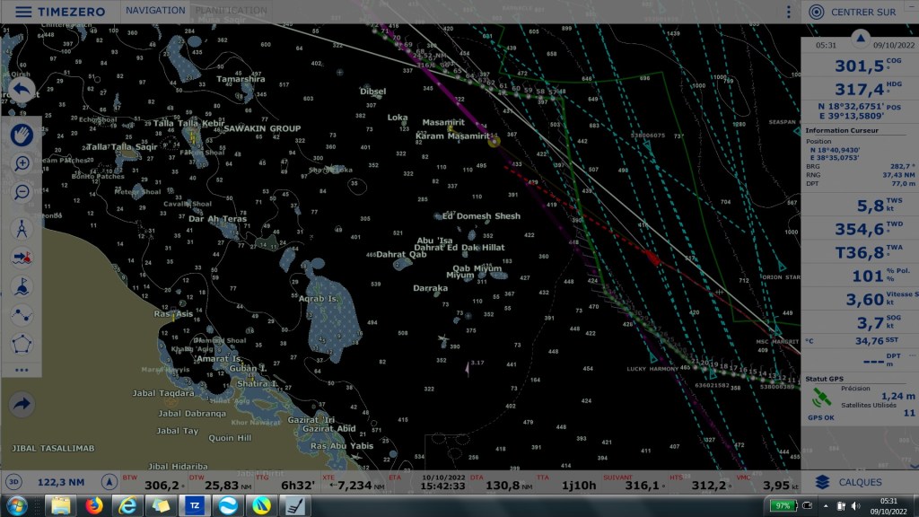 Dans le détroit de Bab el Mandeb et le sud de la mer Rouge, nous avons eu un vent faible à modéré tournant progressivement du secteur Sud au secteur Nord avant d’atteindre Suakin. Le modèle GFS était extrêmement précis dans cette partie.