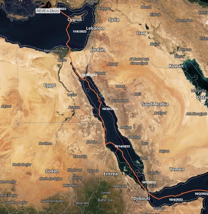 Octobre 2022 s’est avéré un bon choix pour remonter la mer Rouge. A part la température très élevée (air 38°C le jour, toujours >30°C la nuit, mer : 36°C) nous n’avons pas souffert. Nous avons eu presque toujours assez de vent pour naviguer à la voile et jamais plus de 20 nœuds établis (25 en rafale). Au dessus de cette force, le vent lève une mer très courte rendant le près très pénible. Le bateau tape et a beaucoup de mal à atteindre une vitesse décente à un angle de vent raisonnable, mais pour nous, au moteur, çà aurait été pire et il aurait fallu attendre les périodes de calme pour progresser. Nous n’avons pas perdu de temps ni eu a utiliser beaucoup le moteur.