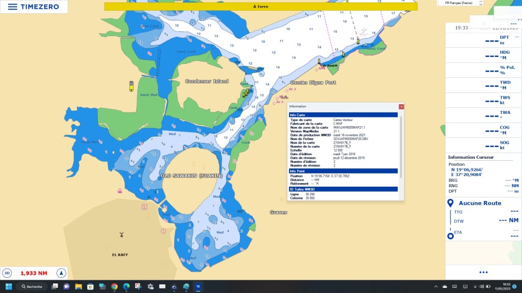 Nous utilisons Maxsea Time Zero 4.1 avec la dernière mise à jour de la cartographie C.MAP (11/2021).