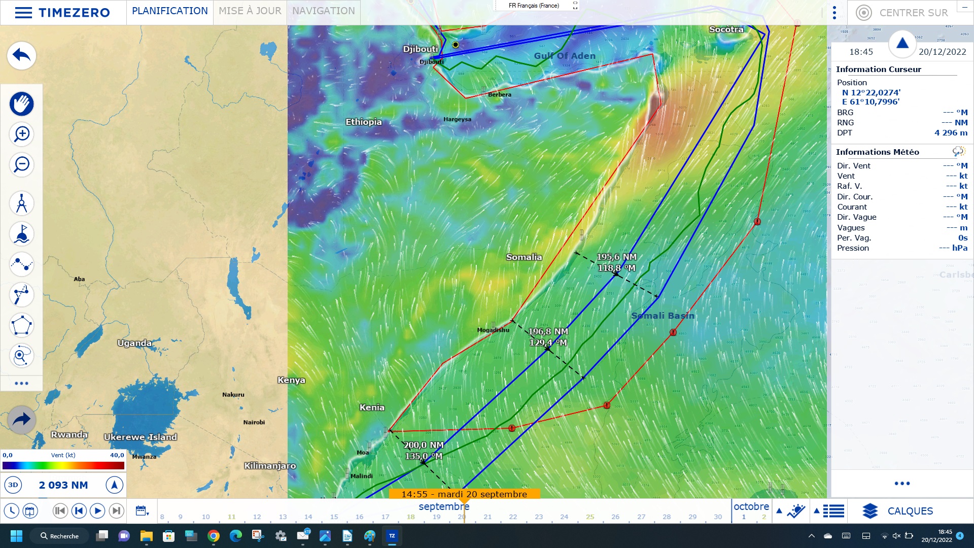 La HRA (tracé rouge sur la carte) s’étendant jusqu’à près de 300 milles de la côte Somalienne, il n’est pas envisageable de l’éviter sauf à se battre contre le courant contraire dans des vents très aléatoires. Pas question non plus de s’aventurer trop près de la côte, les pirates somaliens semblent un peu calmés mais il ne faut pas tenter le diable. Nous nous sommes donc fixé une zone intermédiaire pour notre navigation allant de 100 à 200 milles de la côte (lignes bleues sur la carte). Il est intéressant de constater que notre routage initial (ligne verte sur la carte) passait pratiquement au milieu de cette zone intermédiaire. C’est aussi à peu de chose près la route que nous avons suivi.