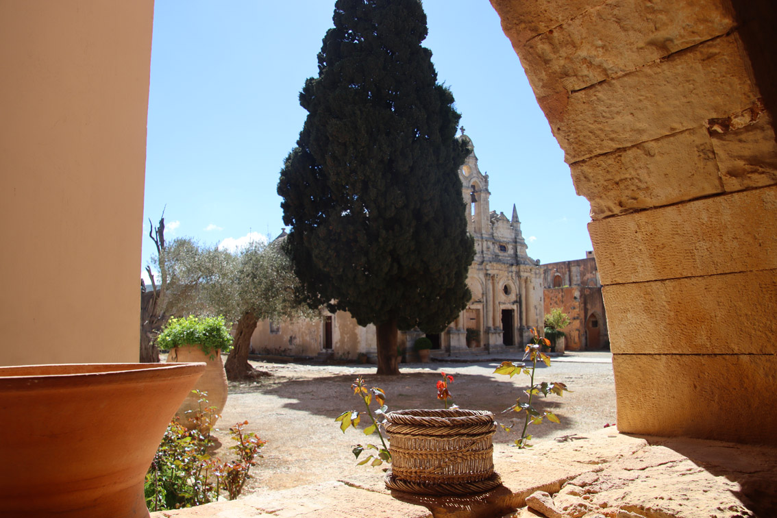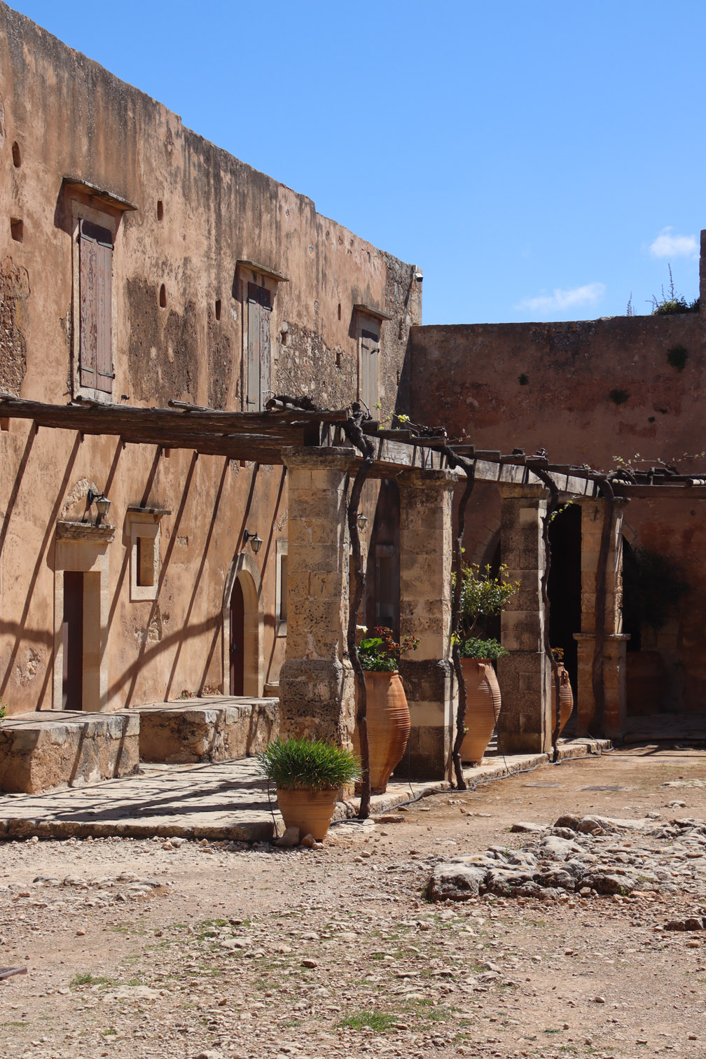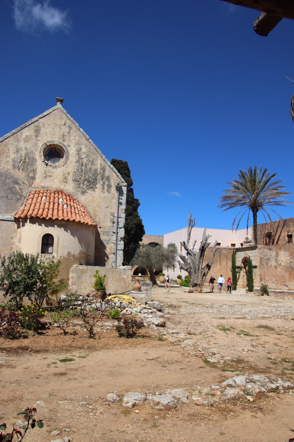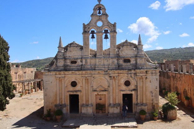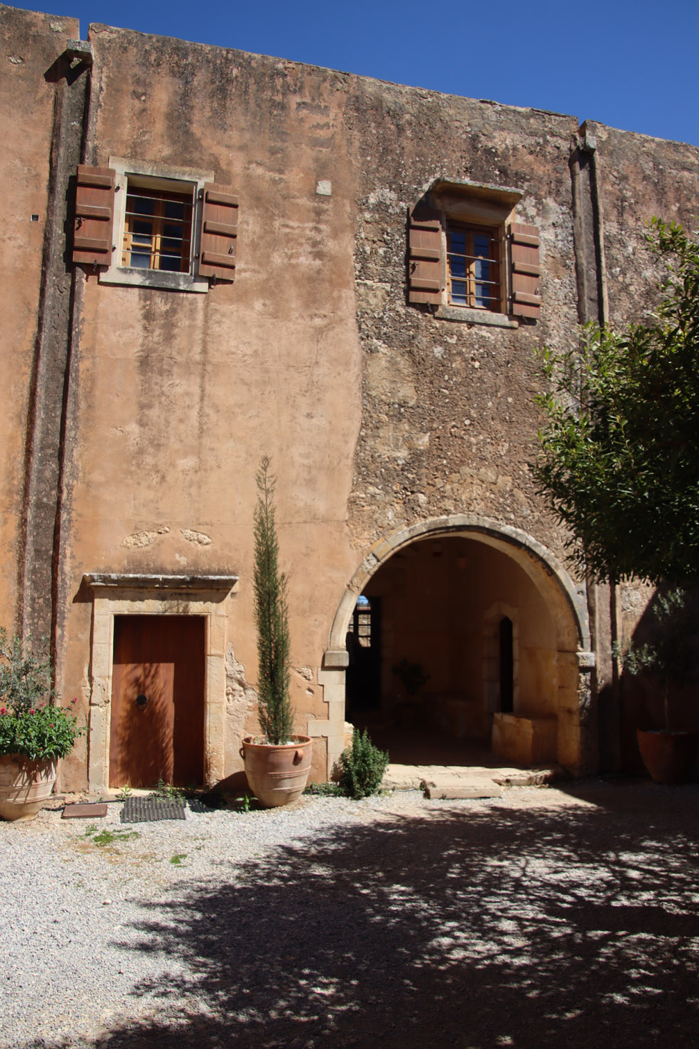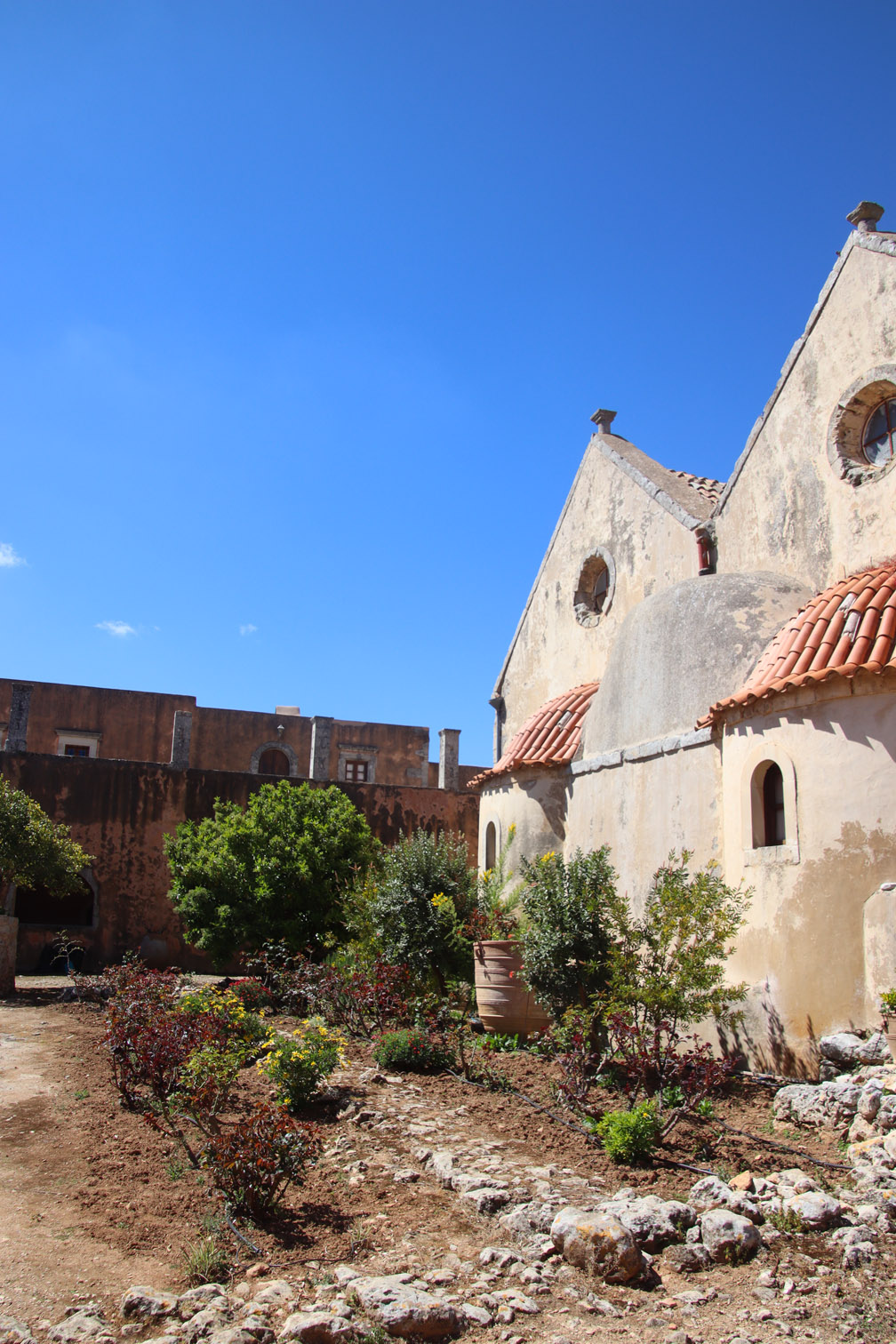 Au détour d’un virage, le monastère apparaît, c’est un édifice carré, assez massif de l’extérieur et de l’intérieur, l’ensemble fait penser un peu au type de bâtiments religieux que l’on pourrait trouver en Amérique du Sud (Mexique?) avec les clochers de son église d’un style proche du baroque Espagnol et ses enduits de teinte ocre rouge des murs. Mais non, nous sommes bien en Crète et le monastère a été fondé au 5éme ou 6ème siècle par les byzantins. Il a bien entendu subit depuis de nombreuses restaurations et modifications dont la façade de l’église qui est due à un architecte Italien du 16ème siècle.