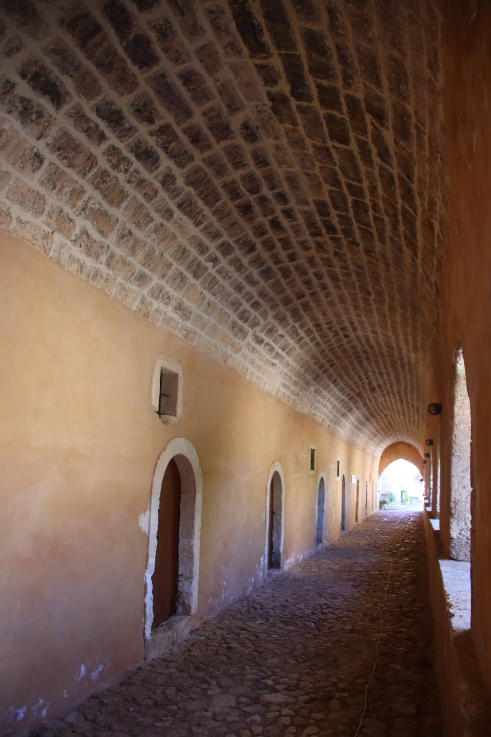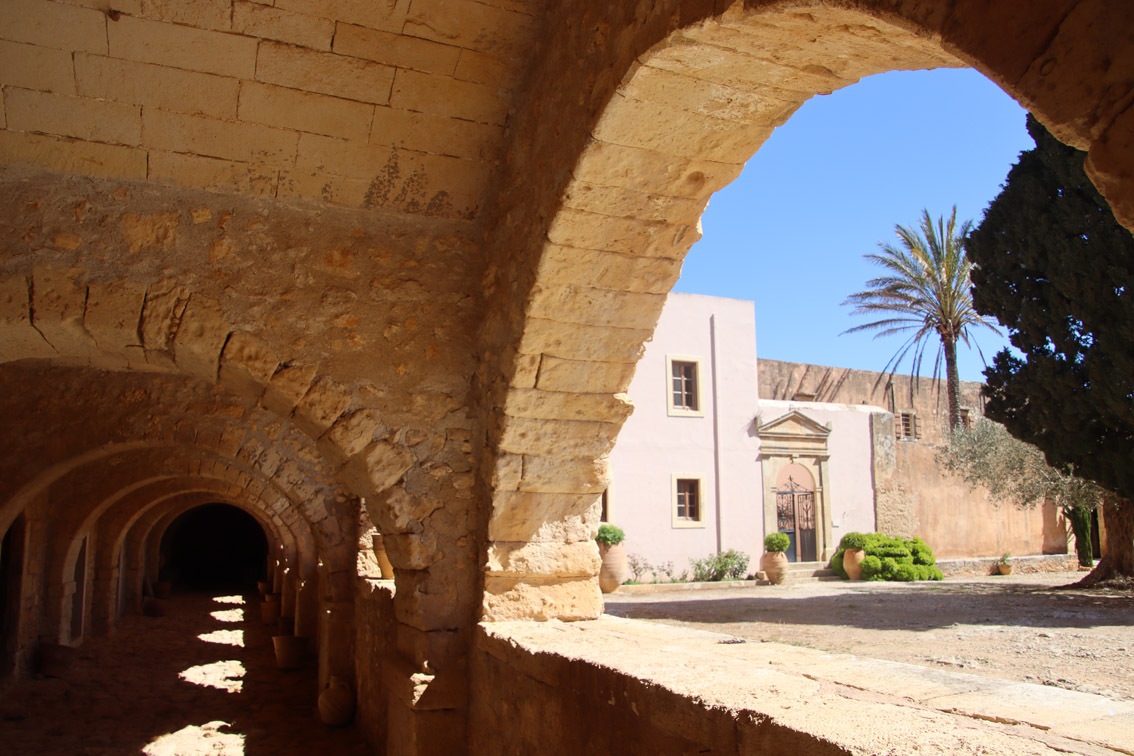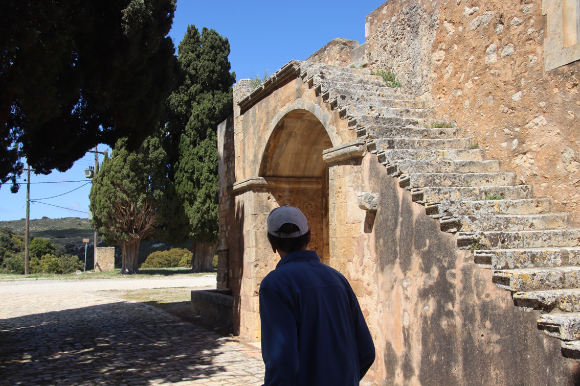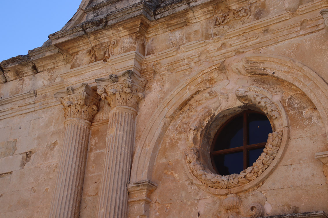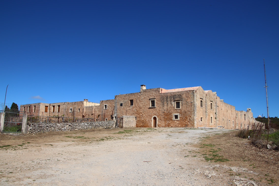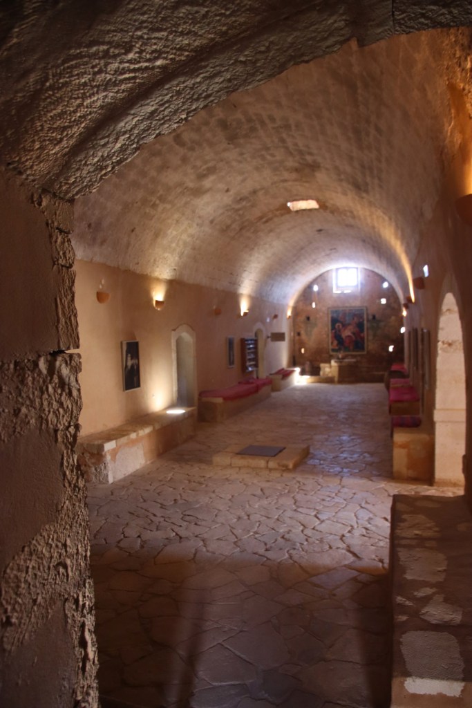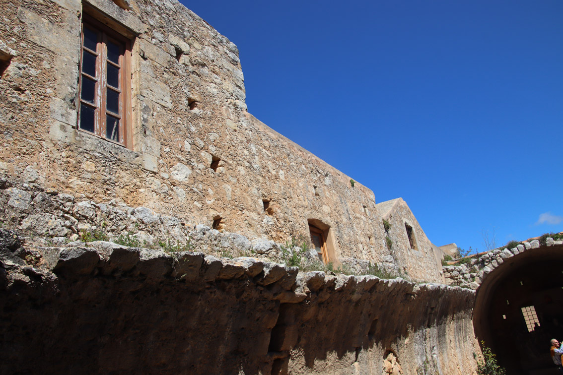 Au détour d’un virage, le monastère apparaît, c’est un édifice carré, assez massif de l’extérieur et de l’intérieur, l’ensemble fait penser un peu au type de bâtiments religieux que l’on pourrait trouver en Amérique du Sud (Mexique?) avec les clochers de son église d’un style proche du baroque Espagnol et ses enduits de teinte ocre rouge des murs. Mais non, nous sommes bien en Crète et le monastère a été fondé au 5éme ou 6ème siècle par les byzantins. Il a bien entendu subit depuis de nombreuses restaurations et modifications dont la façade de l’église qui est due à un architecte Italien du 16ème siècle.