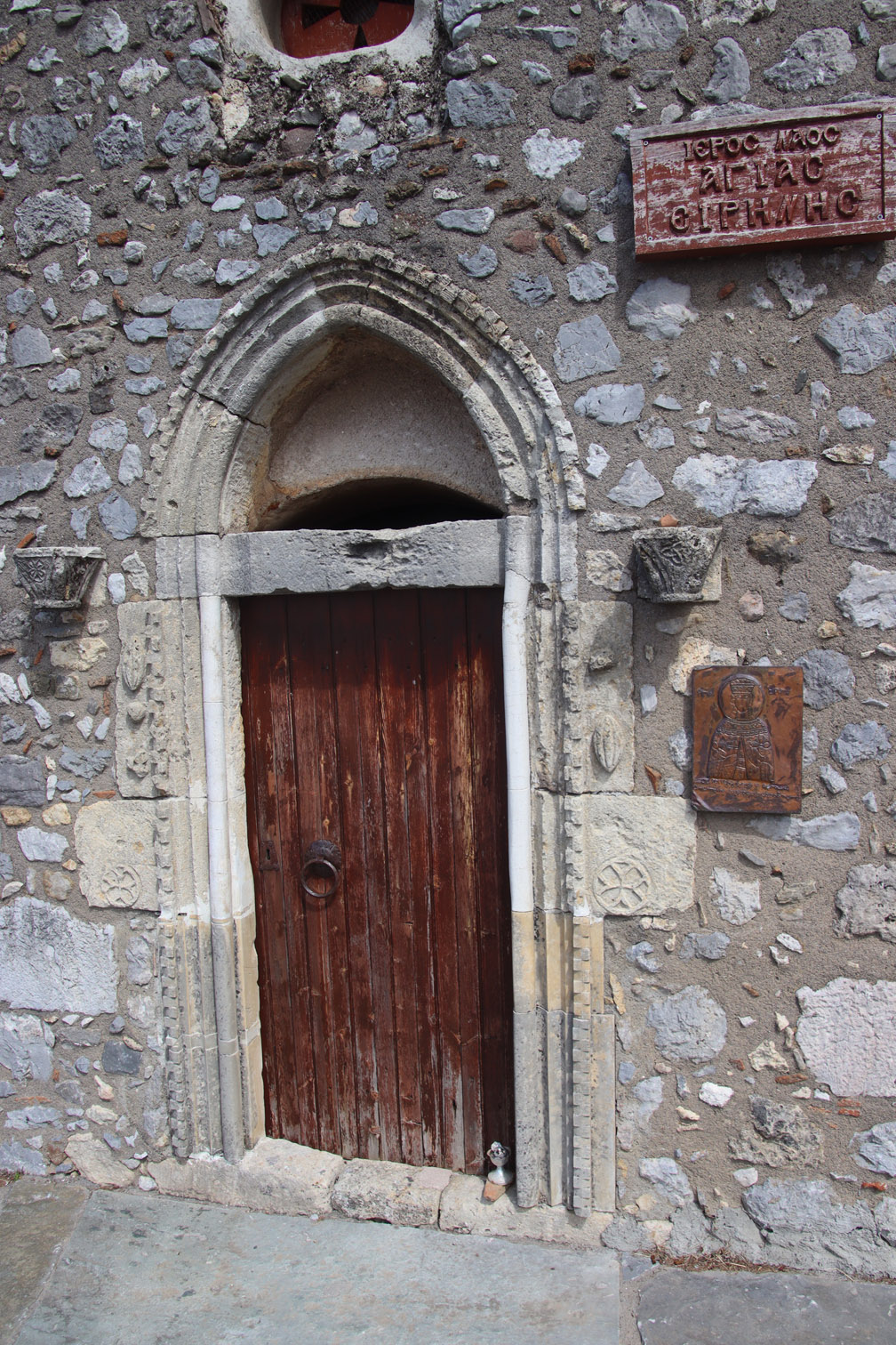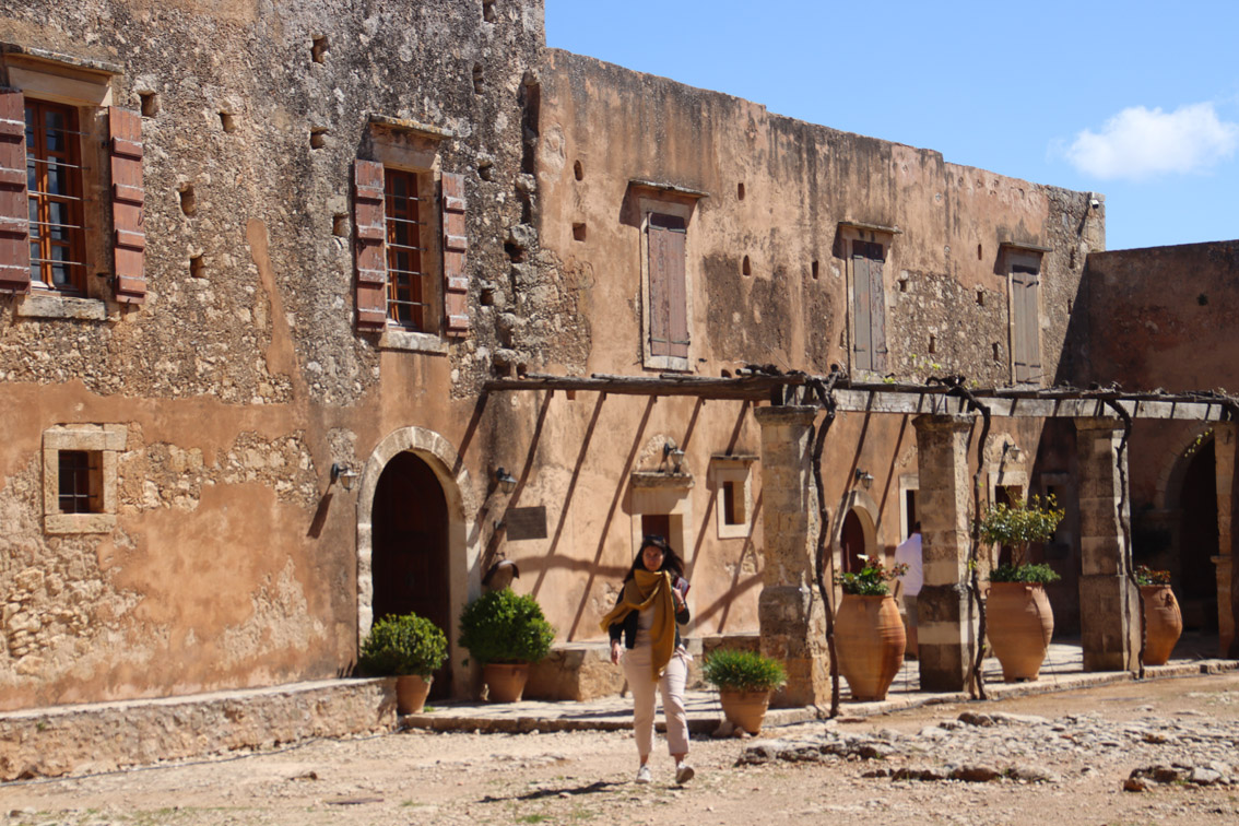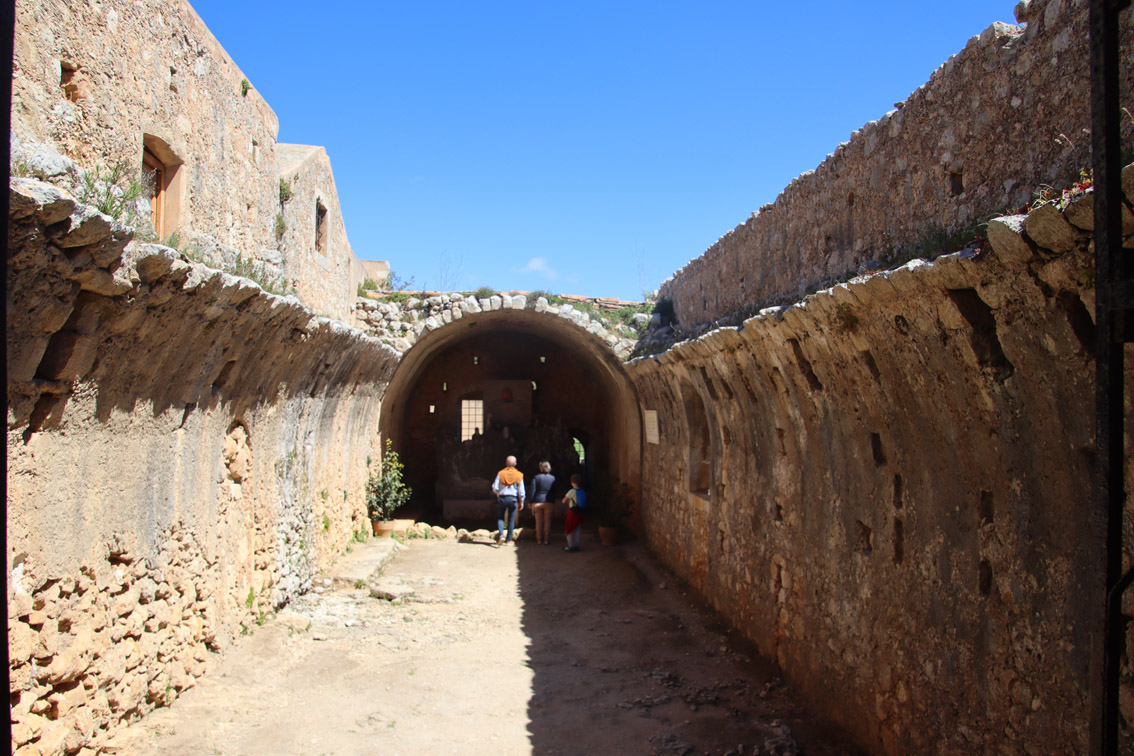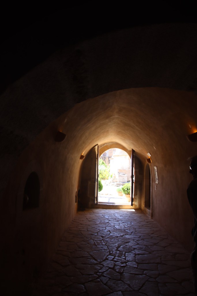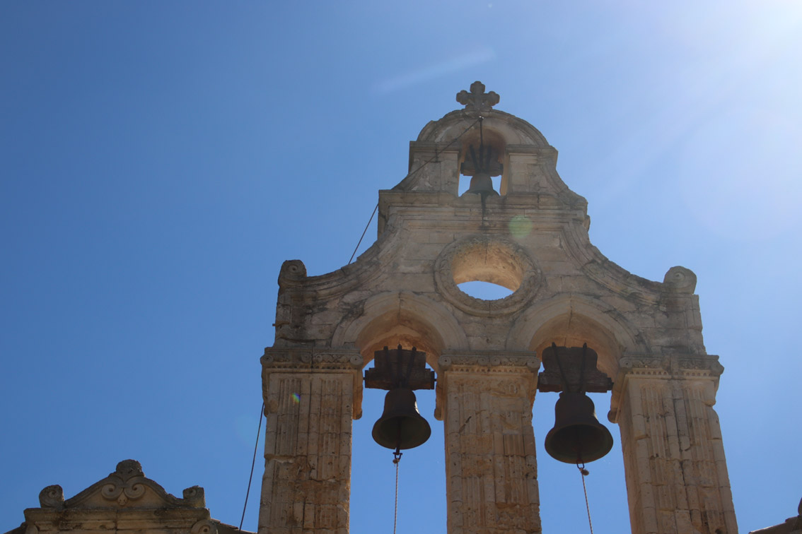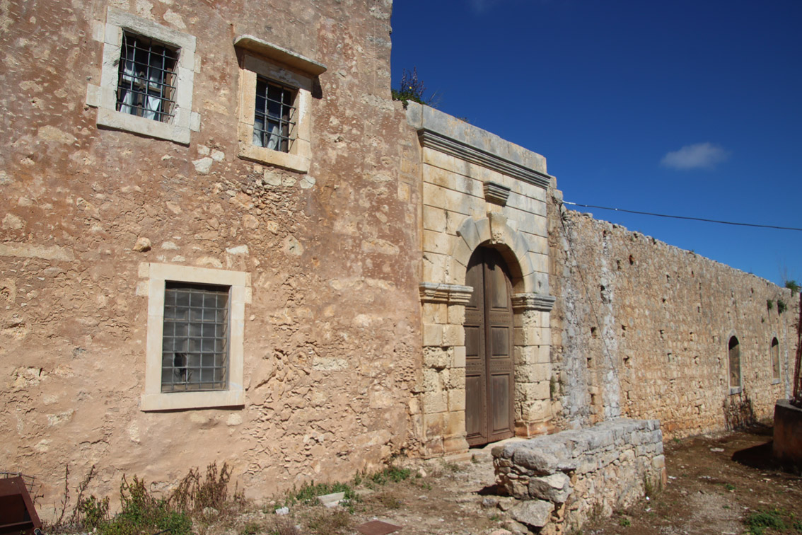 Au détour d’un virage, le monastère apparaît, c’est un édifice carré, assez massif de l’extérieur et de l’intérieur, l’ensemble fait penser un peu au type de bâtiments religieux que l’on pourrait trouver en Amérique du Sud (Mexique?) avec les clochers de son église d’un style proche du baroque Espagnol et ses enduits de teinte ocre rouge des murs. Mais non, nous sommes bien en Crète et le monastère a été fondé au 5éme ou 6ème siècle par les byzantins. Il a bien entendu subit depuis de nombreuses restaurations et modifications dont la façade de l’église qui est due à un architecte Italien du 16ème siècle.