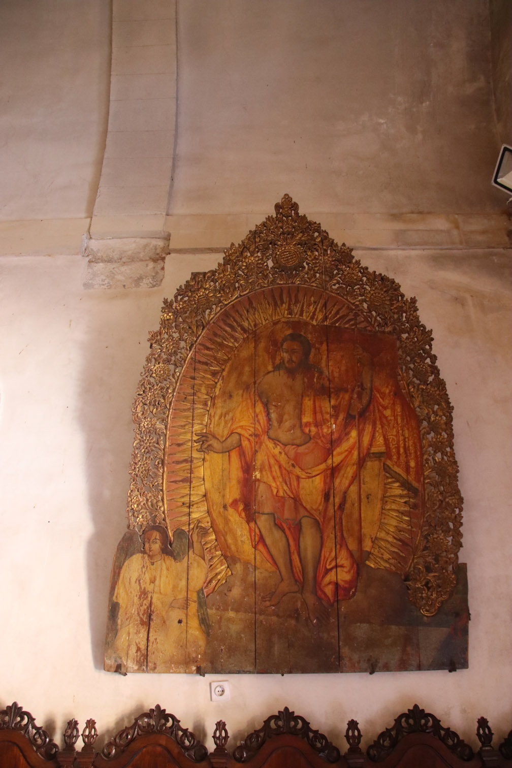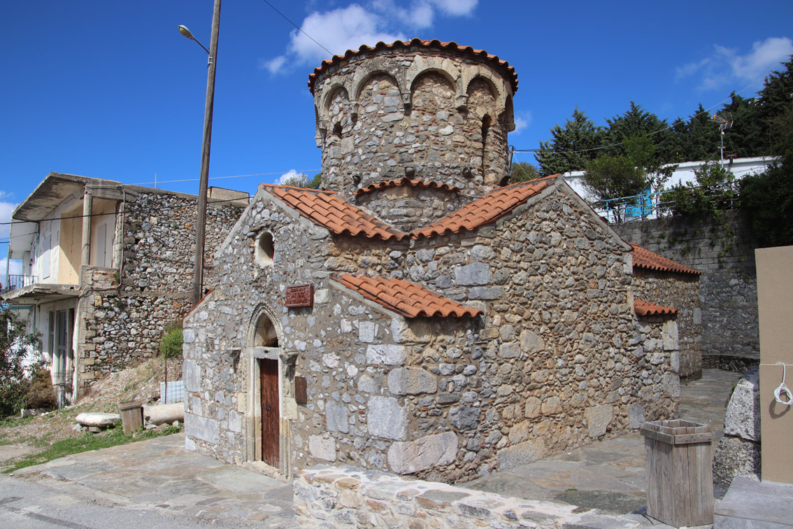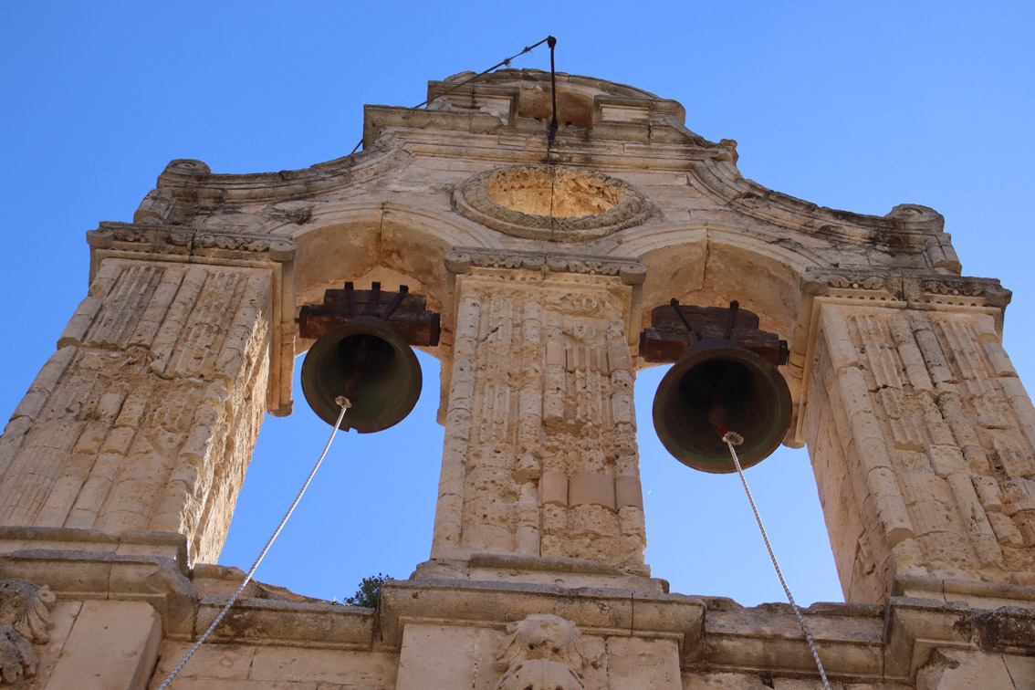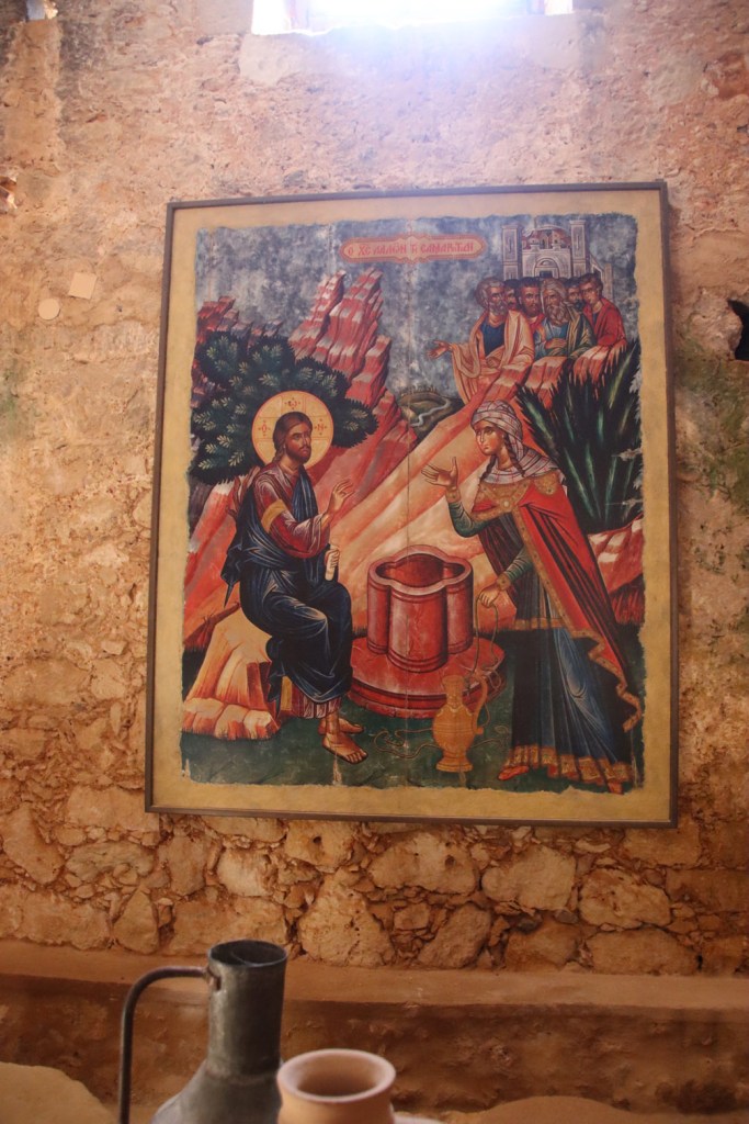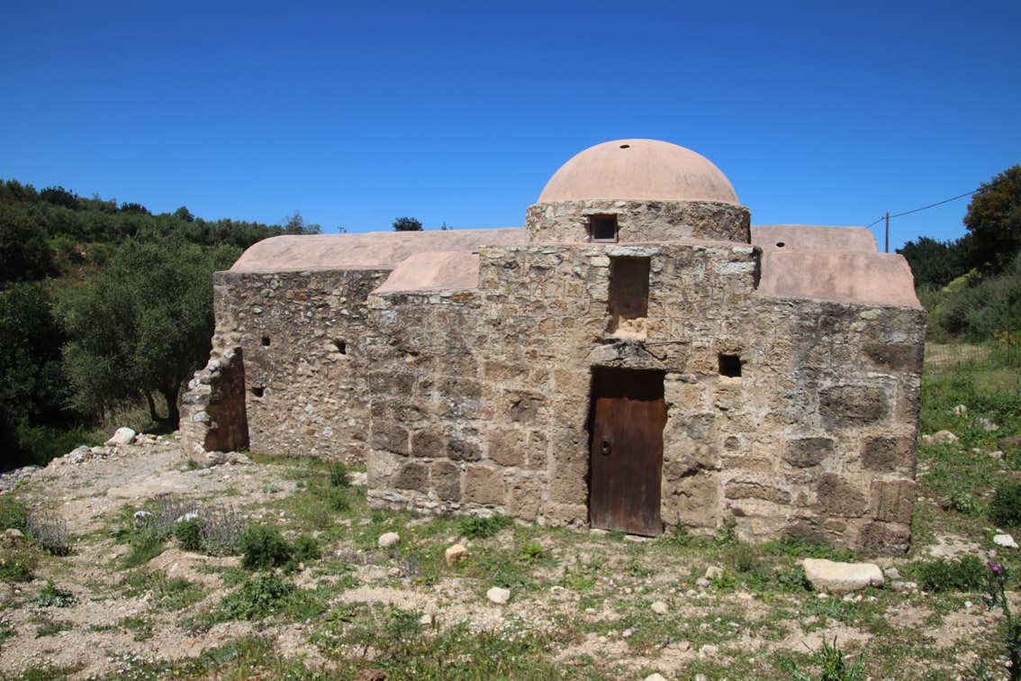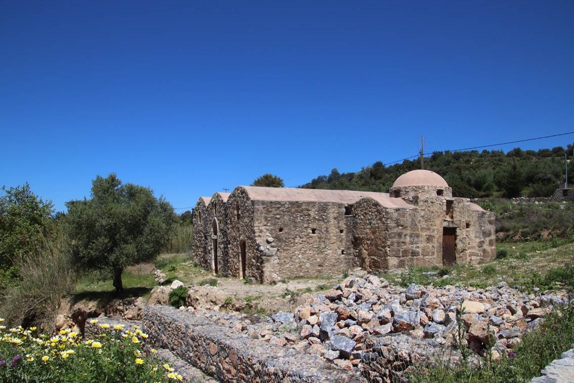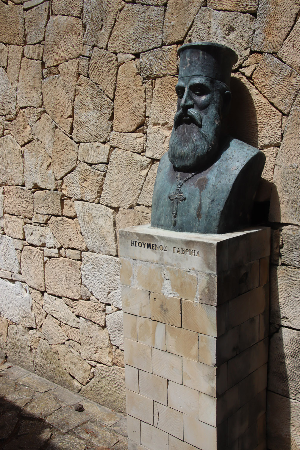 Au détour d’un virage, le monastère apparaît, c’est un édifice carré, assez massif de l’extérieur et de l’intérieur, l’ensemble fait penser un peu au type de bâtiments religieux que l’on pourrait trouver en Amérique du Sud (Mexique?) avec les clochers de son église d’un style proche du baroque Espagnol et ses enduits de teinte ocre rouge des murs. Mais non, nous sommes bien en Crète et le monastère a été fondé au 5éme ou 6ème siècle par les byzantins. Il a bien entendu subit depuis de nombreuses restaurations et modifications dont la façade de l’église qui est due à un architecte Italien du 16ème siècle.