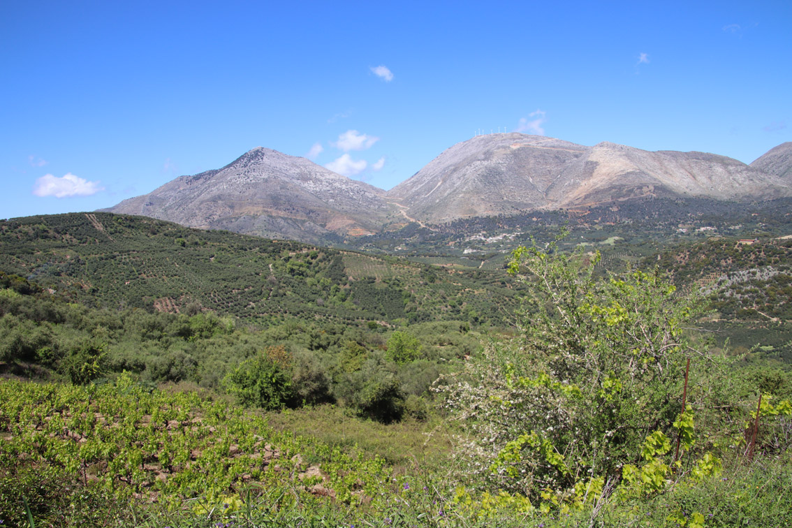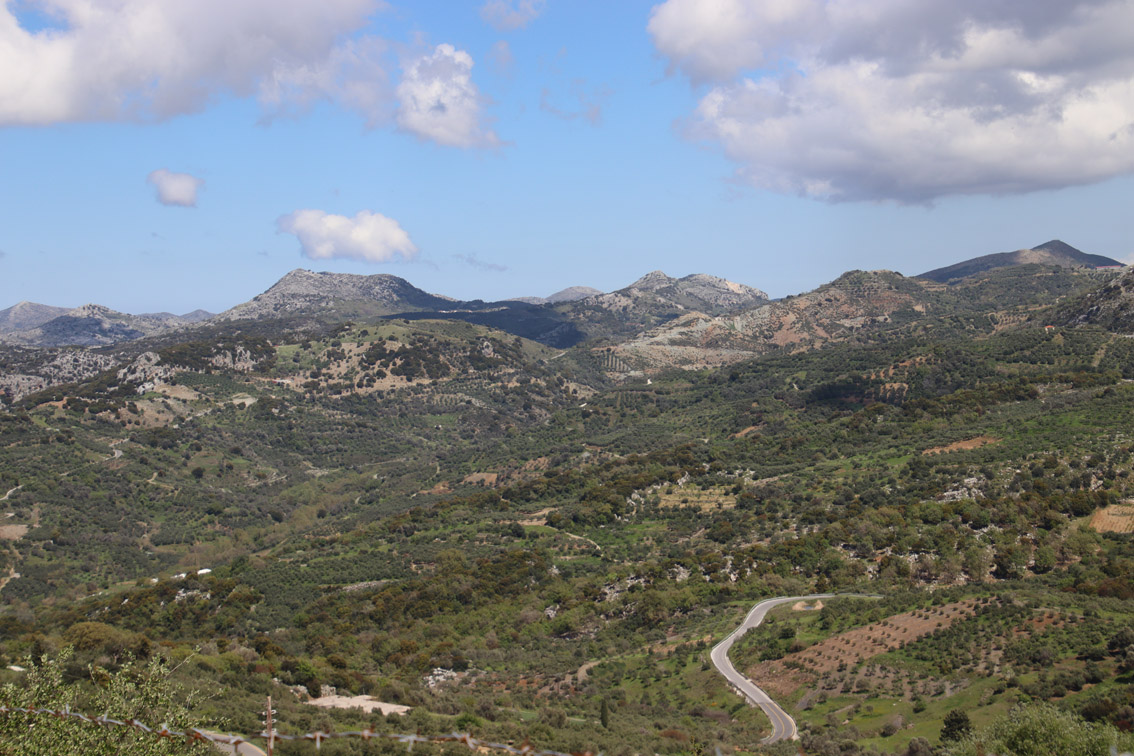 Aujourd’hui, programme plus raisonnable en terme de distance à parcourir! Nous irons d’abord au monastère d’Arcadiou puis aux grottes de Sfendoni pas plus de 130 km aller et retour, çà nous laissera du temps pour profiter du paysage. Et ça vaut le coup de l’admirer. Dés que l’on quitte la nationale, la petite route serpente à flanc de coteaux parmi les vignobles, les oliveraies et les garrigues fleuries, longeant parfois des vallées abruptes. Si on en croit les enseignes de la coopérative, ici ce sont des vergers bio et en plus ils sont beaux.