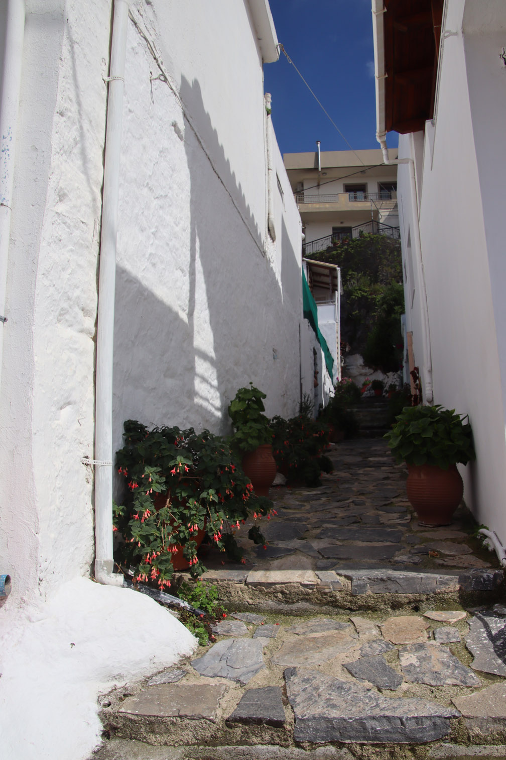 Sortis de cette plaine le paysage redevient grandiose creusé de vallées profondes avec en arrière plan, les sommets enneigés. Par contre les villages ne sont pas très attrayants. On est loin de ces petites merveilles auxquelles nous avaient habitué les Cyclades et le Dodécanèse. Ici à part les églises, peu de maison en pierre, la plupart sont des cubes de béton brut conséquence de tremblements de terre ou du manque de moyen des habitants, difficile à dire.