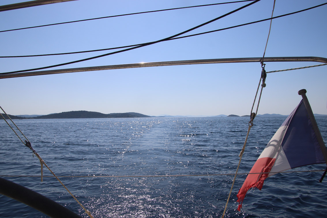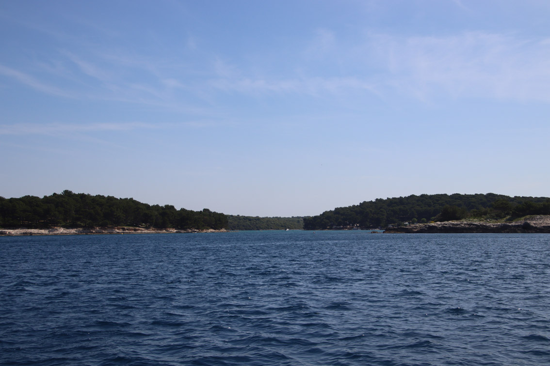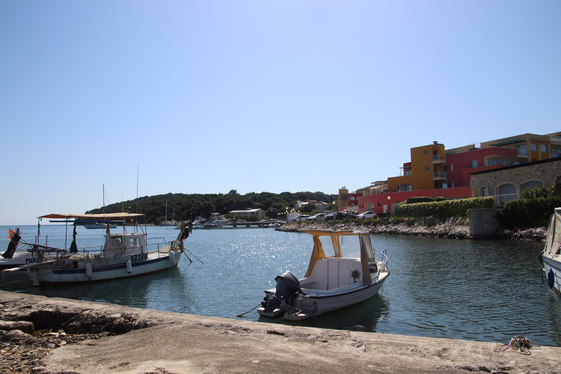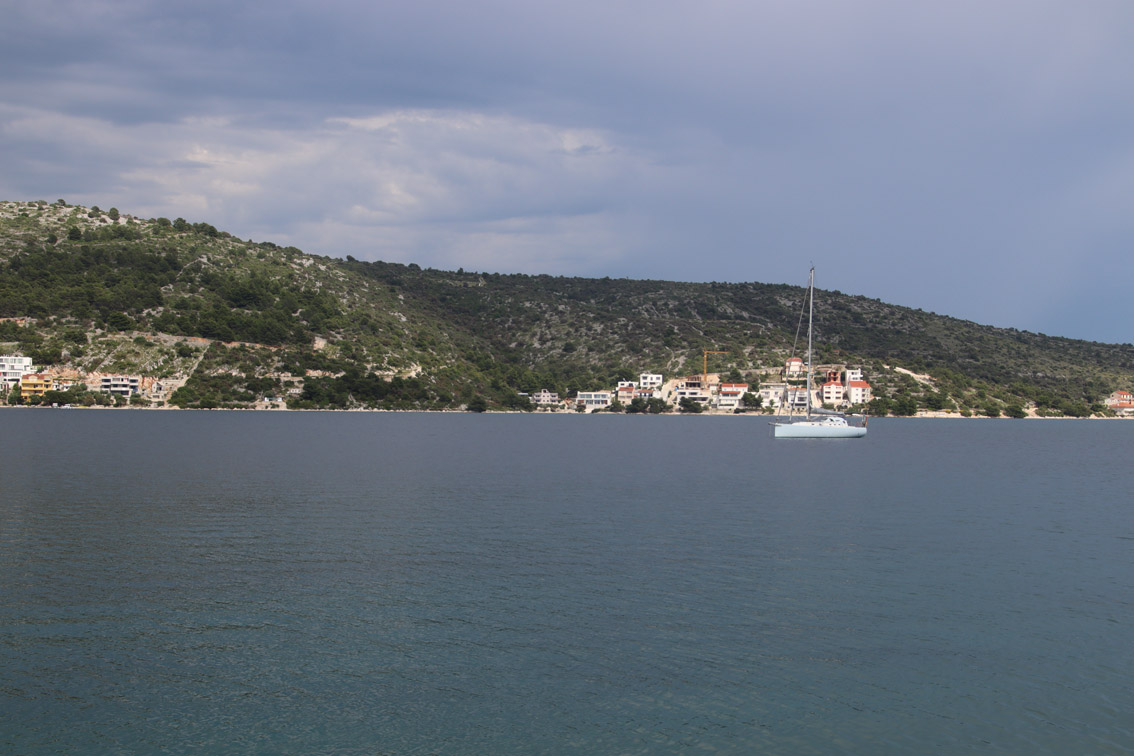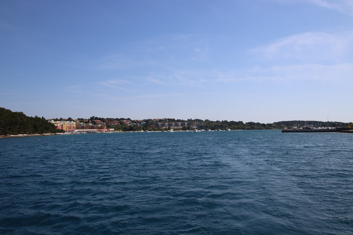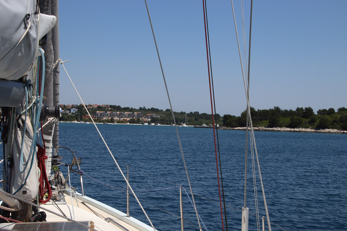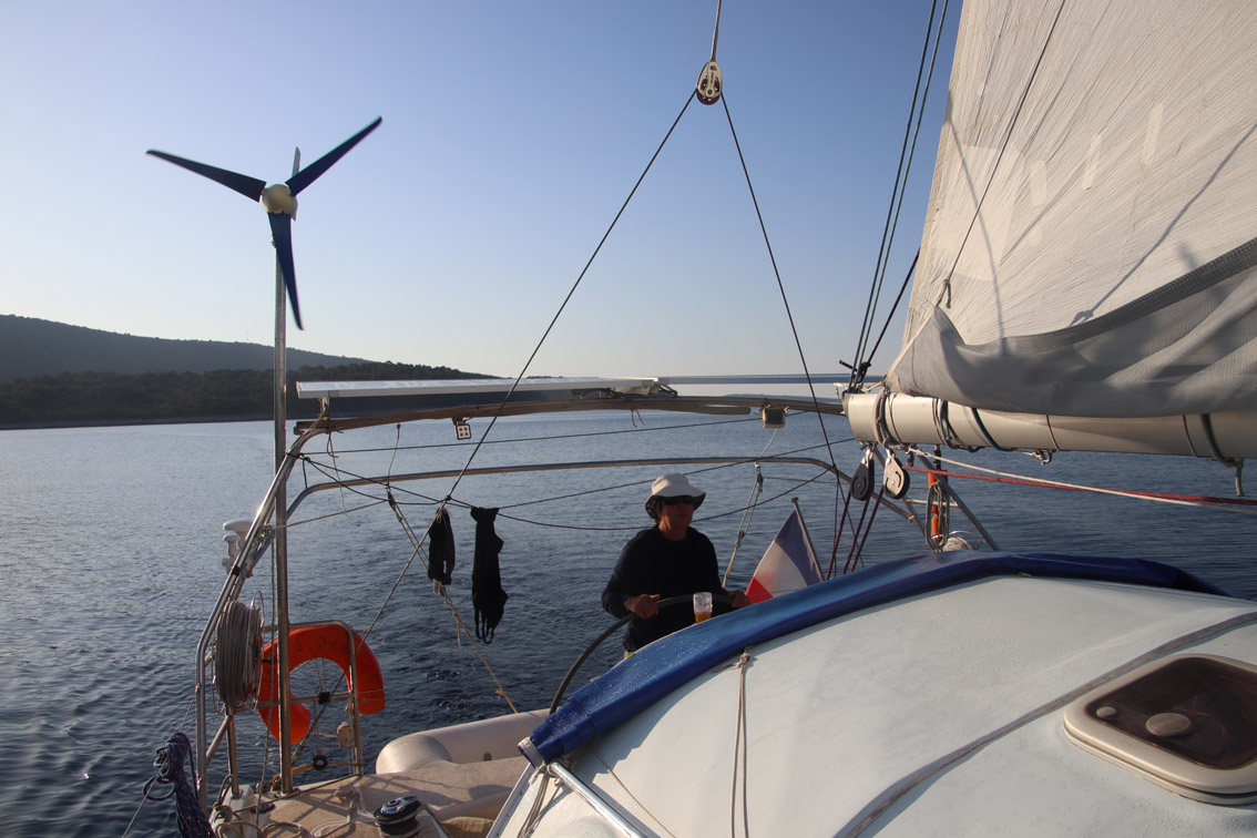 Et ce fut en effet un passage éclair, mer plate, vent d’est 15 à 18 nœuds, c’est à 8 nœuds que nous traversons le canal Kvarner. Nous avons levé l’ancre de Sunfarni à 07:10, à 12:10 nous la mouillons dans l’anse de Paltana (Banjole) en Istrie (quelques km au Sud de Pula. Cette baie aurait pu être très jolie si elle n’avait pas été défigurée par un hôtel en béton aux couleurs criardes d’un côté et d’un lotissement de luxe mais pas plus joli de l’autre. Mais l’abri est bon sauf du plein Ouest et le fond de très bonne tenue.