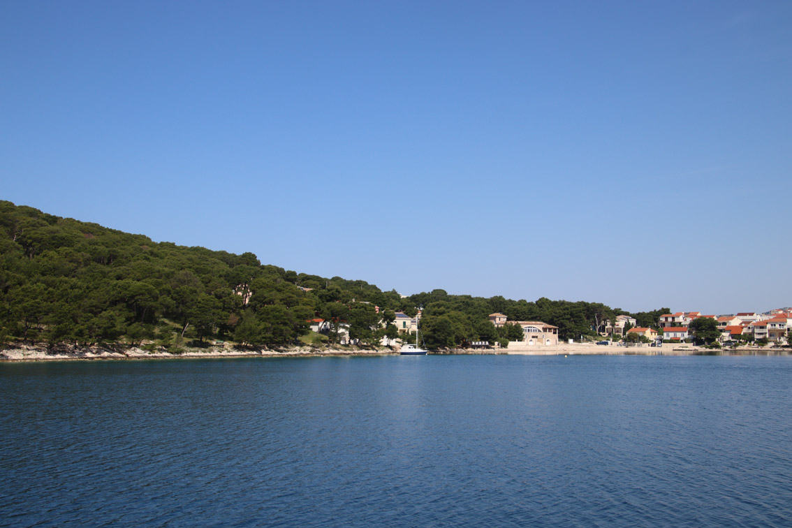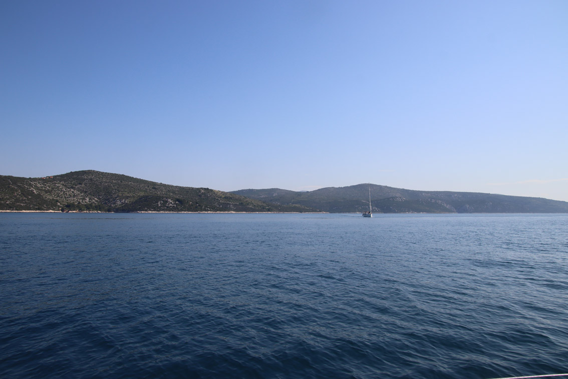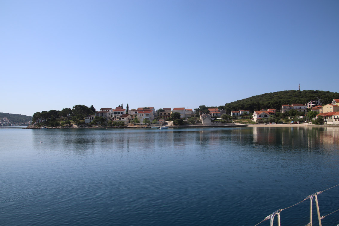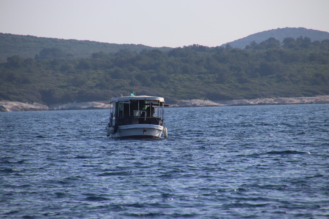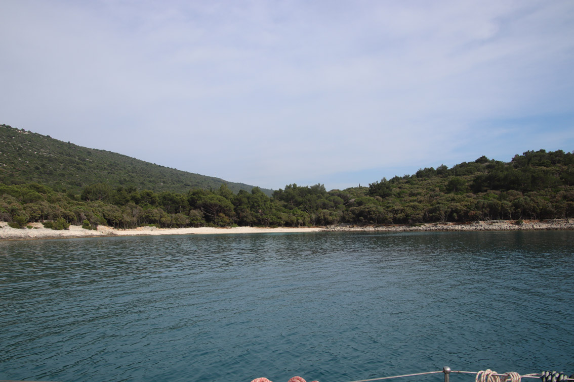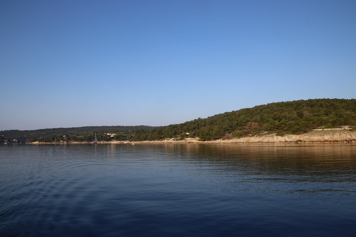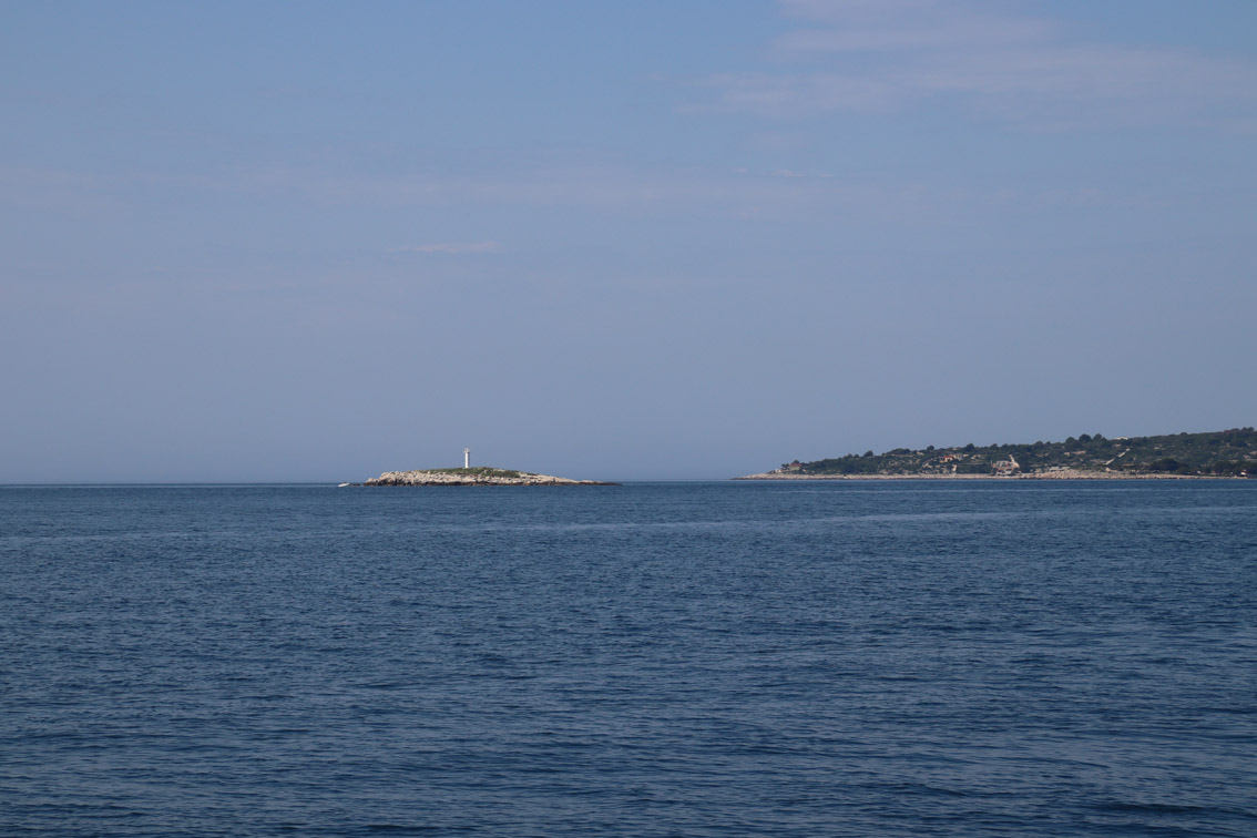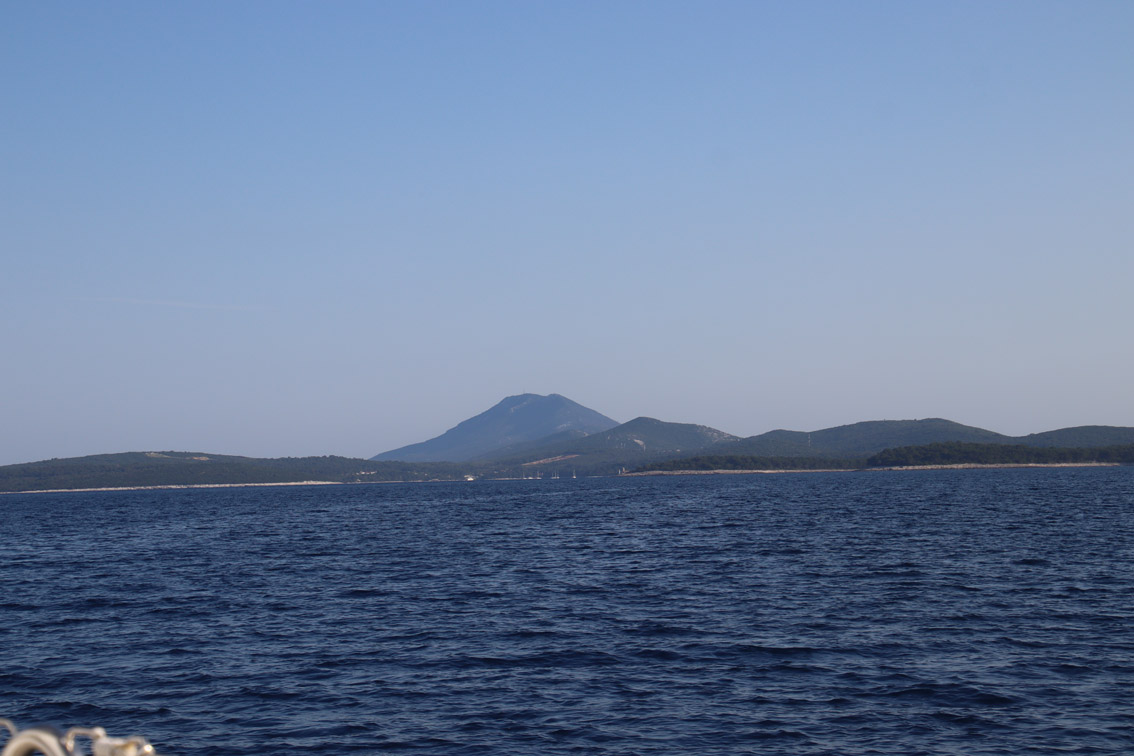Et ce fut en effet un passage éclair, mer plate, vent d’est 15 à 18 nœuds, c’est à 8 nœuds que nous traversons le canal Kvarner. Nous avons levé l’ancre de Sunfarni à 07:10, à 12:10 nous la mouillons dans l’anse de Paltana (Banjole) en Istrie (quelques km au Sud de Pula. Cette baie aurait pu être très jolie si elle n’avait pas été défigurée par un hôtel en béton aux couleurs criardes d’un côté et d’un lotissement de luxe mais pas plus joli de l’autre. Mais l’abri est bon sauf du plein Ouest et le fond de très bonne tenue.