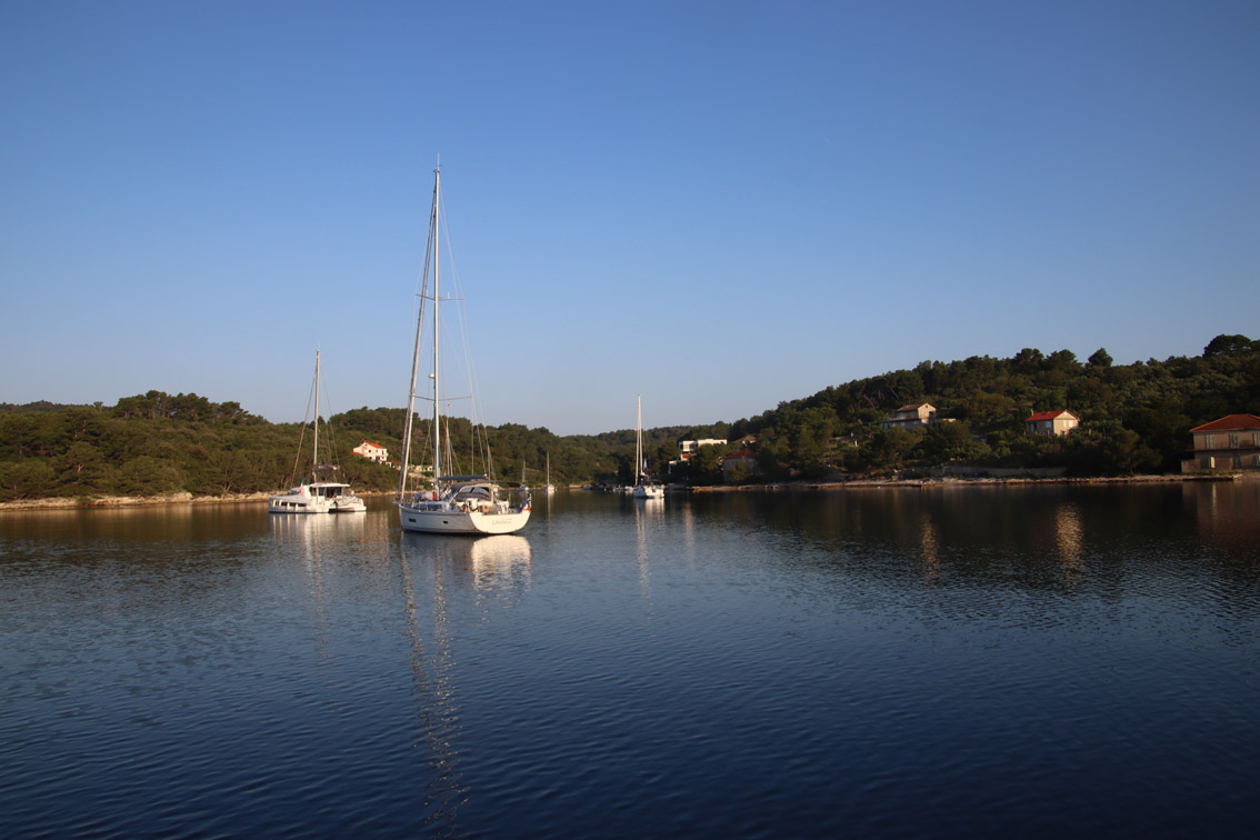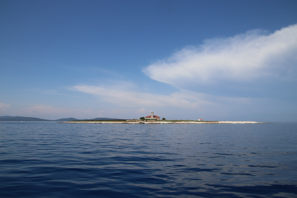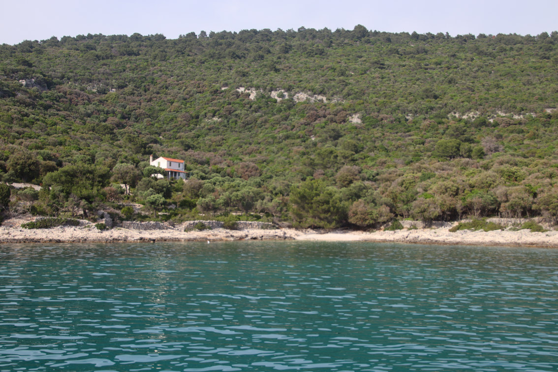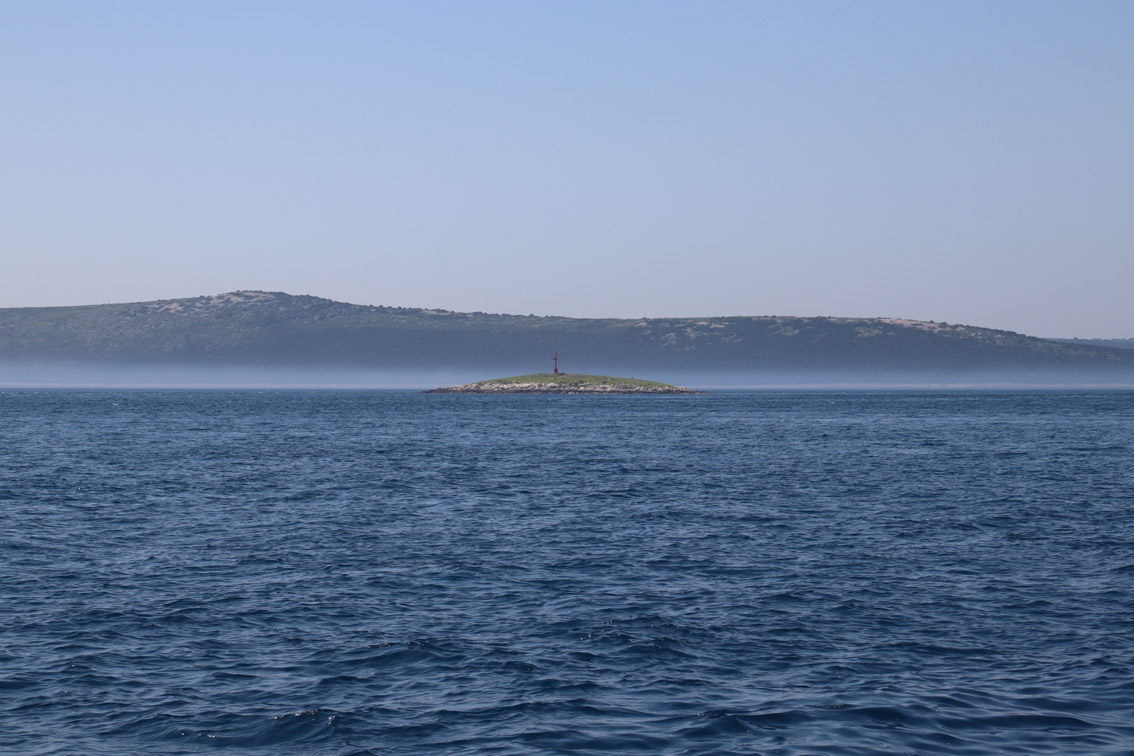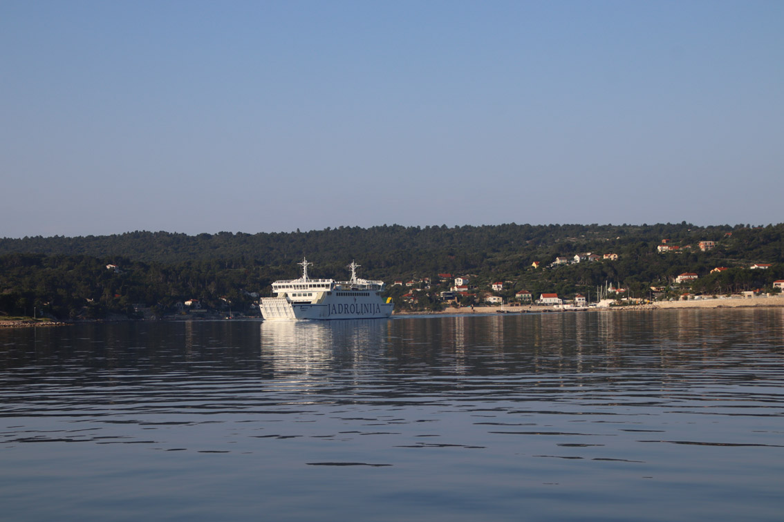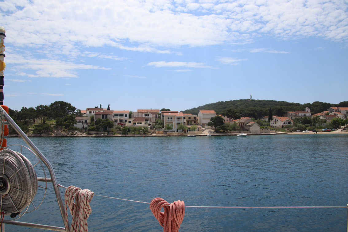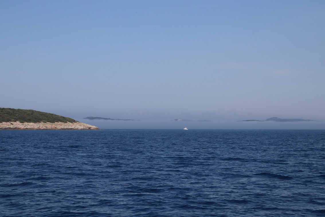 Et ce fut en effet un passage éclair, mer plate, vent d’est 15 à 18 nœuds, c’est à 8 nœuds que nous traversons le canal Kvarner. Nous avons levé l’ancre de Sunfarni à 07:10, à 12:10 nous la mouillons dans l’anse de Paltana (Banjole) en Istrie (quelques km au Sud de Pula. Cette baie aurait pu être très jolie si elle n’avait pas été défigurée par un hôtel en béton aux couleurs criardes d’un côté et d’un lotissement de luxe mais pas plus joli de l’autre. Mais l’abri est bon sauf du plein Ouest et le fond de très bonne tenue.
