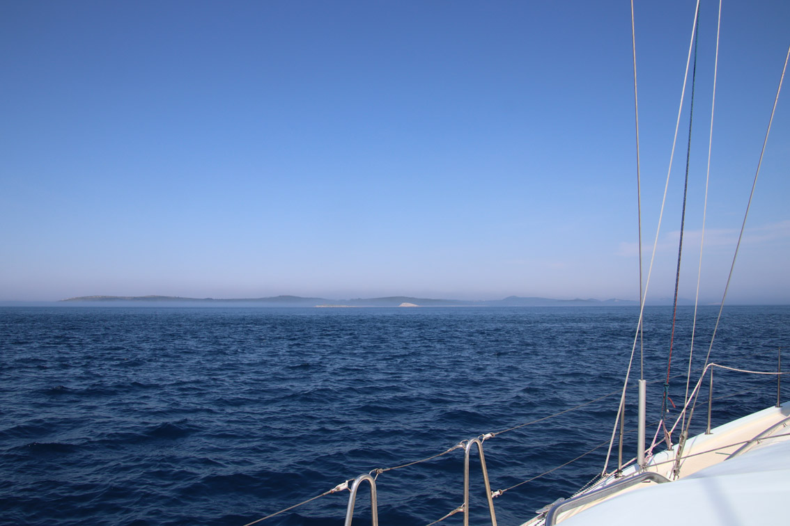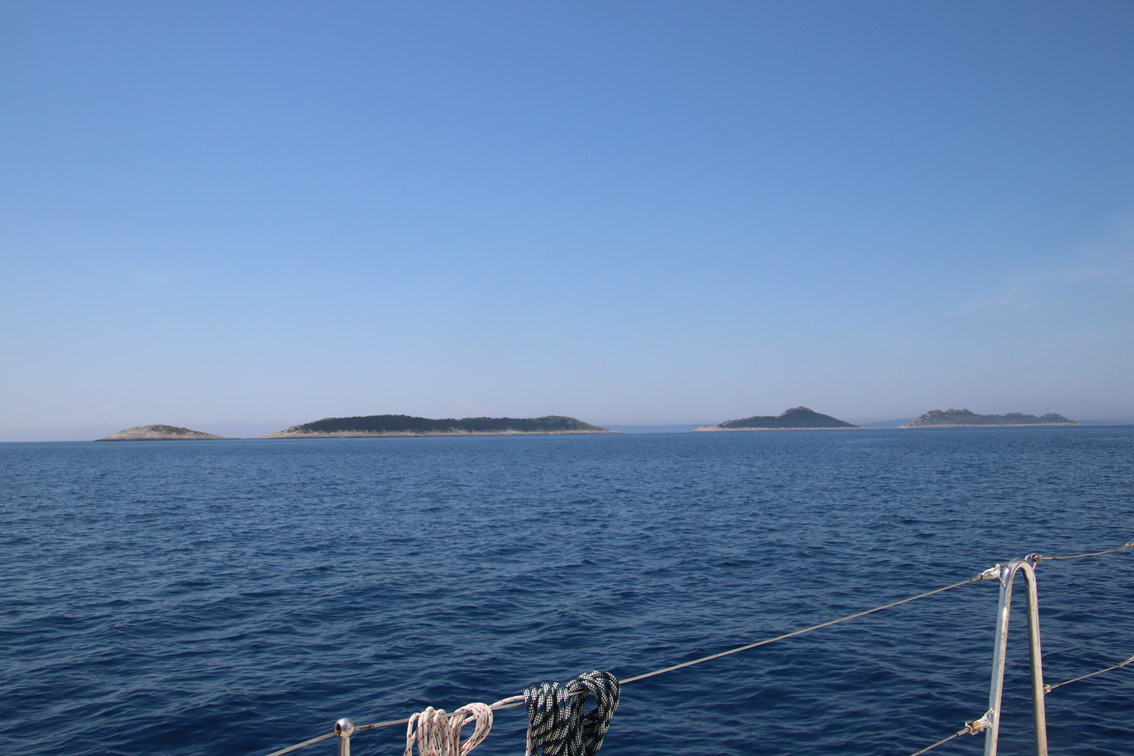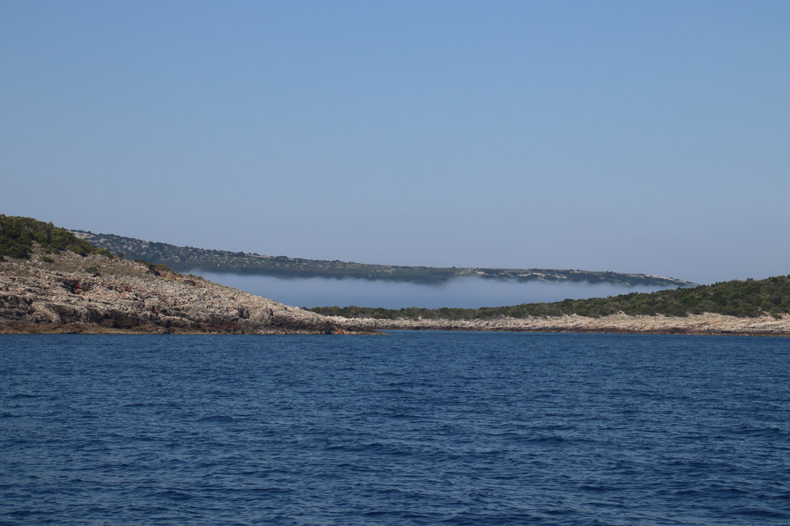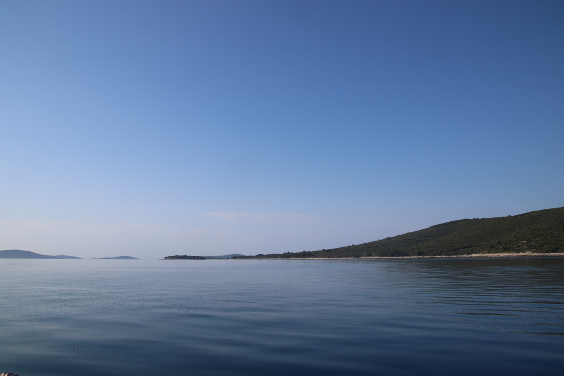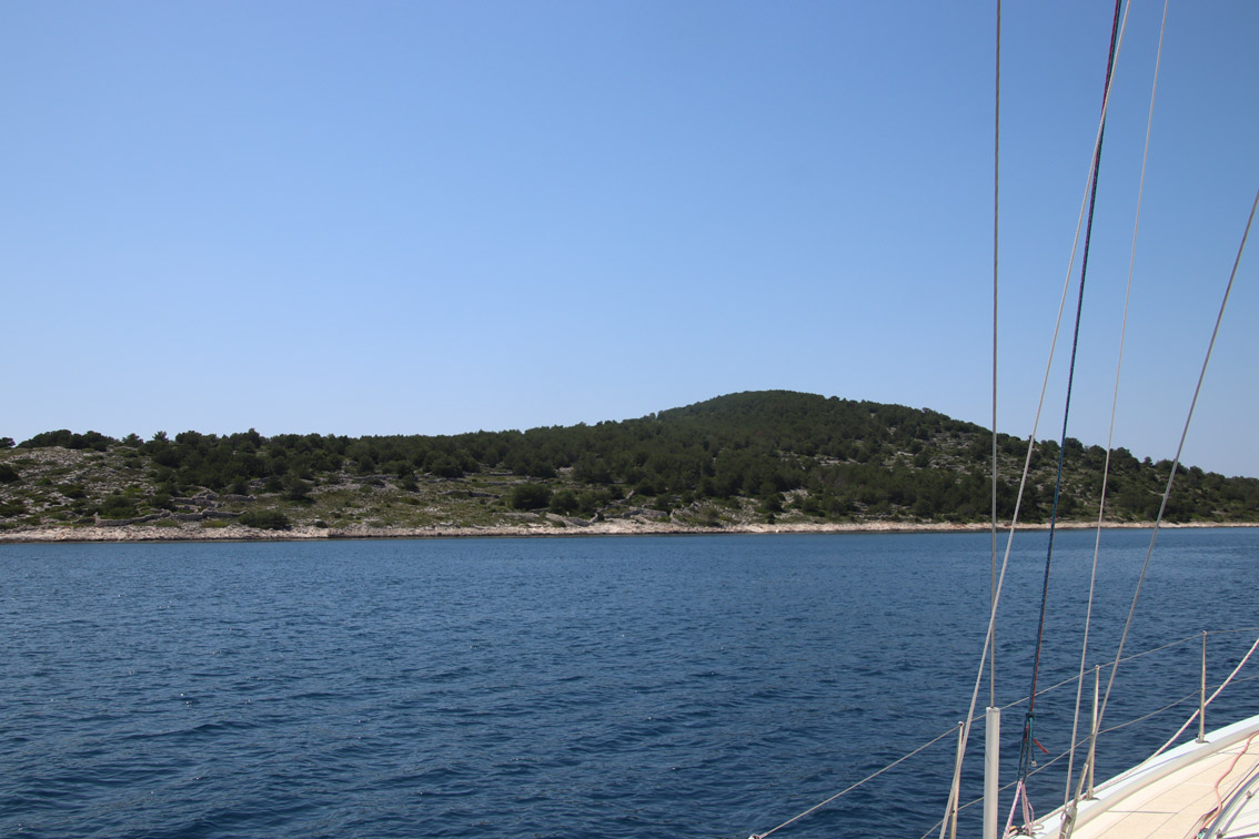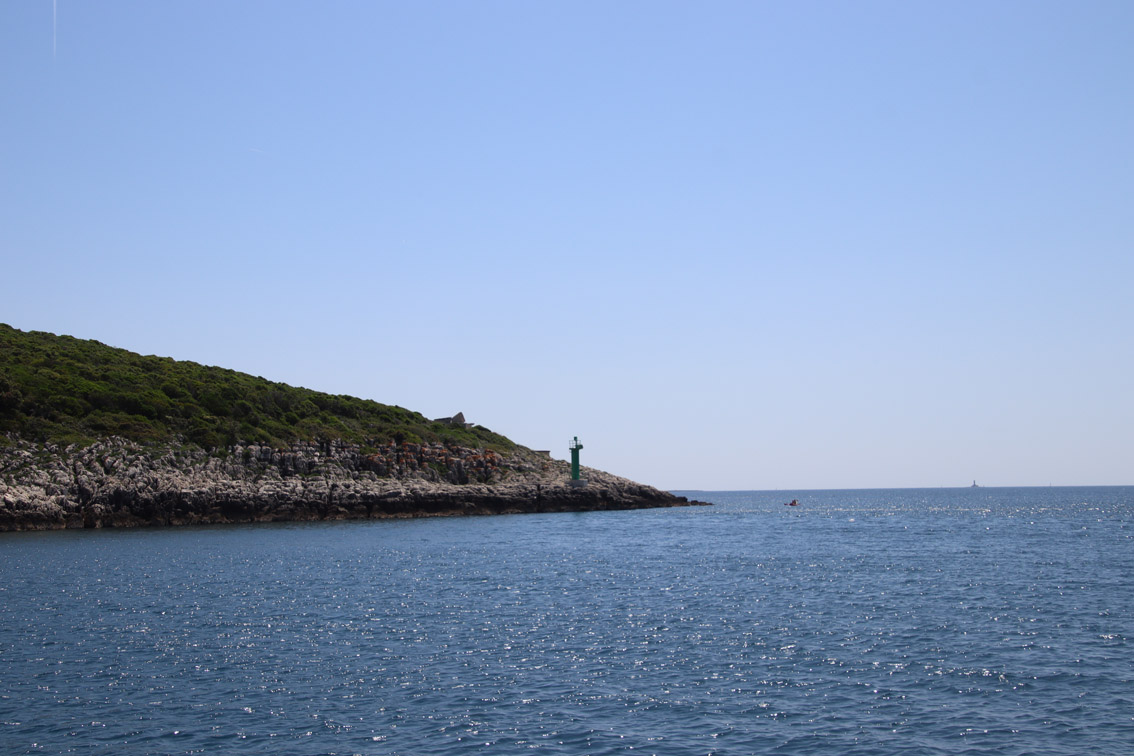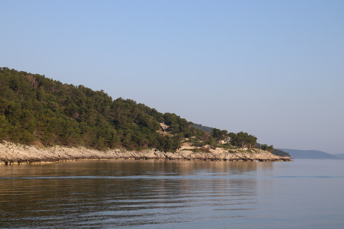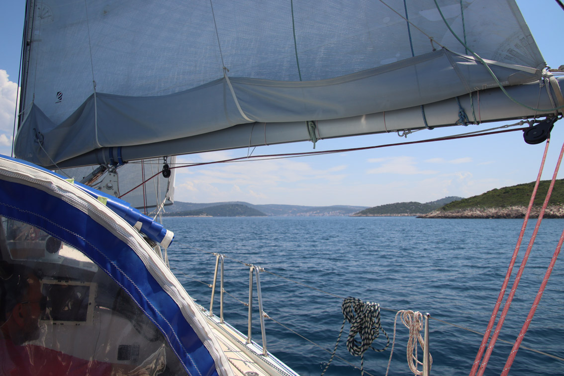 Et ce fut en effet un passage éclair, mer plate, vent d’est 15 à 18 nœuds, c’est à 8 nœuds que nous traversons le canal Kvarner. Nous avons levé l’ancre de Sunfarni à 07:10, à 12:10 nous la mouillons dans l’anse de Paltana (Banjole) en Istrie (quelques km au Sud de Pula. Cette baie aurait pu être très jolie si elle n’avait pas été défigurée par un hôtel en béton aux couleurs criardes d’un côté et d’un lotissement de luxe mais pas plus joli de l’autre. Mais l’abri est bon sauf du plein Ouest et le fond de très bonne tenue.