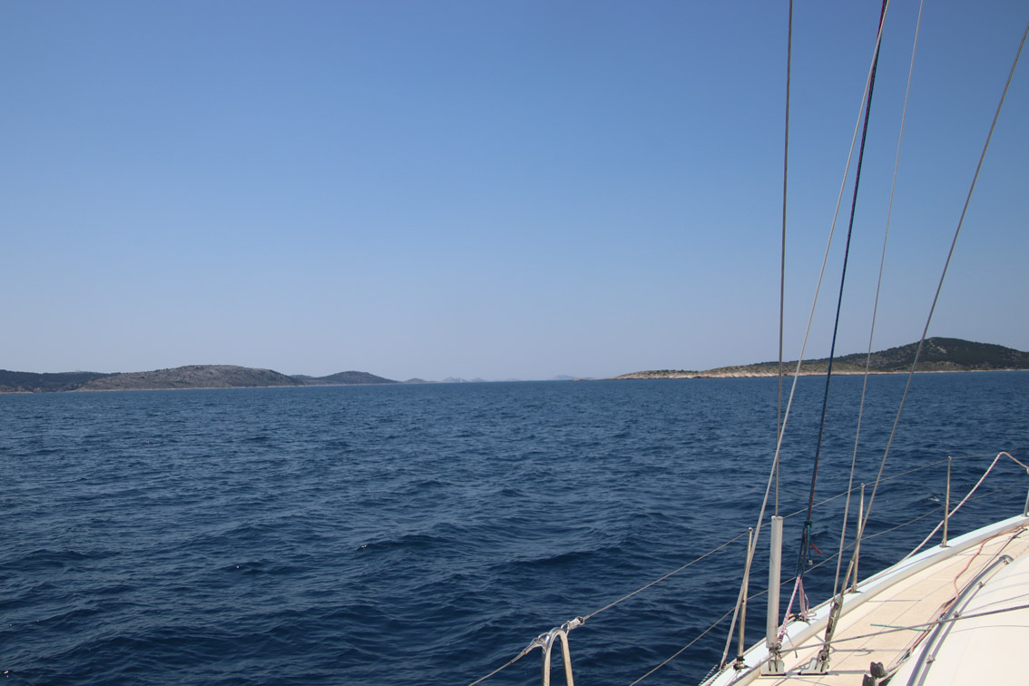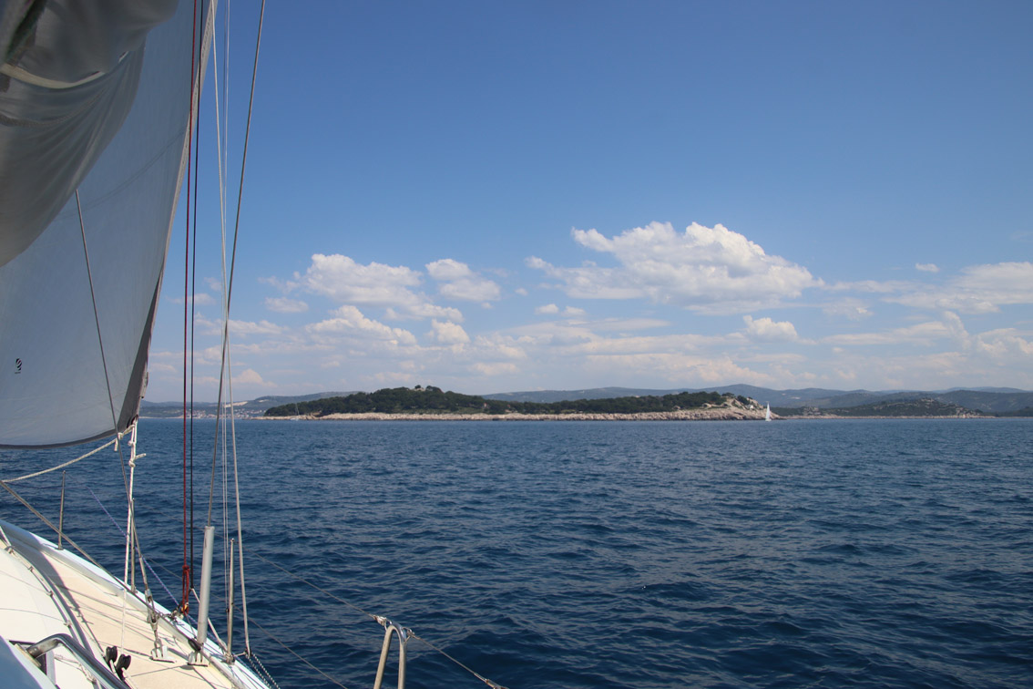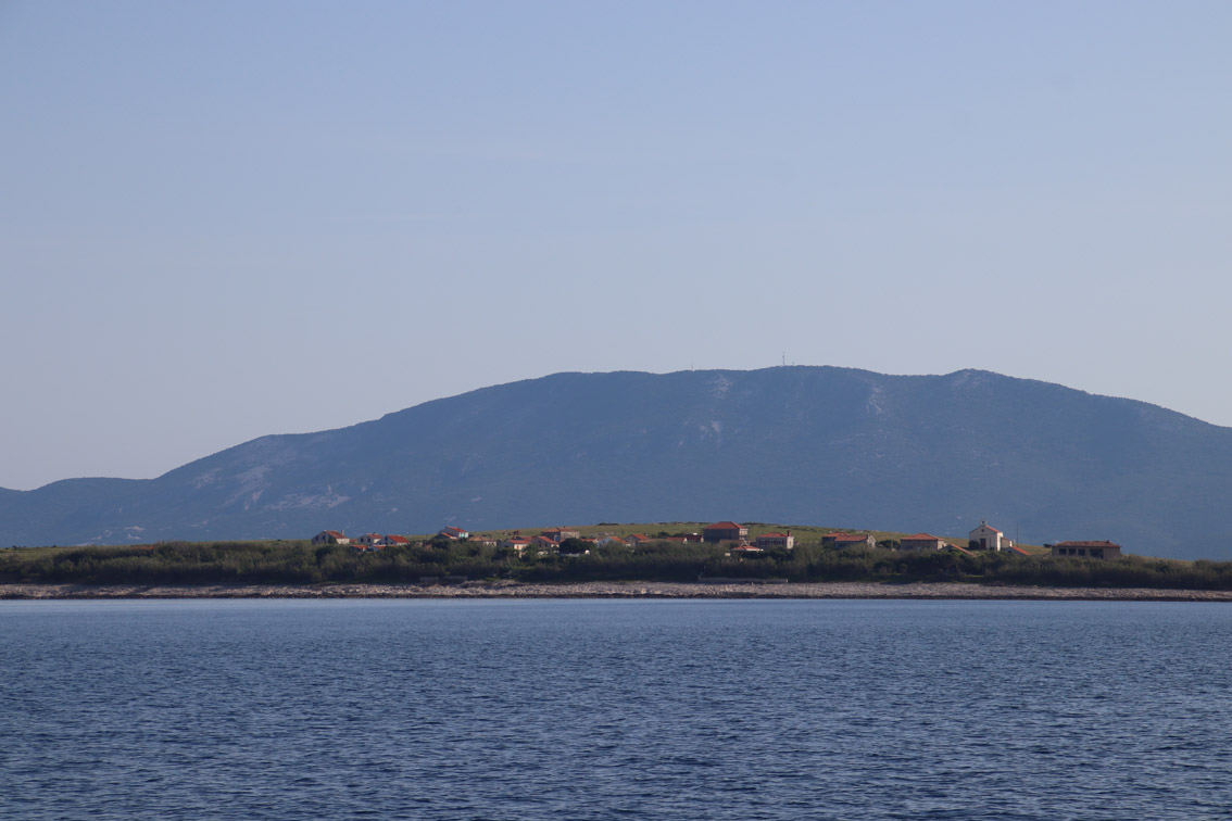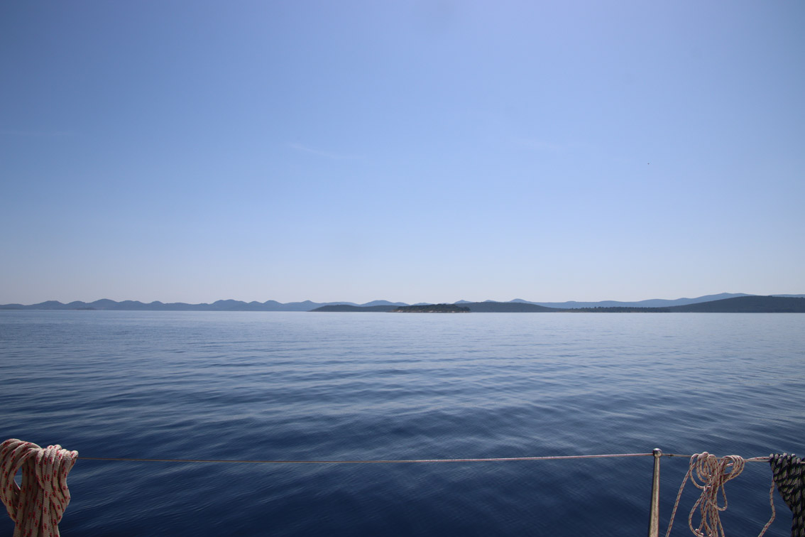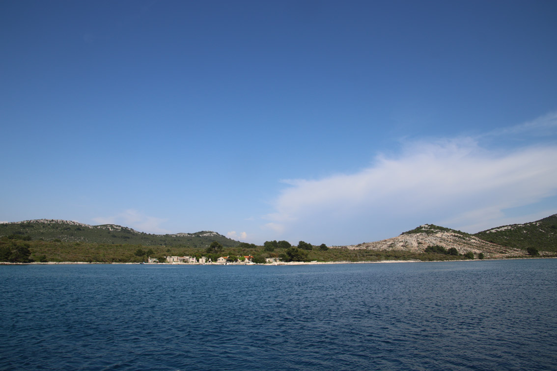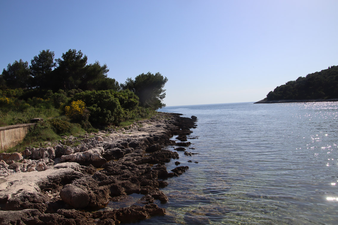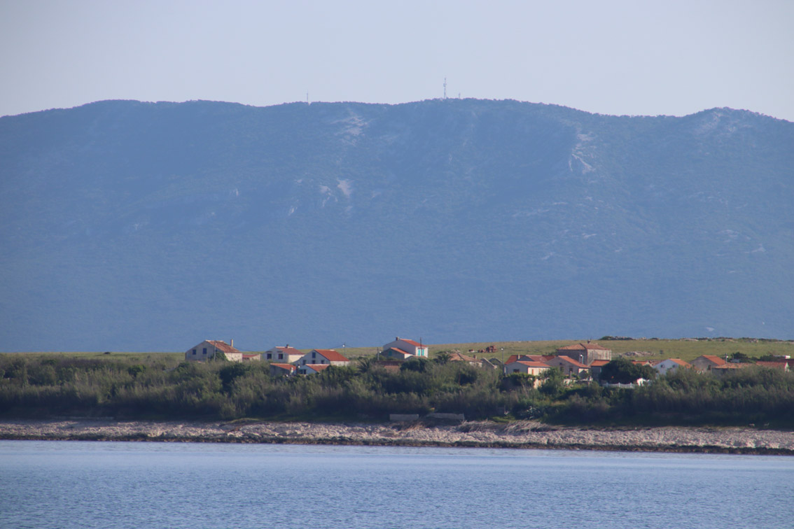 Et ce fut en effet un passage éclair, mer plate, vent d’est 15 à 18 nœuds, c’est à 8 nœuds que nous traversons le canal Kvarner. Nous avons levé l’ancre de Sunfarni à 07:10, à 12:10 nous la mouillons dans l’anse de Paltana (Banjole) en Istrie (quelques km au Sud de Pula. Cette baie aurait pu être très jolie si elle n’avait pas été défigurée par un hôtel en béton aux couleurs criardes d’un côté et d’un lotissement de luxe mais pas plus joli de l’autre. Mais l’abri est bon sauf du plein Ouest et le fond de très bonne tenue.