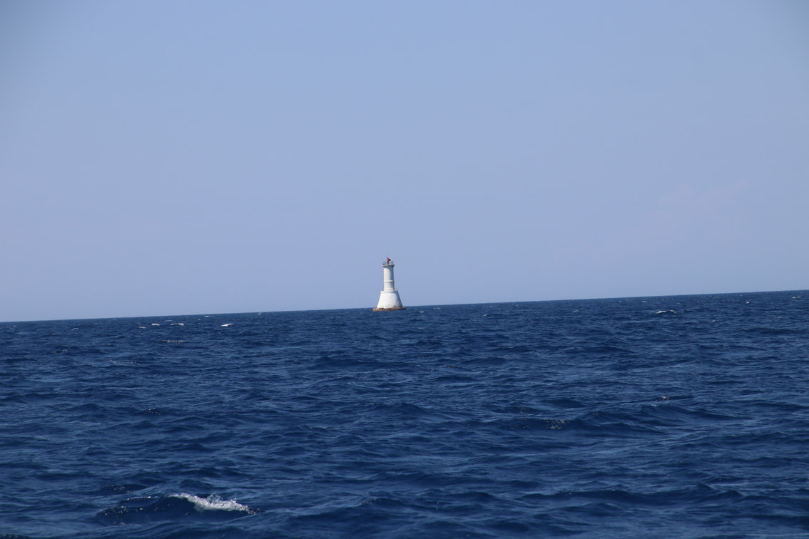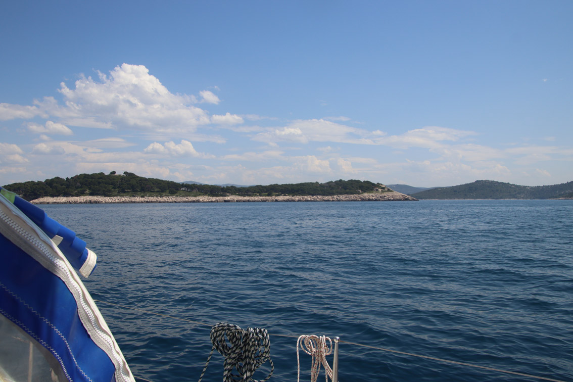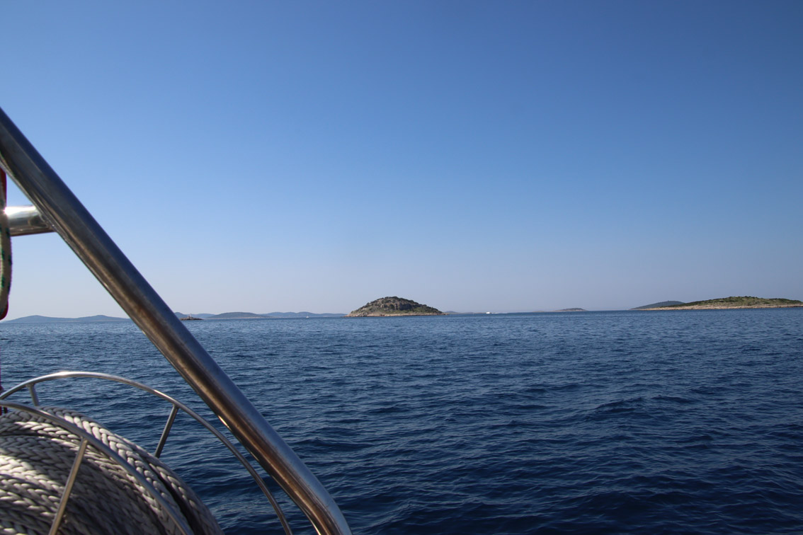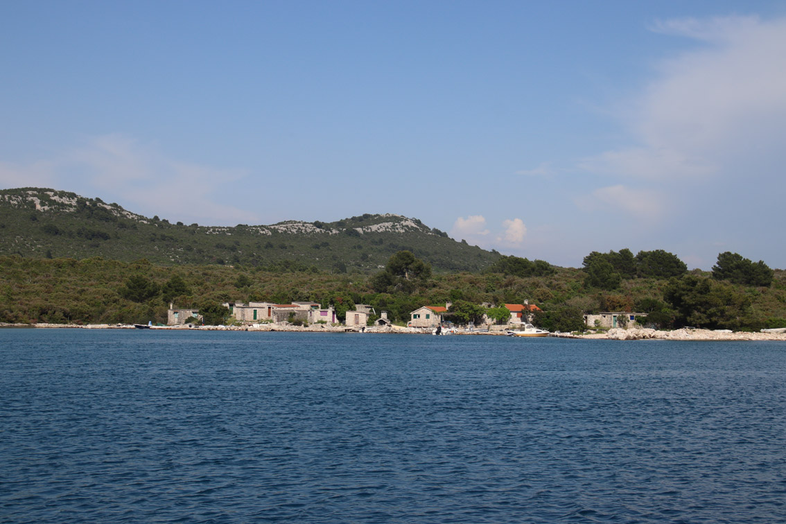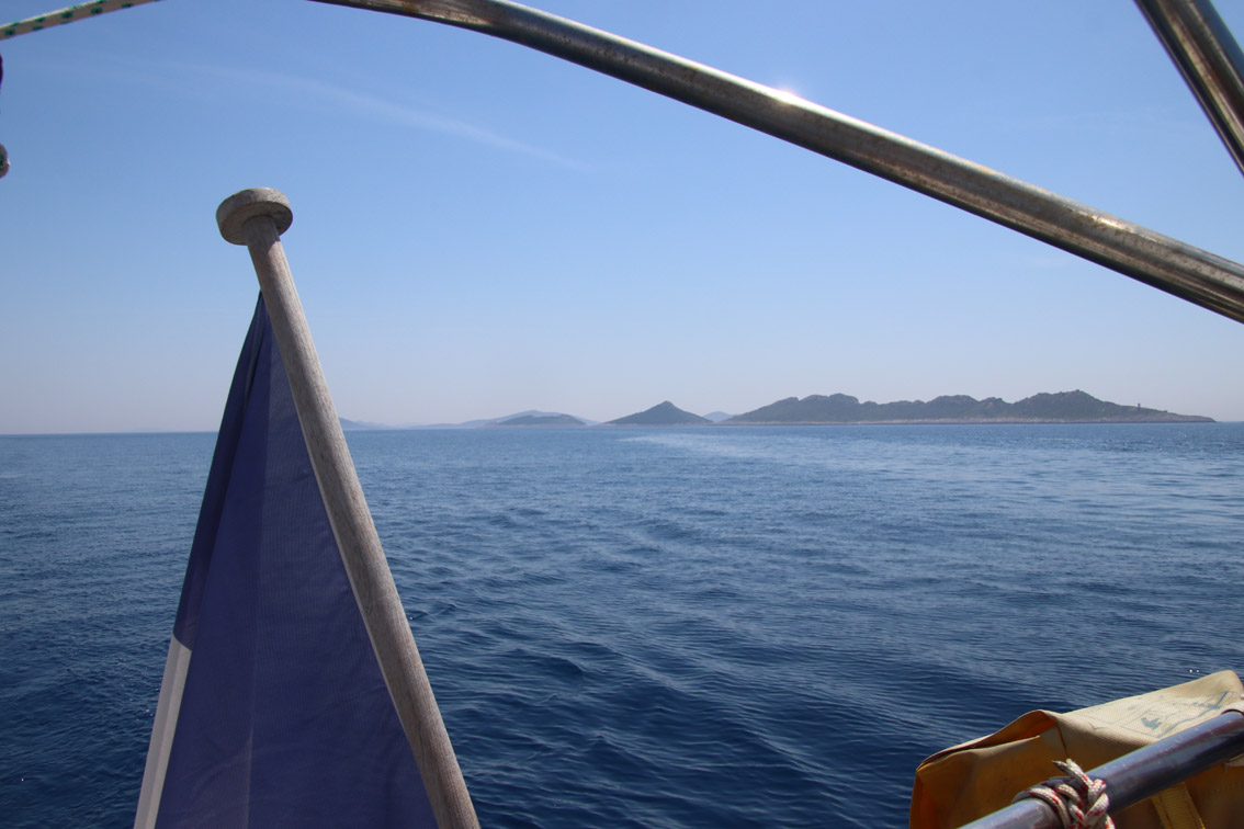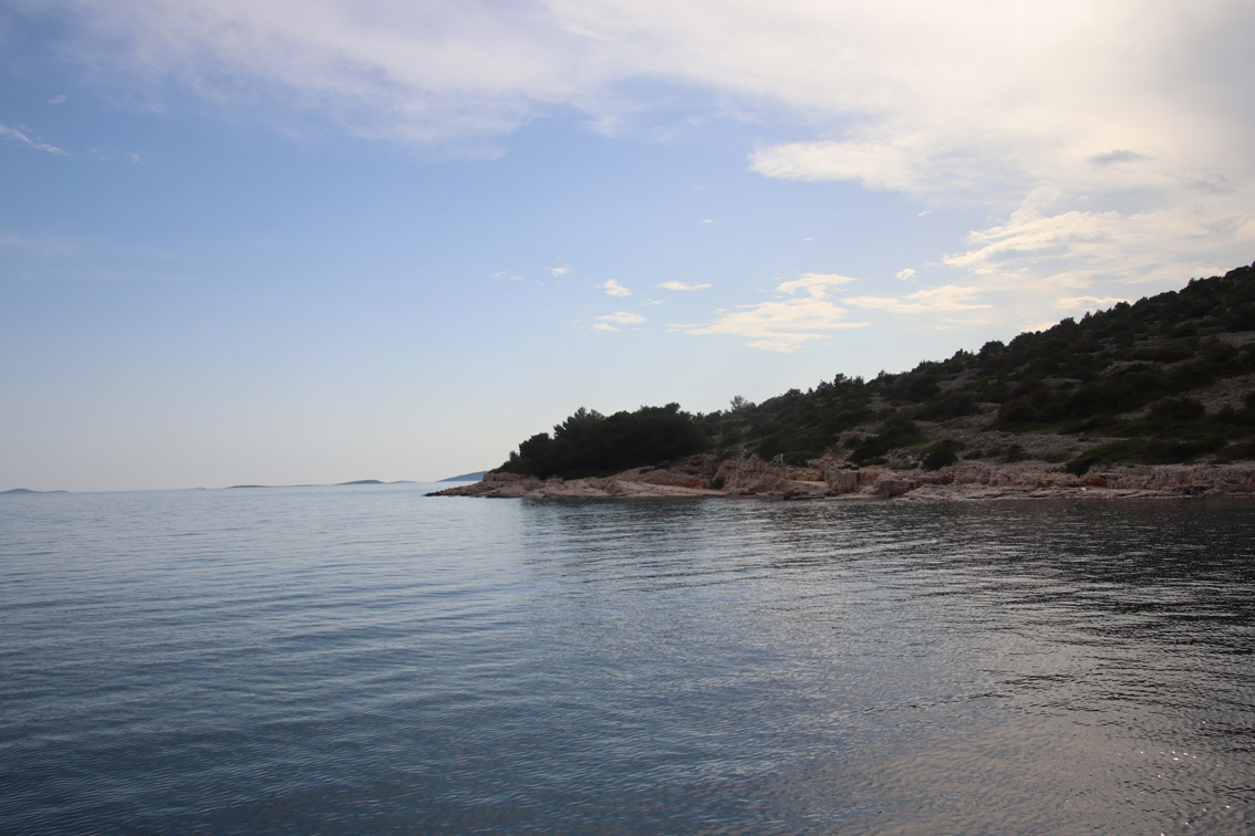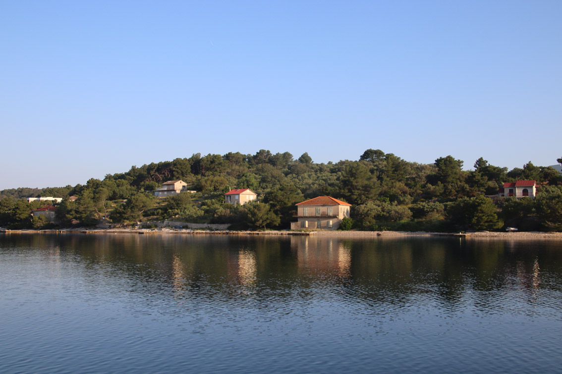 Et ce fut en effet un passage éclair, mer plate, vent d’est 15 à 18 nœuds, c’est à 8 nœuds que nous traversons le canal Kvarner. Nous avons levé l’ancre de Sunfarni à 07:10, à 12:10 nous la mouillons dans l’anse de Paltana (Banjole) en Istrie (quelques km au Sud de Pula. Cette baie aurait pu être très jolie si elle n’avait pas été défigurée par un hôtel en béton aux couleurs criardes d’un côté et d’un lotissement de luxe mais pas plus joli de l’autre. Mais l’abri est bon sauf du plein Ouest et le fond de très bonne tenue.