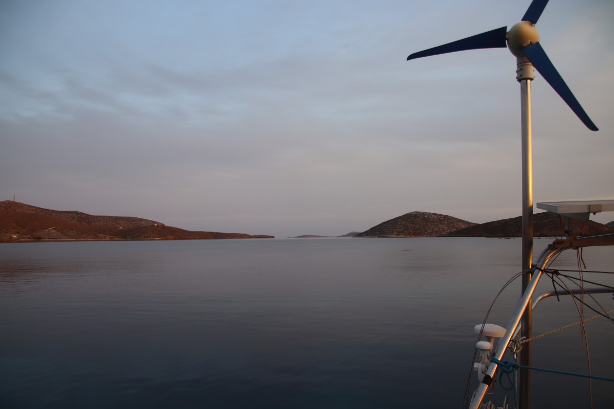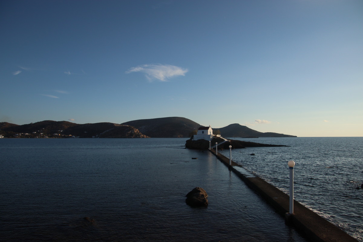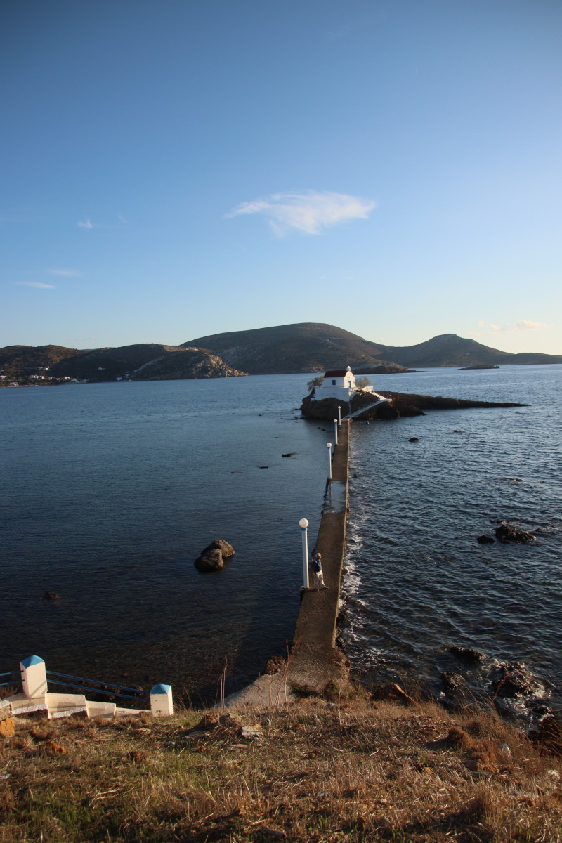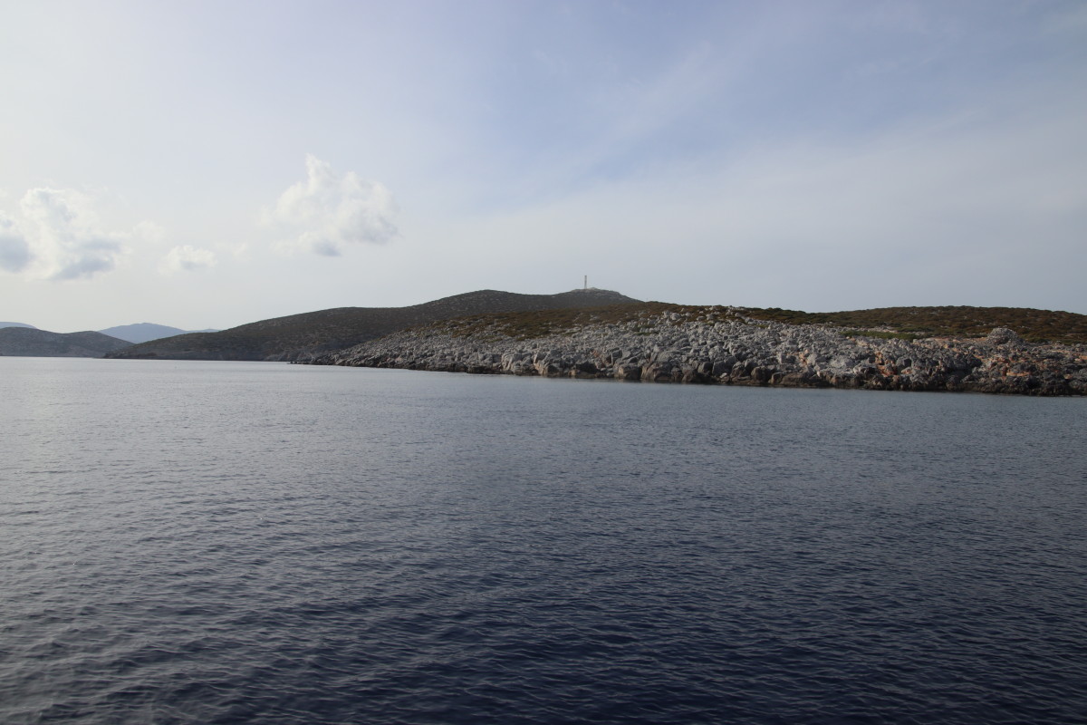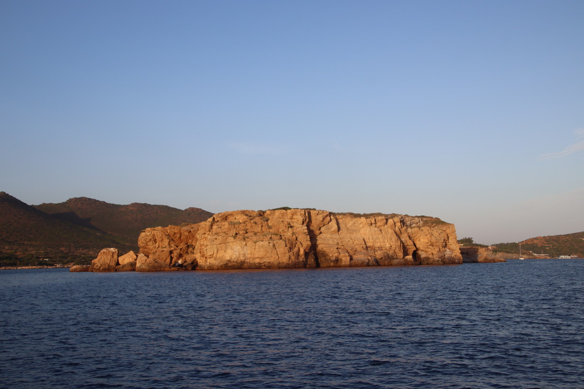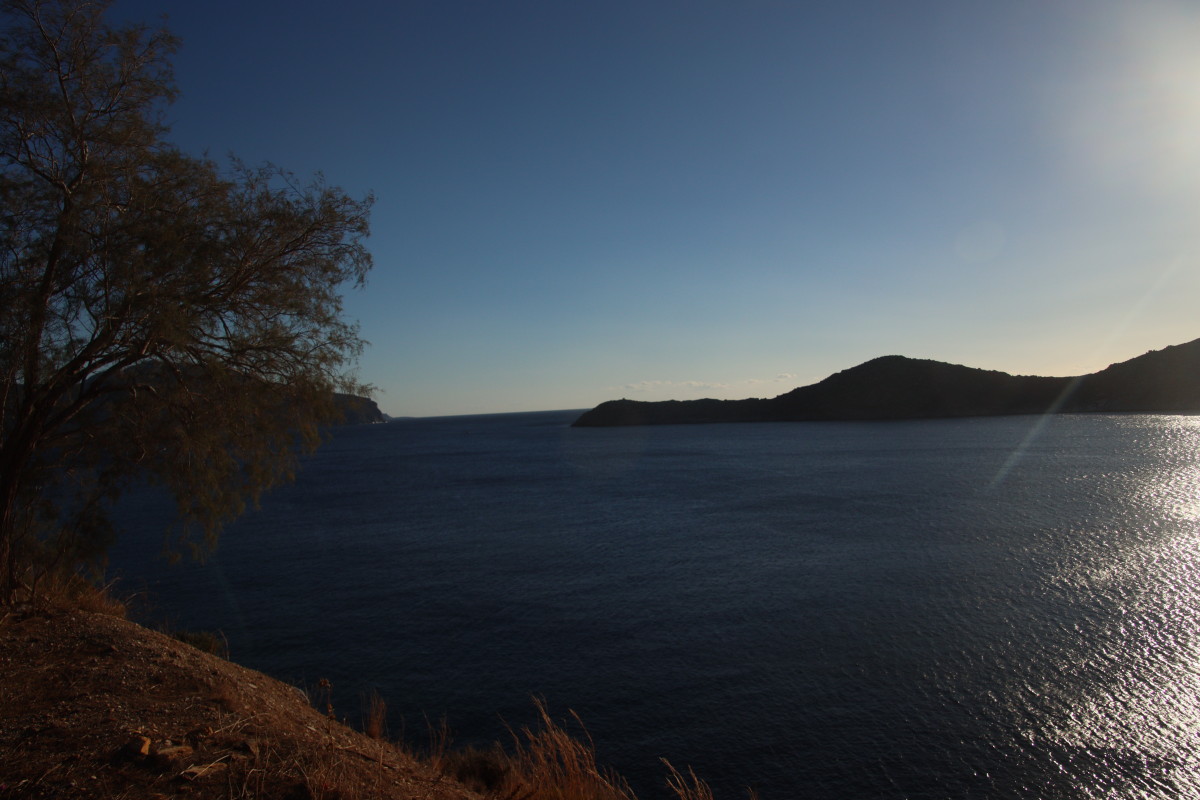 Vendredi on continue notre programme d’entretien sur le bateau vidange moteur pour Domi, nettoyage, rangement et ponçage de l’hélice pour moi . Dans l’après midi on part pour un nouveau raid d’exploration de l’île. Notre objectif : le coucher du soleil à la pointe Lakki en faisant le tour de la péninsule par le nord. On commence par rendre visite à Saint Isidore (Agios Isidorus) dont la petite chapelle à été consstruite sur un rocher relié au rivage par une petite digue d’un mètre de large et surplombant le niveau de la mer de seulement quelques cm. Puis on fait le tour de la baie et c’est là que le mot raid commence à prendre tout son sens: à peine passé le hameau de Drymon la route sinueuse et très étroite mais goudronnée, fait place à une piste de graviers qui devient de plus en plus difficile avec des ornières profondes et des pentes très raides. Mais difficile de faire demi-tour, surtout que le paysage est vraiment superbe. Notre petite citadine Coréenne se défend vaillamment et surmonte tous les obstacle sans faillir même si les derniers mètres avant de rejoindre l’asphalte sont un peu tirés par les cheveux. (et c’est là qu’on a lu les commentaires de Google maps : piste à n’emprunter qu’à pied ou avec un très bon 4X4. Malheureusement on a eu un problème de réglage d’exposition sur l’appareil et on a pu récupérer seulement quelques photos…