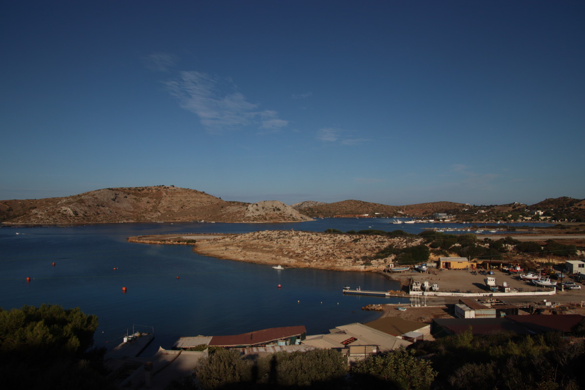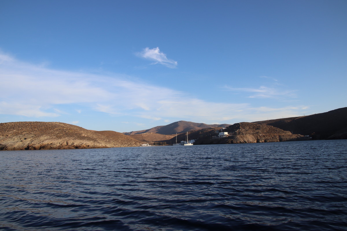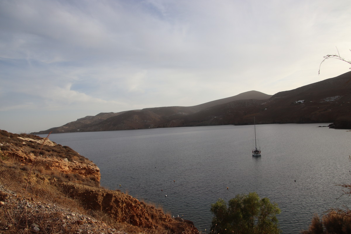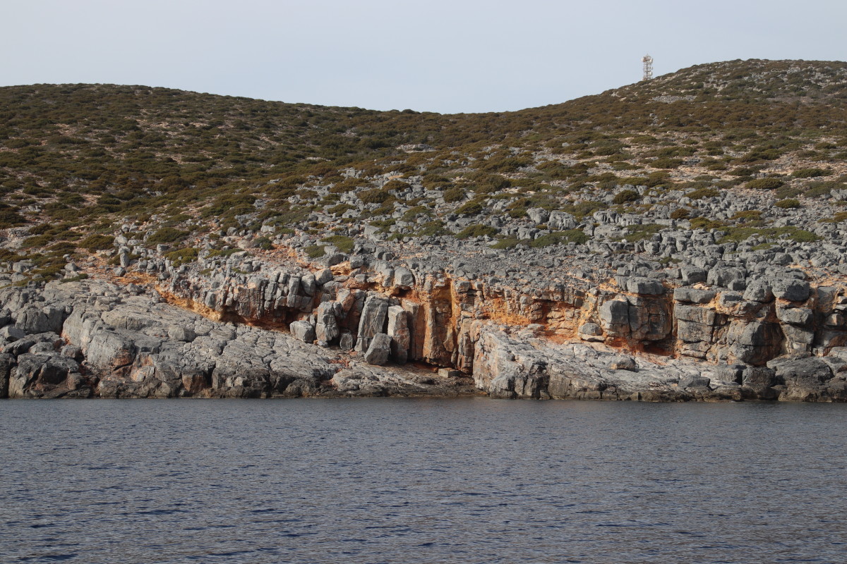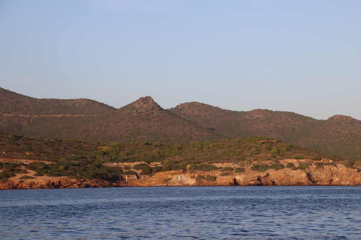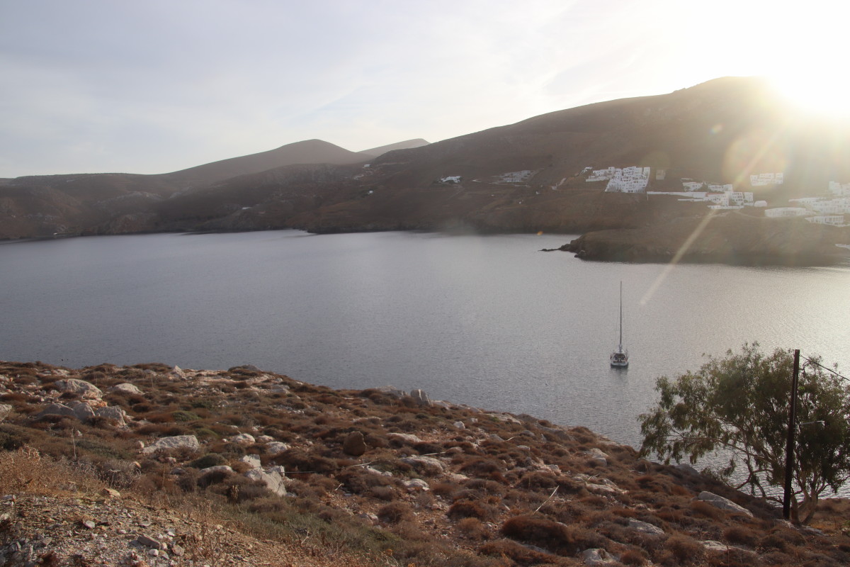 Vendredi on continue notre programme d’entretien sur le bateau vidange moteur pour Domi, nettoyage, rangement et ponçage de l’hélice pour moi . Dans l’après midi on part pour un nouveau raid d’exploration de l’île. Notre objectif : le coucher du soleil à la pointe Lakki en faisant le tour de la péninsule par le nord. On commence par rendre visite à Saint Isidore (Agios Isidorus) dont la petite chapelle à été consstruite sur un rocher relié au rivage par une petite digue d’un mètre de large et surplombant le niveau de la mer de seulement quelques cm. Puis on fait le tour de la baie et c’est là que le mot raid commence à prendre tout son sens: à peine passé le hameau de Drymon la route sinueuse et très étroite mais goudronnée, fait place à une piste de graviers qui devient de plus en plus difficile avec des ornières profondes et des pentes très raides. Mais difficile de faire demi-tour, surtout que le paysage est vraiment superbe. Notre petite citadine Coréenne se défend vaillamment et surmonte tous les obstacle sans faillir même si les derniers mètres avant de rejoindre l’asphalte sont un peu tirés par les cheveux. (et c’est là qu’on a lu les commentaires de Google maps : piste à n’emprunter qu’à pied ou avec un très bon 4X4. Malheureusement on a eu un problème de réglage d’exposition sur l’appareil et on a pu récupérer seulement quelques photos…