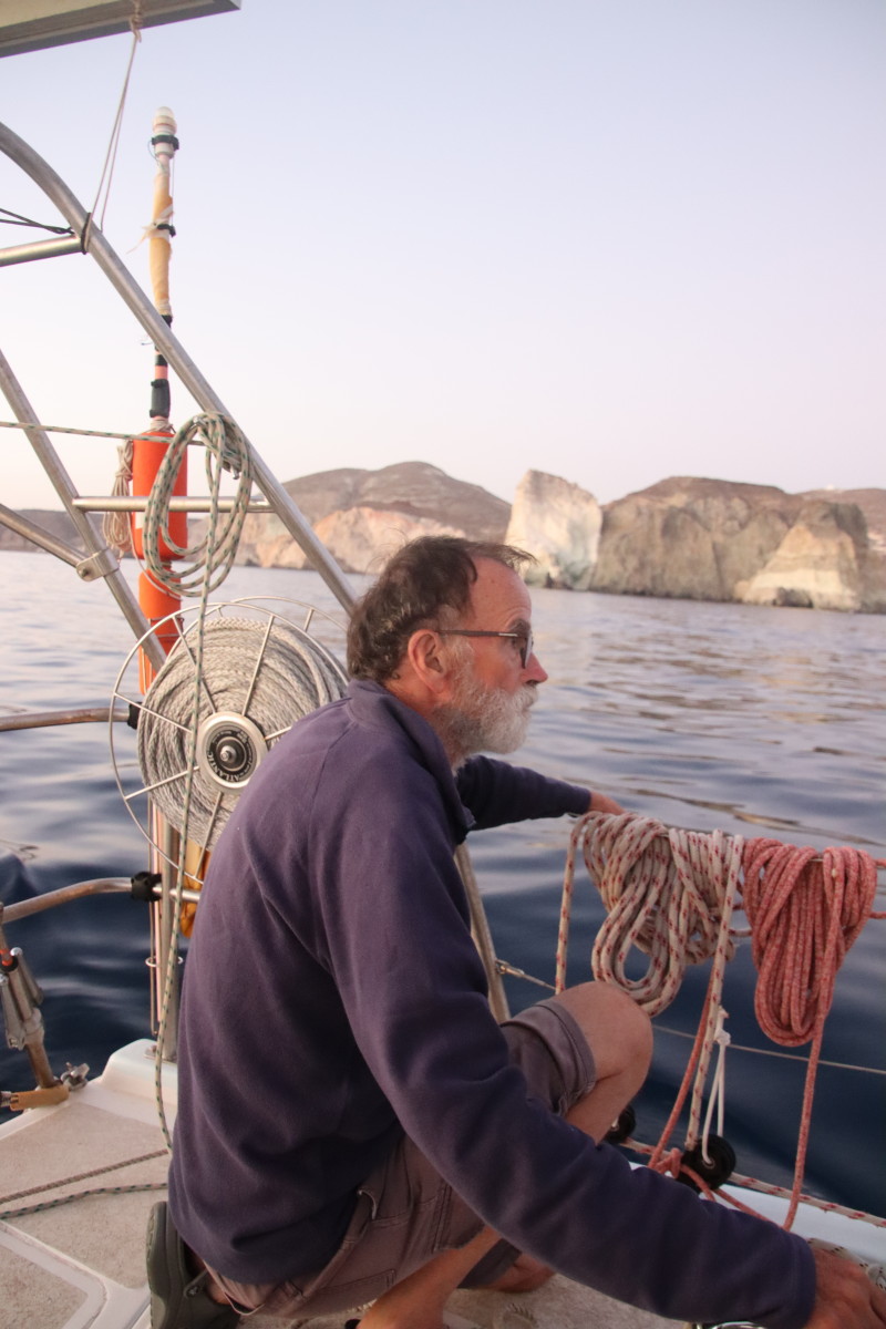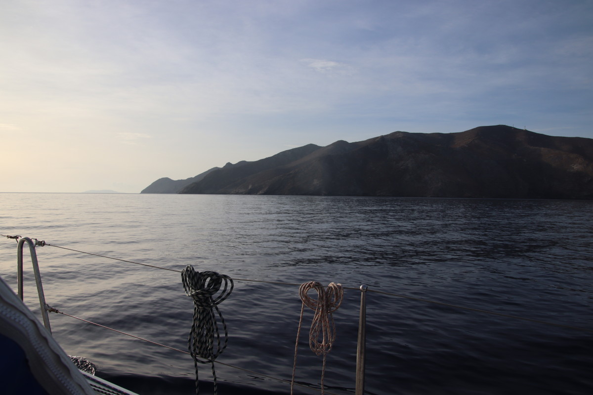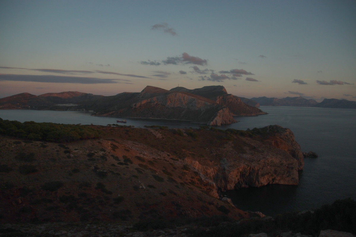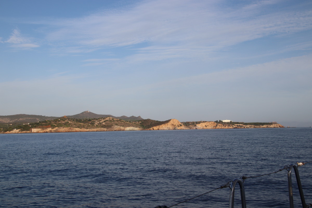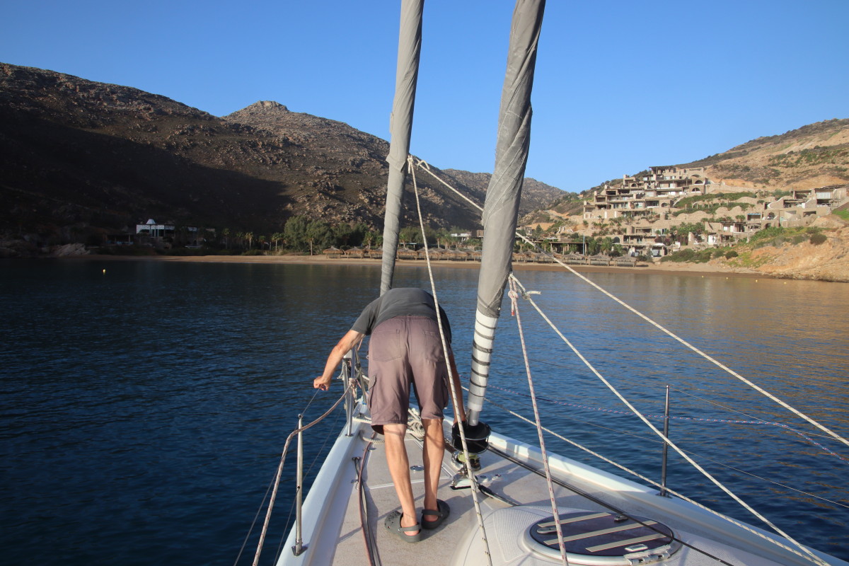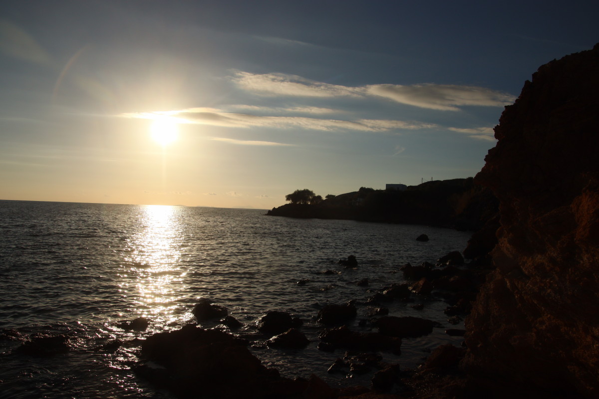Vendredi on continue notre programme d’entretien sur le bateau vidange moteur pour Domi, nettoyage, rangement et ponçage de l’hélice pour moi . Dans l’après midi on part pour un nouveau raid d’exploration de l’île. Notre objectif : le coucher du soleil à la pointe Lakki en faisant le tour de la péninsule par le nord. On commence par rendre visite à Saint Isidore (Agios Isidorus) dont la petite chapelle à été consstruite sur un rocher relié au rivage par une petite digue d’un mètre de large et surplombant le niveau de la mer de seulement quelques cm. Puis on fait le tour de la baie et c’est là que le mot raid commence à prendre tout son sens: à peine passé le hameau de Drymon la route sinueuse et très étroite mais goudronnée, fait place à une piste de graviers qui devient de plus en plus difficile avec des ornières profondes et des pentes très raides. Mais difficile de faire demi-tour, surtout que le paysage est vraiment superbe. Notre petite citadine Coréenne se défend vaillamment et surmonte tous les obstacle sans faillir même si les derniers mètres avant de rejoindre l’asphalte sont un peu tirés par les cheveux. (et c’est là qu’on a lu les commentaires de Google maps : piste à n’emprunter qu’à pied ou avec un très bon 4X4. Malheureusement on a eu un problème de réglage d’exposition sur l’appareil et on a pu récupérer seulement quelques photos…