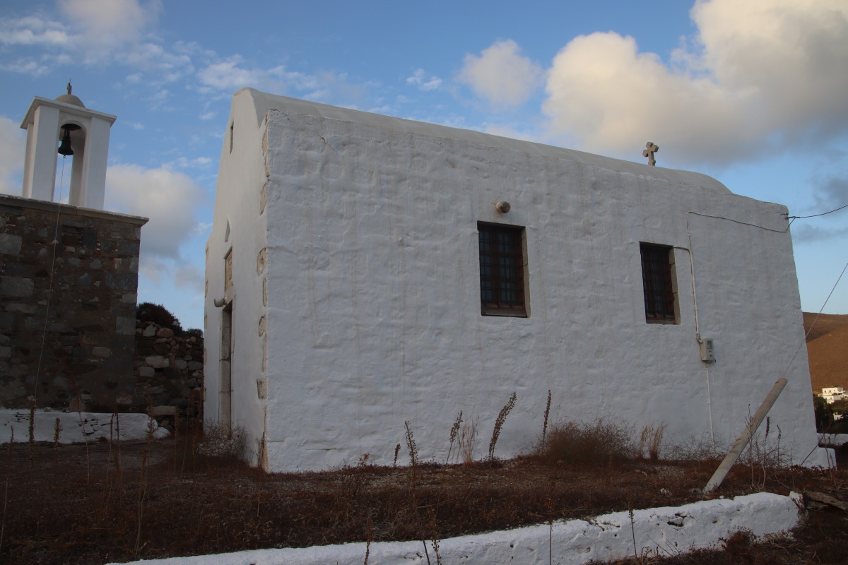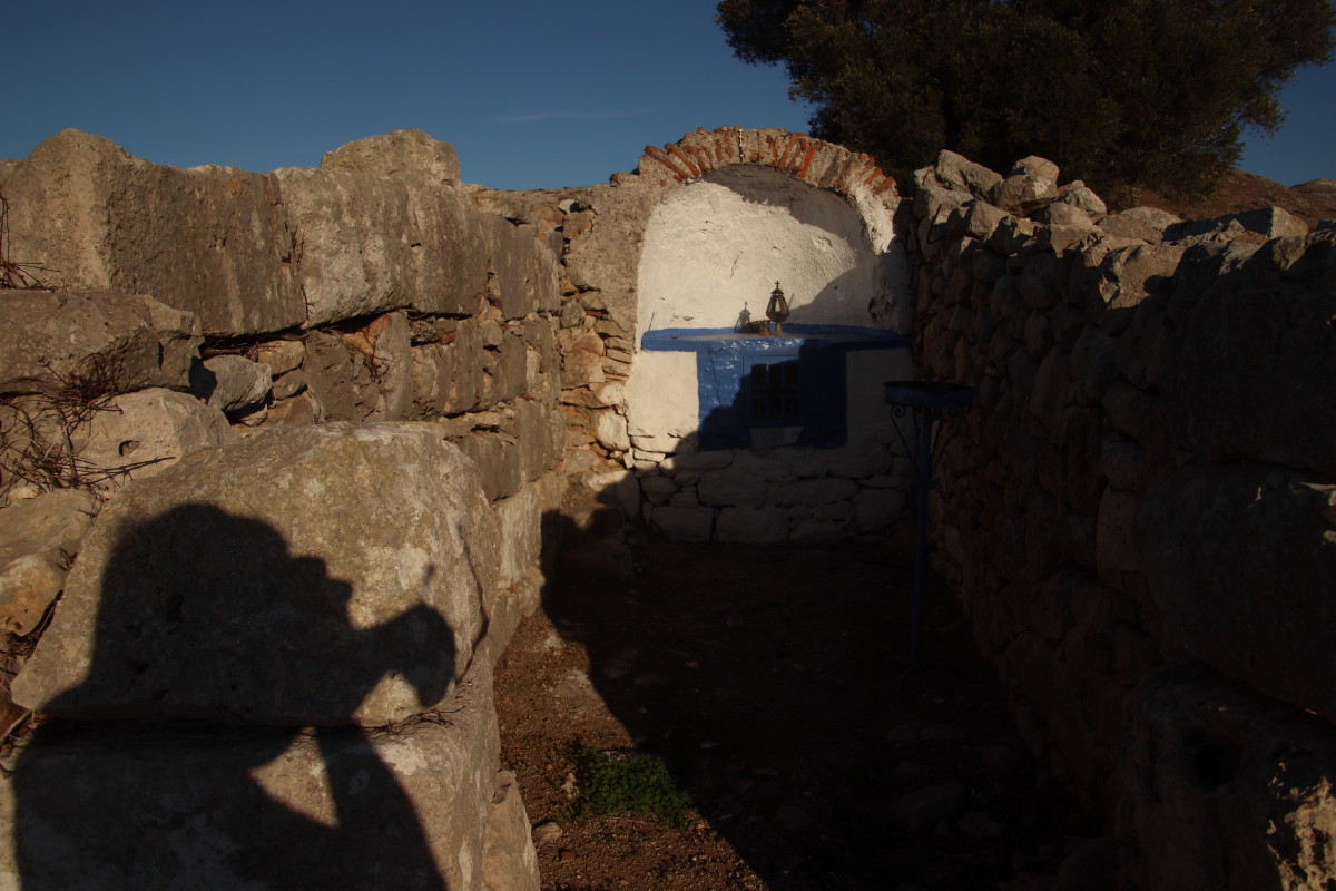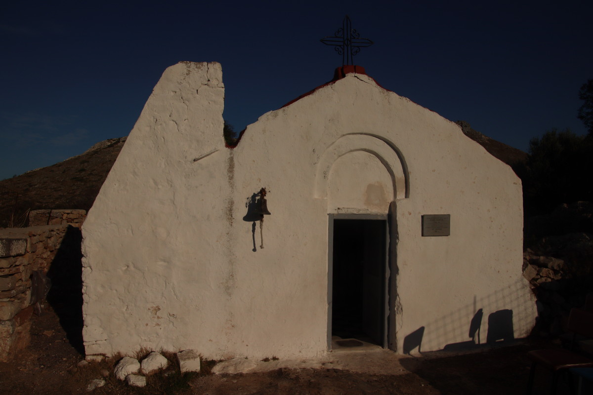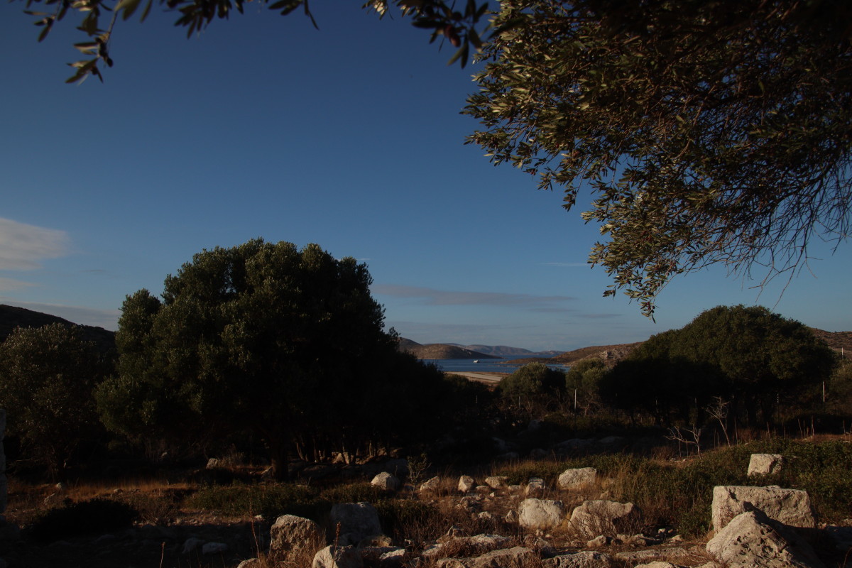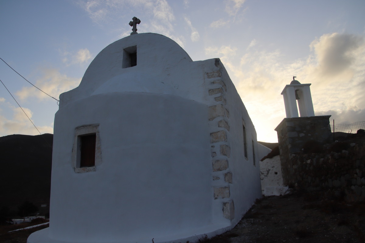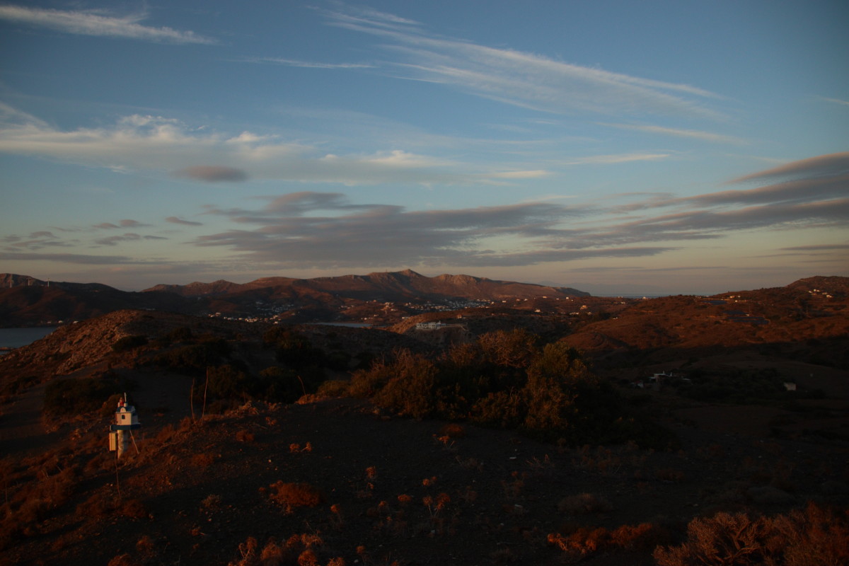 En fin de journée le temps se calme un peu et on peu sortir pour s’aérer un peu en allant revoir la baie de Plakouti juste à l’Est de Partheni et dénicher temple d’Artemis de l’autre côté de la piste d’atterrissage (quelques pierres empilées et une toute petite chapelle)