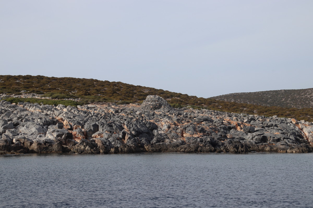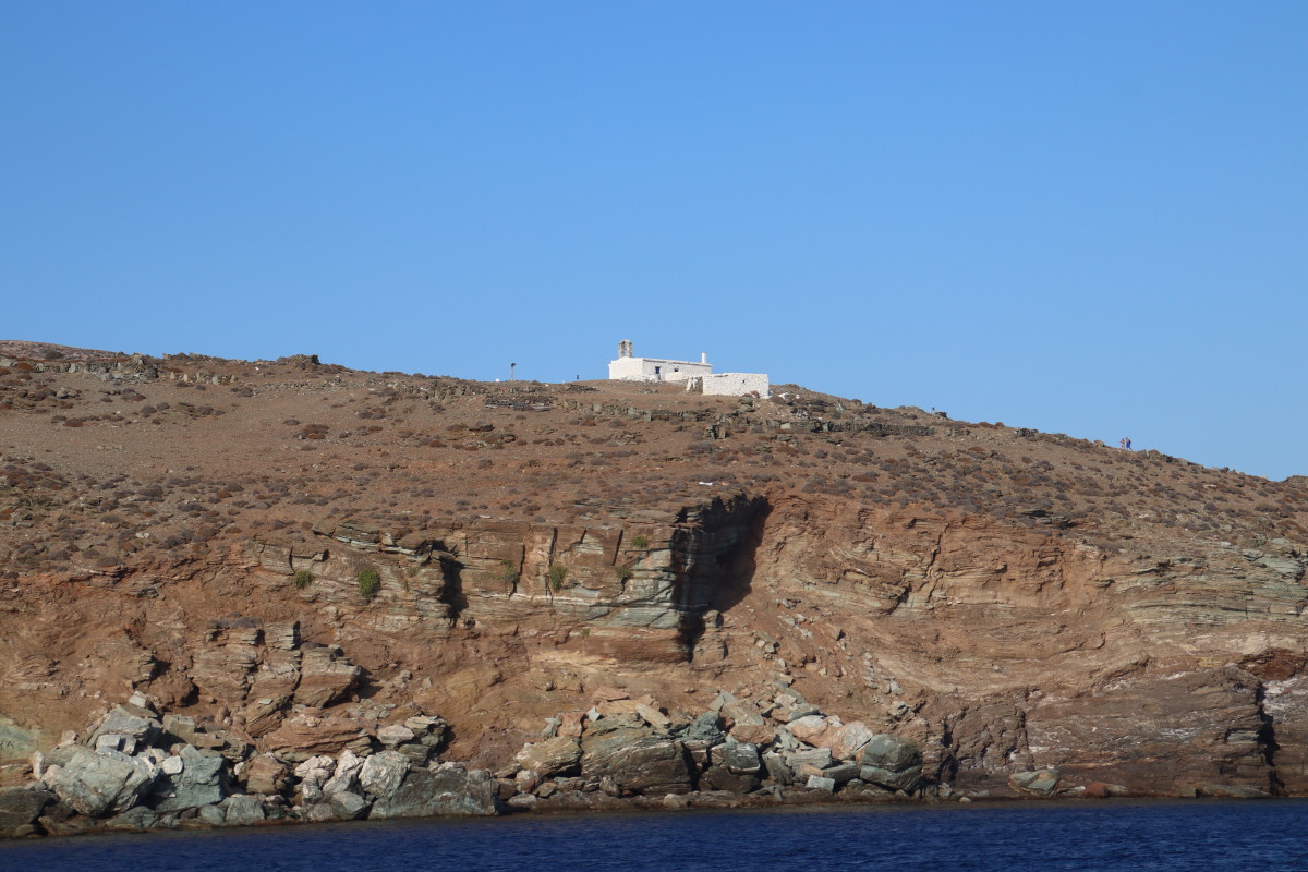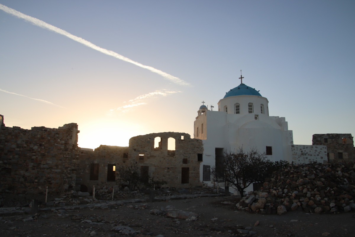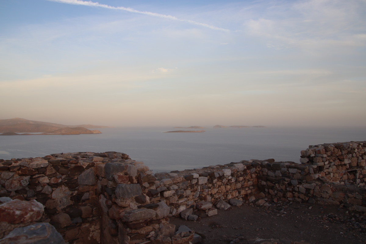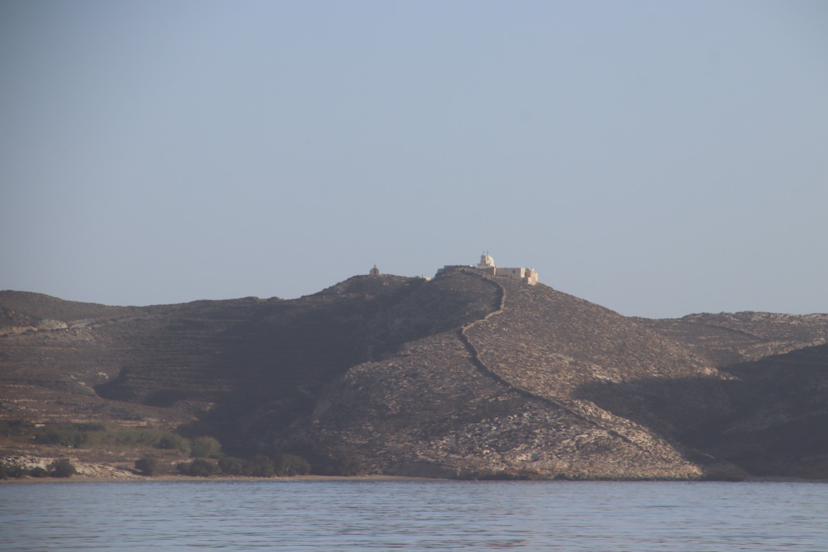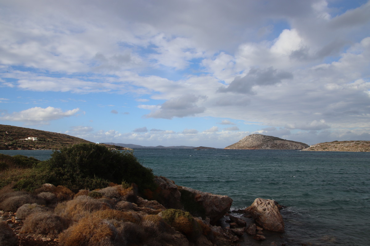 En fin de journée le temps se calme un peu et on peu sortir pour s’aérer un peu en allant revoir la baie de Plakouti juste à l’Est de Partheni et dénicher temple d’Artemis de l’autre côté de la piste d’atterrissage (quelques pierres empilées et une toute petite chapelle)