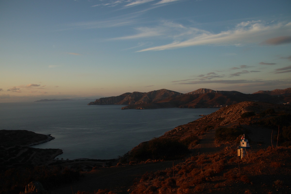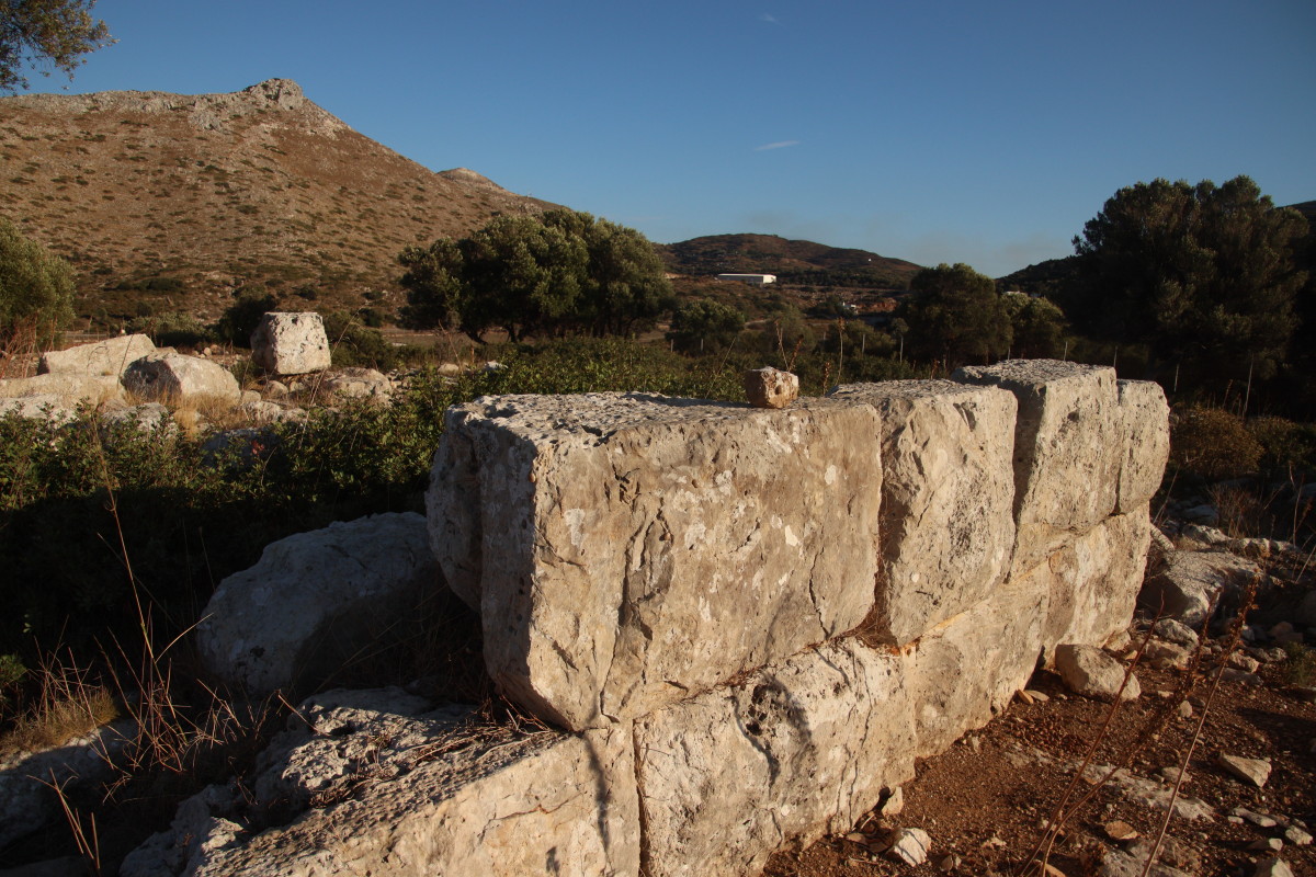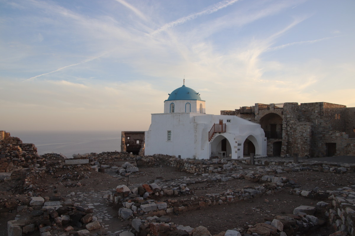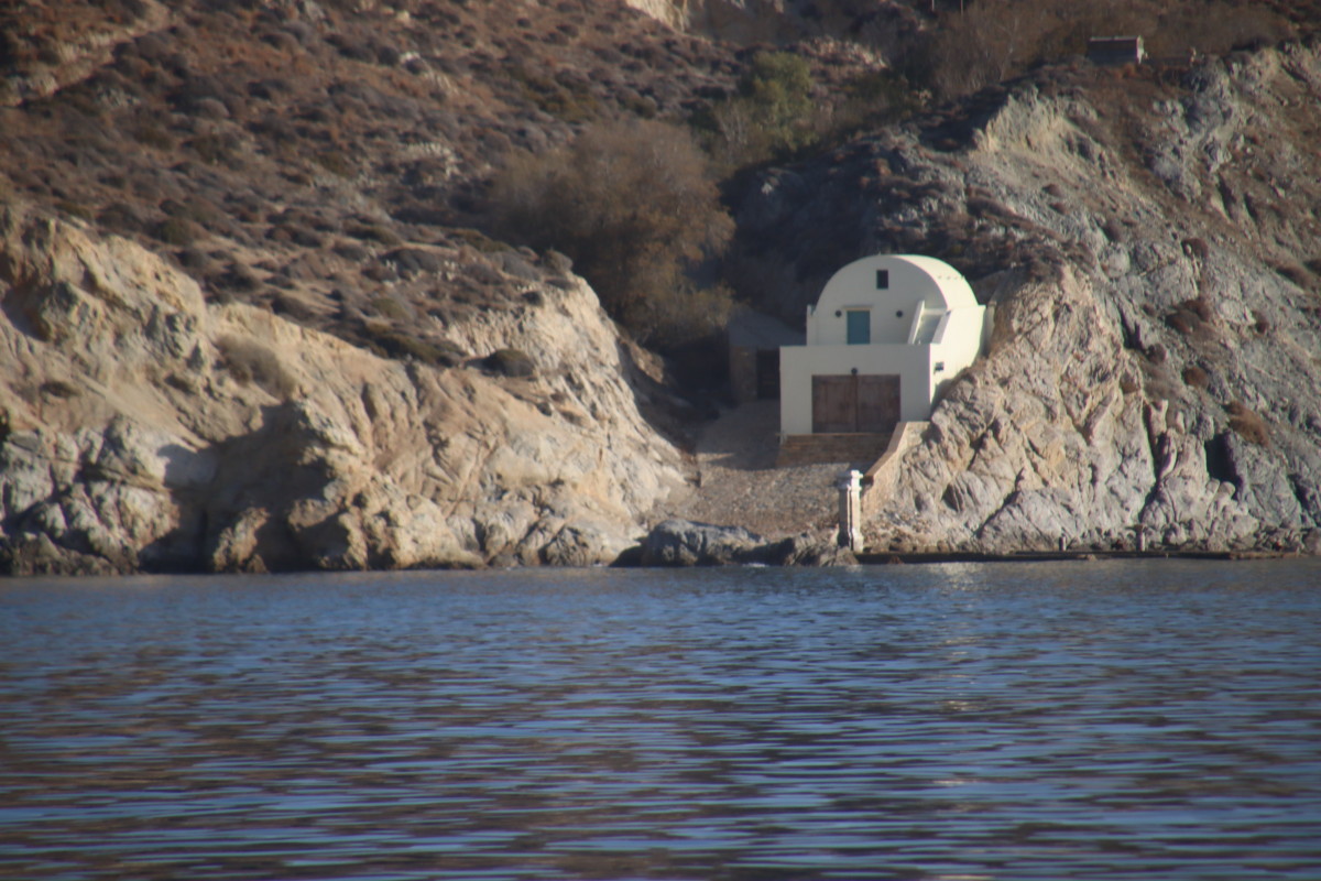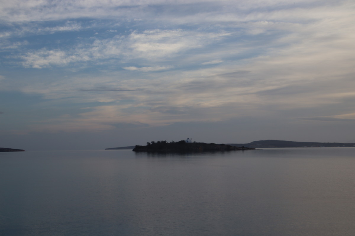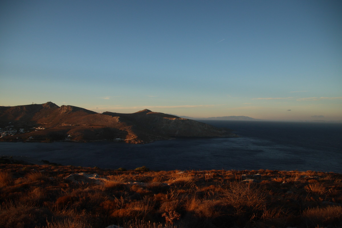 En fin de journée le temps se calme un peu et on peu sortir pour s’aérer un peu en allant revoir la baie de Plakouti juste à l’Est de Partheni et dénicher temple d’Artemis de l’autre côté de la piste d’atterrissage (quelques pierres empilées et une toute petite chapelle)