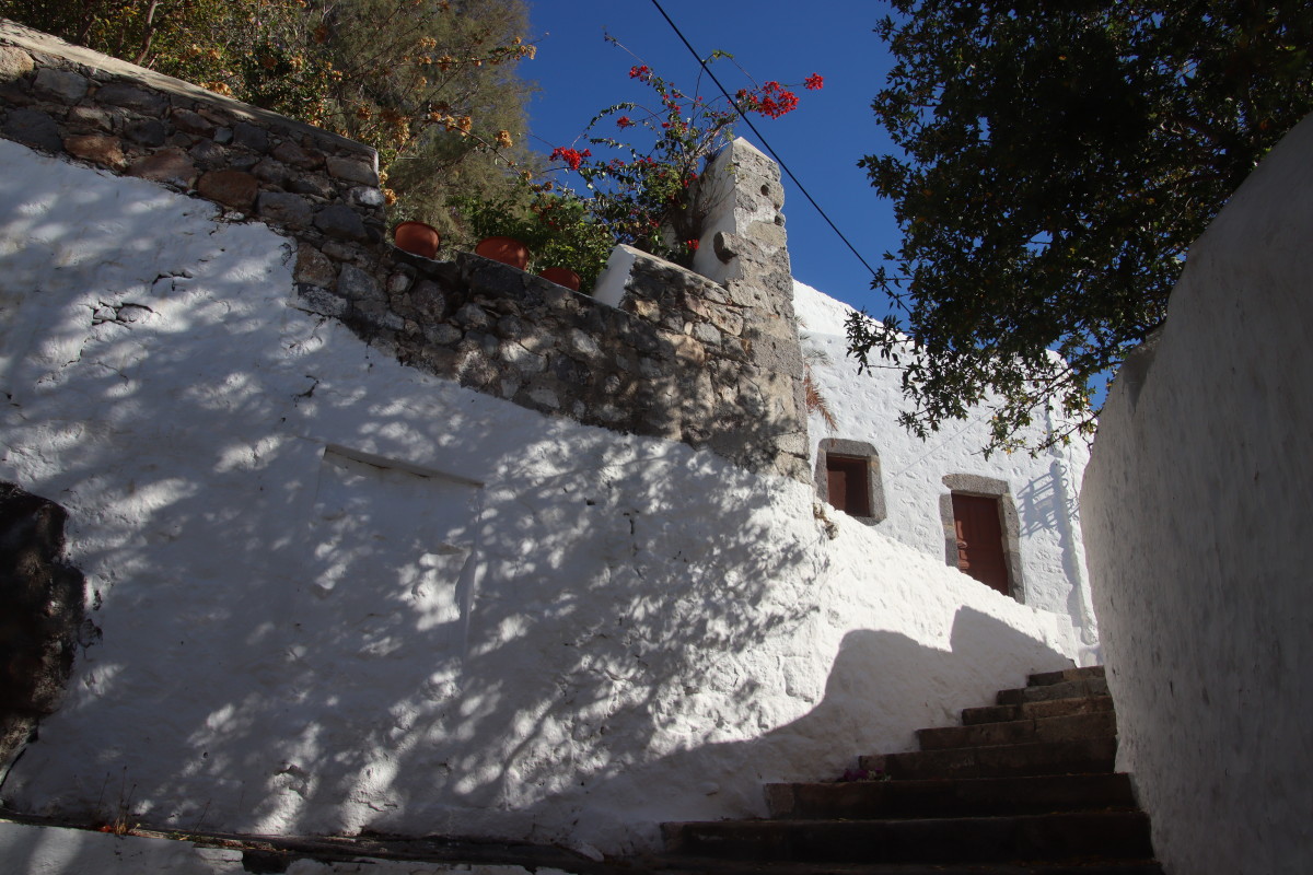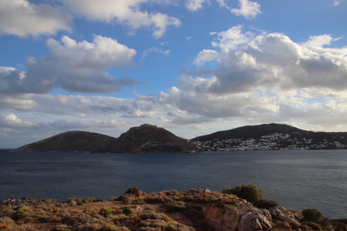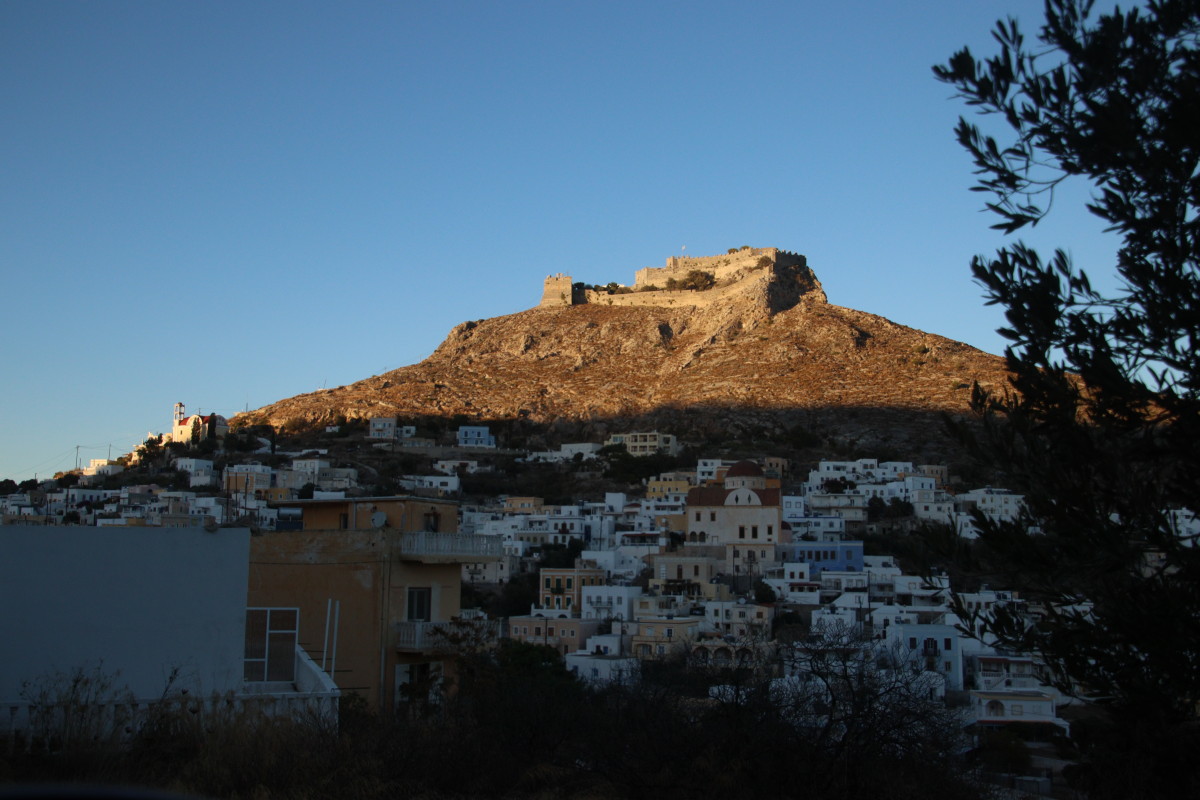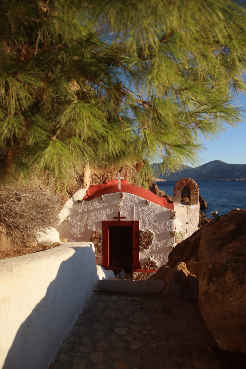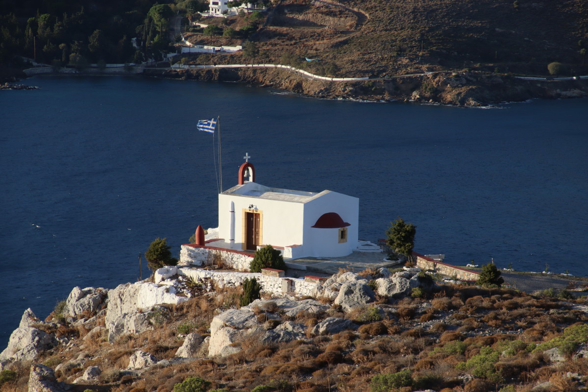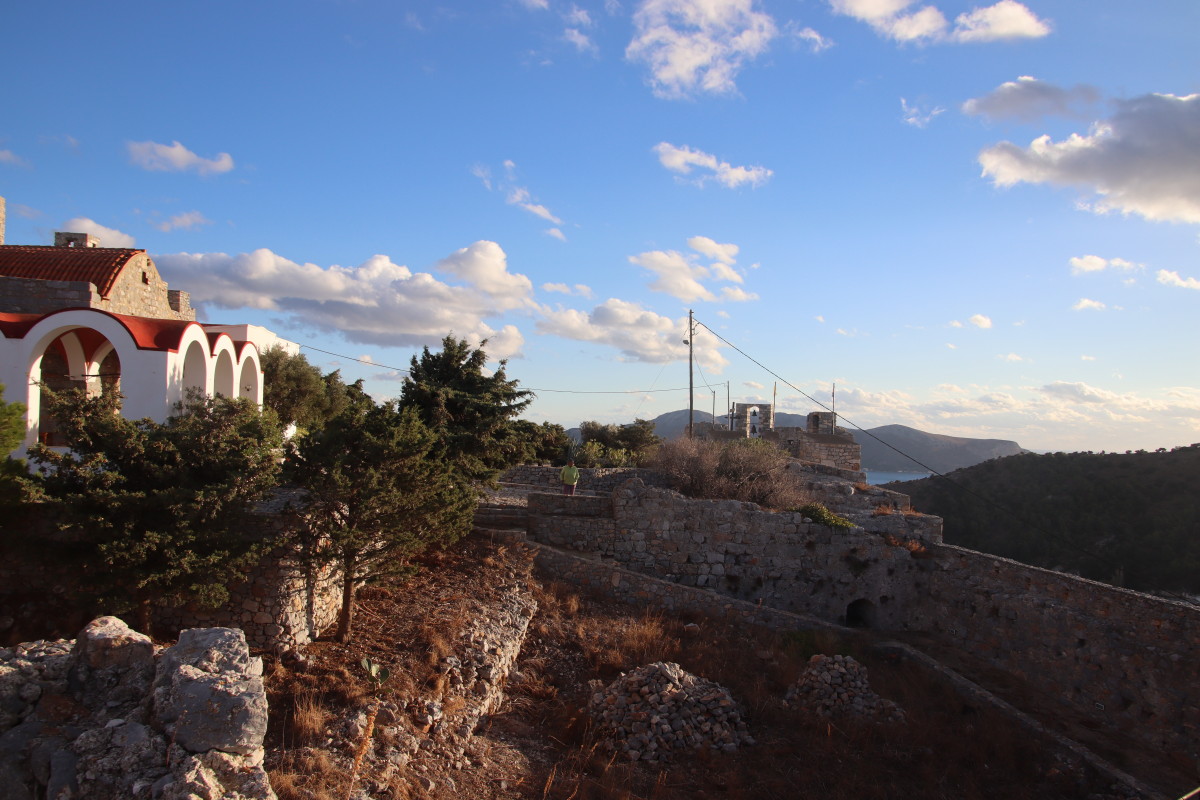 Première sortie le port de Laki et la chapelle de la Vierge Kavouradaina tout au sud de l’île. Il y a un camp d’hébergement de réfugiés à côté de Laki et on en voit beaucoup sur les bords de la route qui vont en ville faire leurs courses. La petite chapelle, nichée dans un creux de rocher sur la côte Est de la baie est vraiment adorable. La vue sur les sommets de Rethymno et les îlots parsèment le passage entre les deux îles est de toute beauté. Dans la lumière rasante de cette fin de journée la vue ferait plus penser au Lofoten qu’au Dodécanèse. Retour par Agia Marina et sa forteresse (malheureusement fermée nous y reviendrons dimanche) en rentrant nous empruntons ce qui semblait sur google maps un bon raccourci mais qui était en fait un sens interdit et sans doute la rue la plus étroite de l’île heureusement les habitants nous cèdent le passage et nous aident à nous en sortir. Les grecs sont vraiment des gens adorables dans une telle situation en France on se serait sans doute fait traiter de noms d’oiseaux.