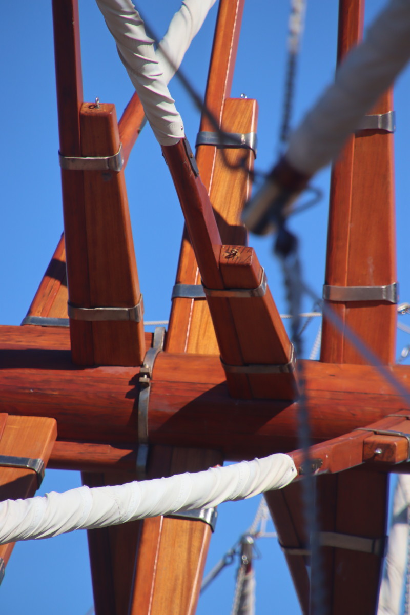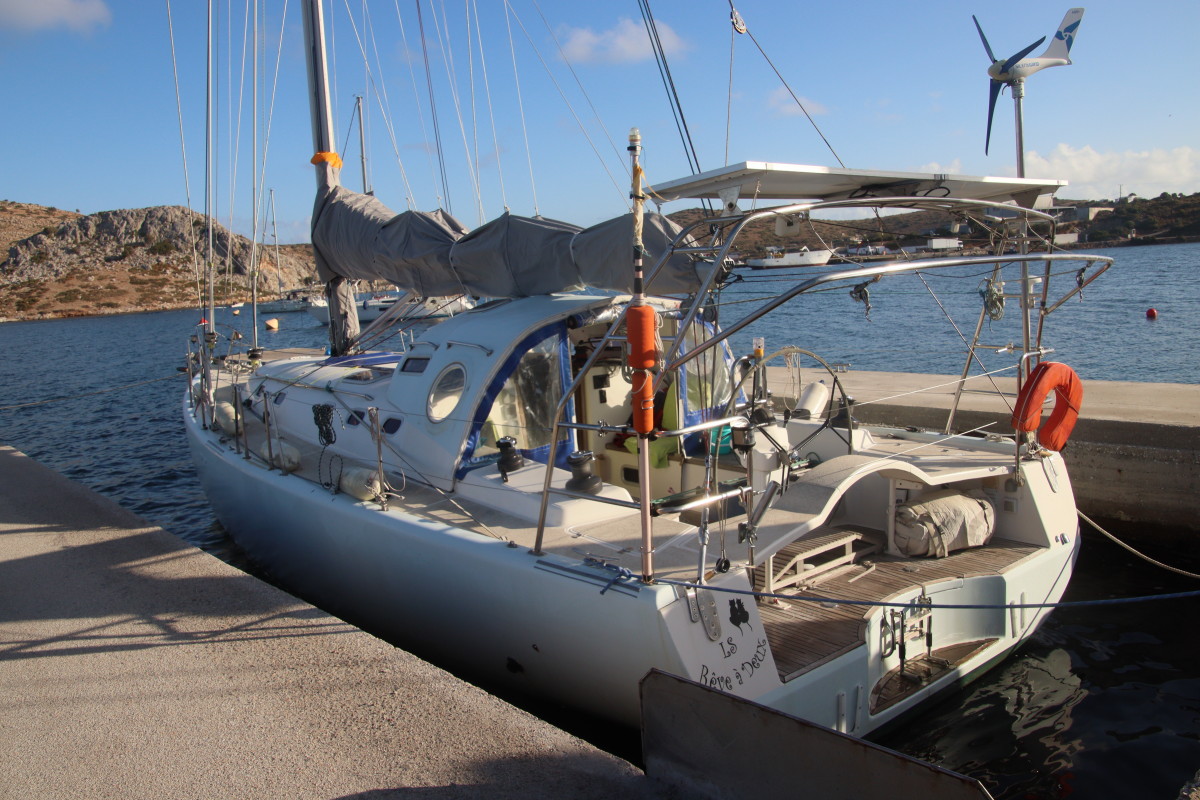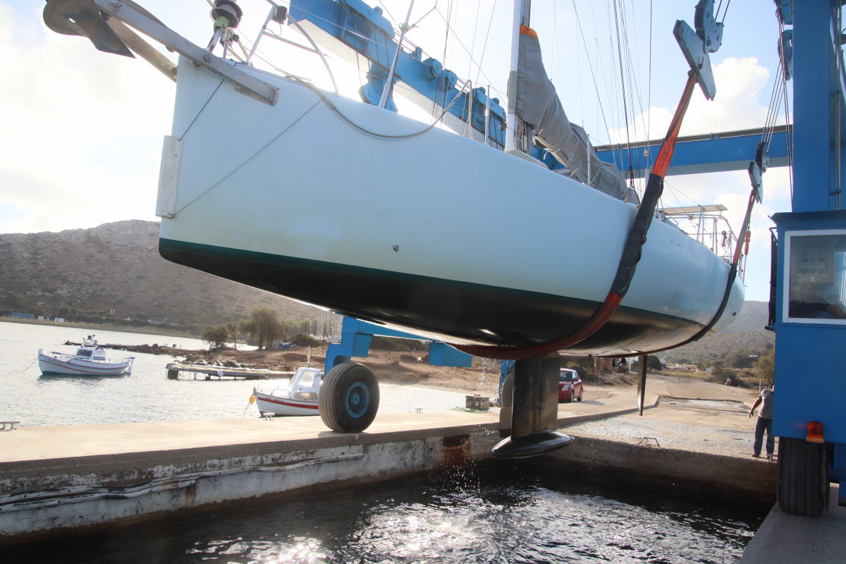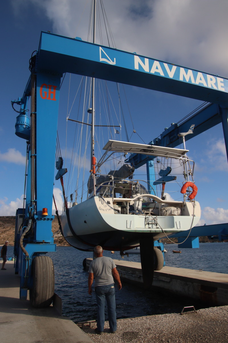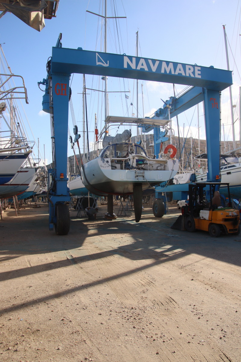 Finalement il est 9:30 quand nous entrons en marche arrière dans la forme. Le vent est encore faible et n’a pas tourné. Les deux opérateurs sont vraiment super-pros (il faut dire que vu le nombre de bateaux qu’ils bougent dans l’année, ils peuvent avoir accumulé une sacré expérience) et notre sortie de l’eau est probablement la plus parfaite que nous ayons eu . Par contre et en dépit des exigences européennes le chantier n’a pas d’aire de carénage protégée et dans l’après-midi ils nettoient la carène du voisin au karcher sur place à quelques centimètres de nous. Toute la moitié tribord de Rêve à Deux se retrouve couverte de dégoulinures bleu foncé y compris le pont. Le sol en dessous du bateau n’est plus qu’une grande pataugeoire bleue ! Bravo la pollution !