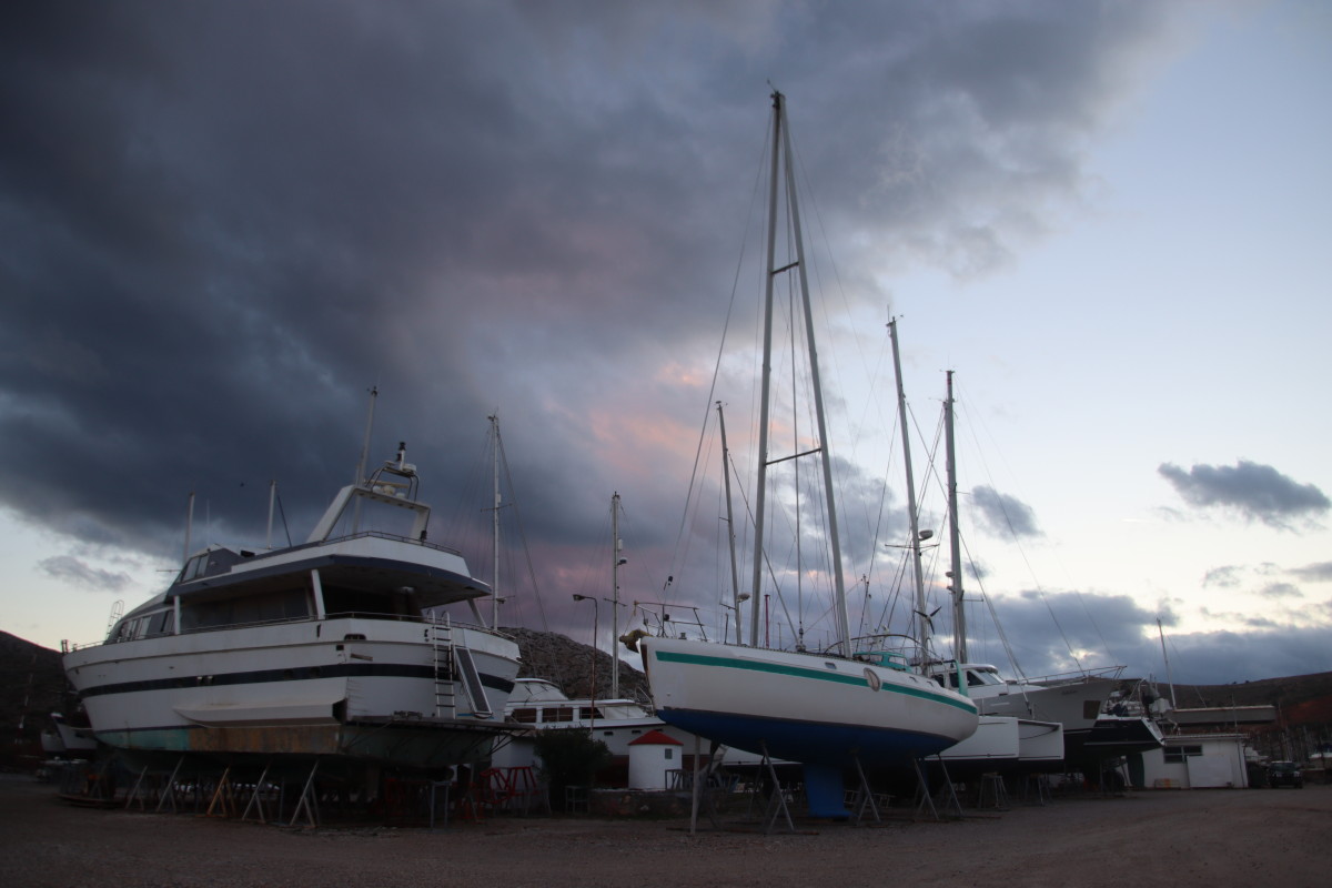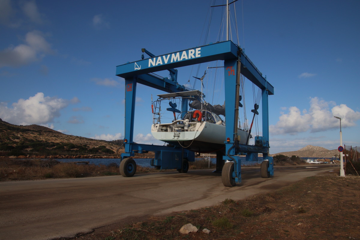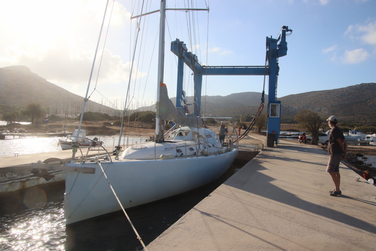 Jeudi 08:00 nous sommes dans les starting blocks près à faire mouvement dès que le grutier nous fera signe. La raison de cet angoisse est que si les prévisions météo sont bonnes pour les premières heures de la matinée, à partir de 09:30 où 10:00 selon les modèles, le vent jusque là faible et de terre doit tourner au nord en se renforçant à 20 nds rafales à 25 ce qui rendrait l’entrée dans la forme de levage très délicate. En plus nous sommes 2 bateaux à sortir de l’eau ce matin. A 08:30 toujours aucun signe du travelift. Le voisin appelle le chantier à la VHF et nous apprenons que nous serons les premiers à sortir de l’eau (grand ouf! de notre part et grande engouasse pour le voisin qui devra attendre son tour).