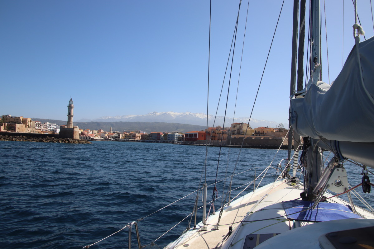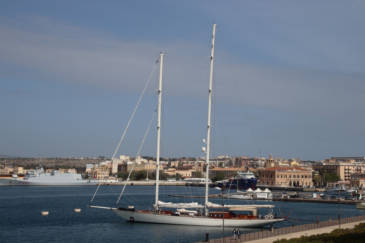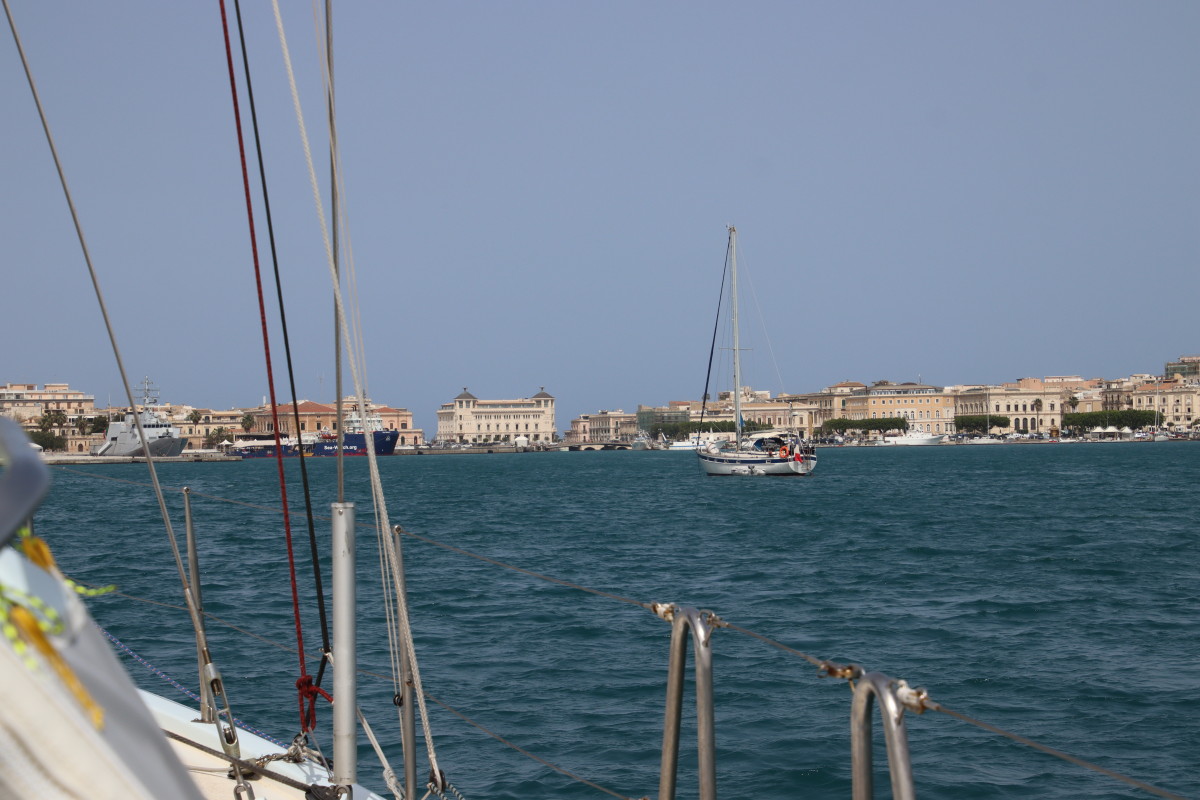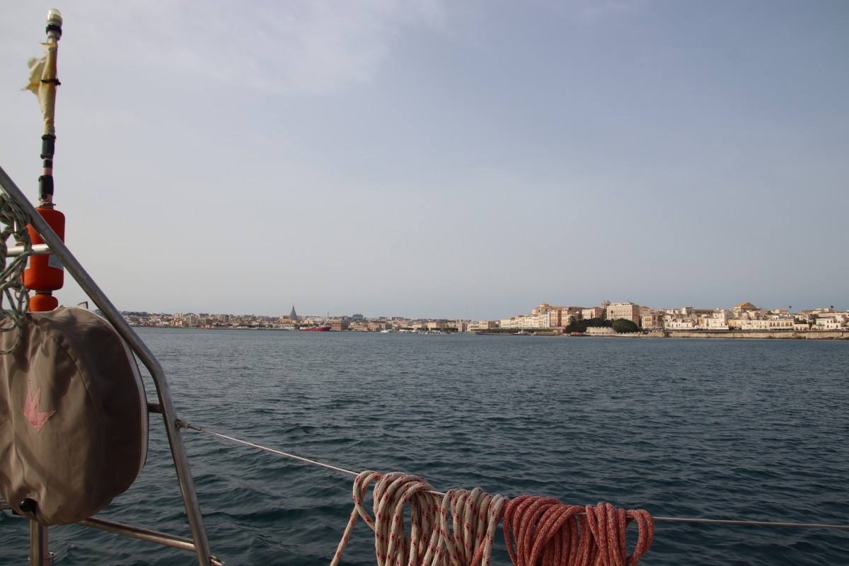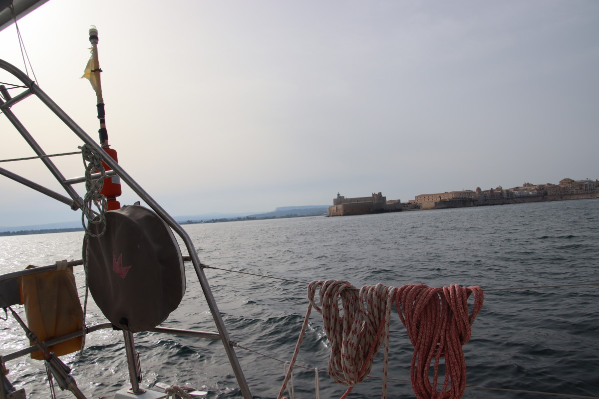 Le Mercredi 10 avril 2024 à 02:00 nous mouillons dans la rade de Syracuse après 3 jours et 18 heures de traversée. Nous avons suivi assez précisément les routages que nous avions fait avant de quitter la Crète (nous n’avons plus d’abonnement Iridium donc plus d’internet quand nous sommes en dehors de portée des antennes 4G soit environ 10 à 20 milles des côtes) Les prévisions des gribs se sont révélées étonnamment proches de la réalité jusqu’à l’arrivée en dépit du fait qu’elles dataient de 4 jours (Arpège, GFS et ICON – les 3 donnaient sensiblement les mêmes conditions). Du petit temps au départ, quarante heures de vent bien soutenus mais jamais plus de 18 nœuds, 1 vingtaine d’heures de moteur pour aider le passage dans la mer avec moins de 7 nds de vent et d’excellentes conditions de mer et de vent pour les dernières 24 heures. Énormément de trafic maritime dans les deux sens, j’ai dû appeler au moins 8 cargos pour savoir de quel côté ils voulaient nous croiser suscitant toujours une réaction très aimable de l’officier de quart suivi d’un changement de route leur permettant de passer à bonne distance. Aussi beaucoup d’activités de contrôle de la part de la marine et des gardes côtes italiens avec navires et avions, sans doute la chasse aux passeurs de migrants?