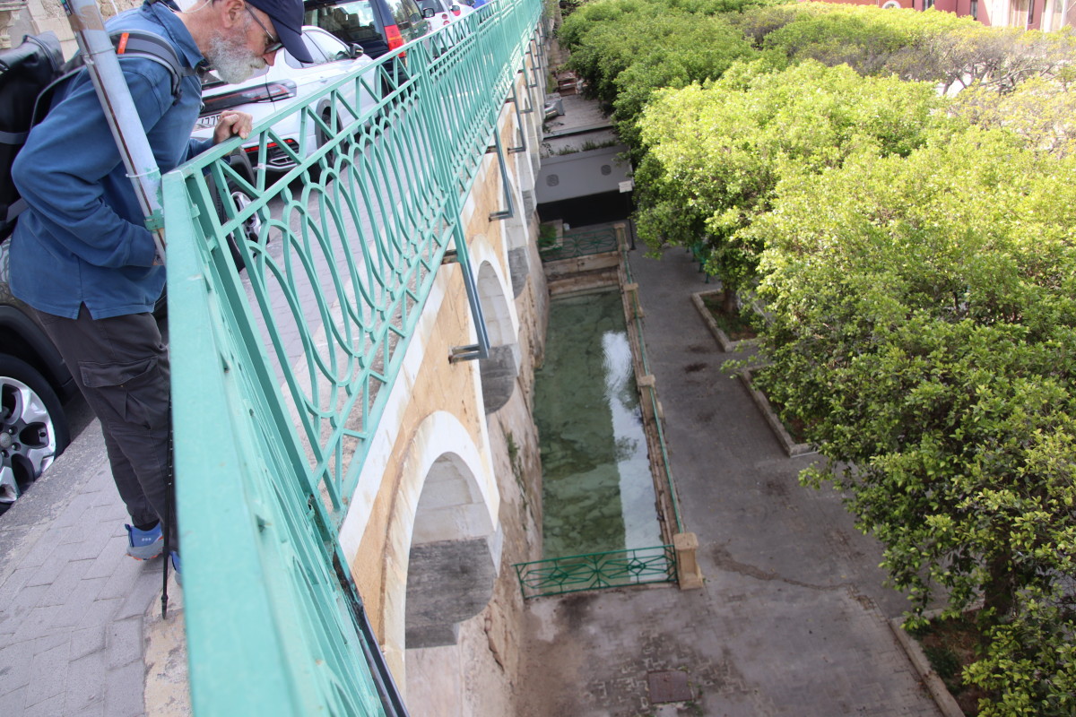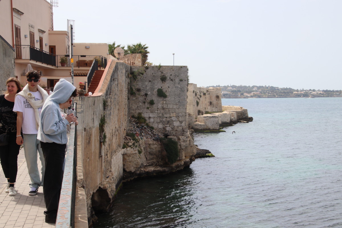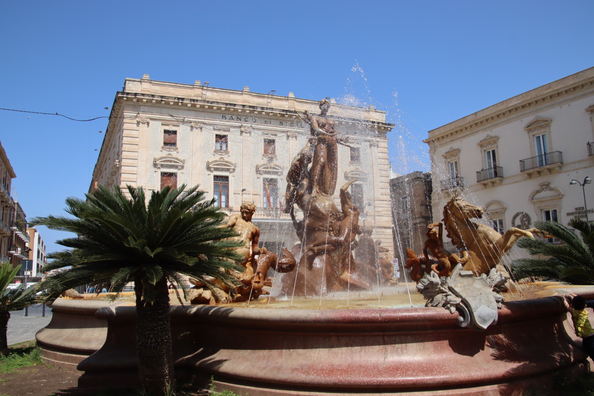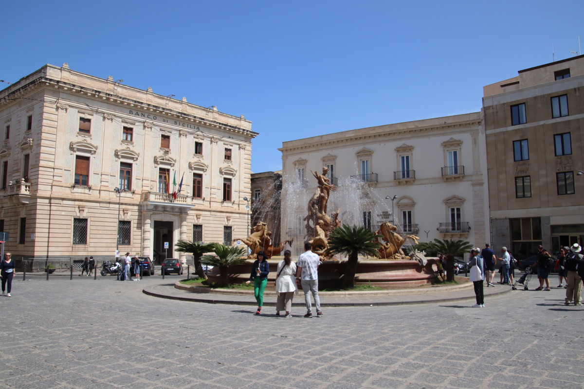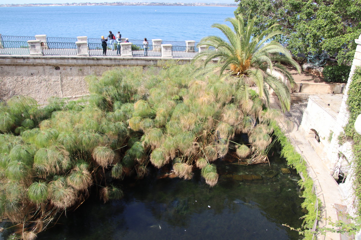 On commence notre visite par les remparts surplombant la rade. La fontaine d’Arethuse est une source d’eau douce limpide coulant dans un bassin pratiquement au niveau de la mer dont elle est protégée par un mur. Elle alimentait autrefois la ville en eau potable. La légende veut que la nymphe Aréthuse aurait été changée en source par Diane pour lui permettre d’échapper aux assiduités du dieu fleuve Alphée.