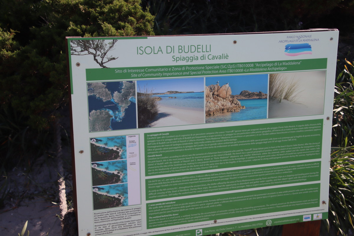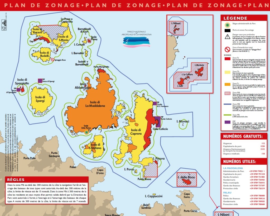 Tout l’archipel de Maddalena et les îlots voisins ont été déclaré parc naturel depuis de nombreuses années afin de limiter l’impact du tourisme et de la pêche sur la faune et la flore tant marine que terrestre. Des règles strictes mais assez simples ont été mises en place (voir carte ci-dessous) et un permis d’entrée payant imposé pour financer une partie du coût de cette protection. On peut le souscrire directement en ligne (et voir les tarifs) à cette adresse : https://autorizzazioni.lamaddalenapark.it/index.php?ssez=Home&lang=fr_FR