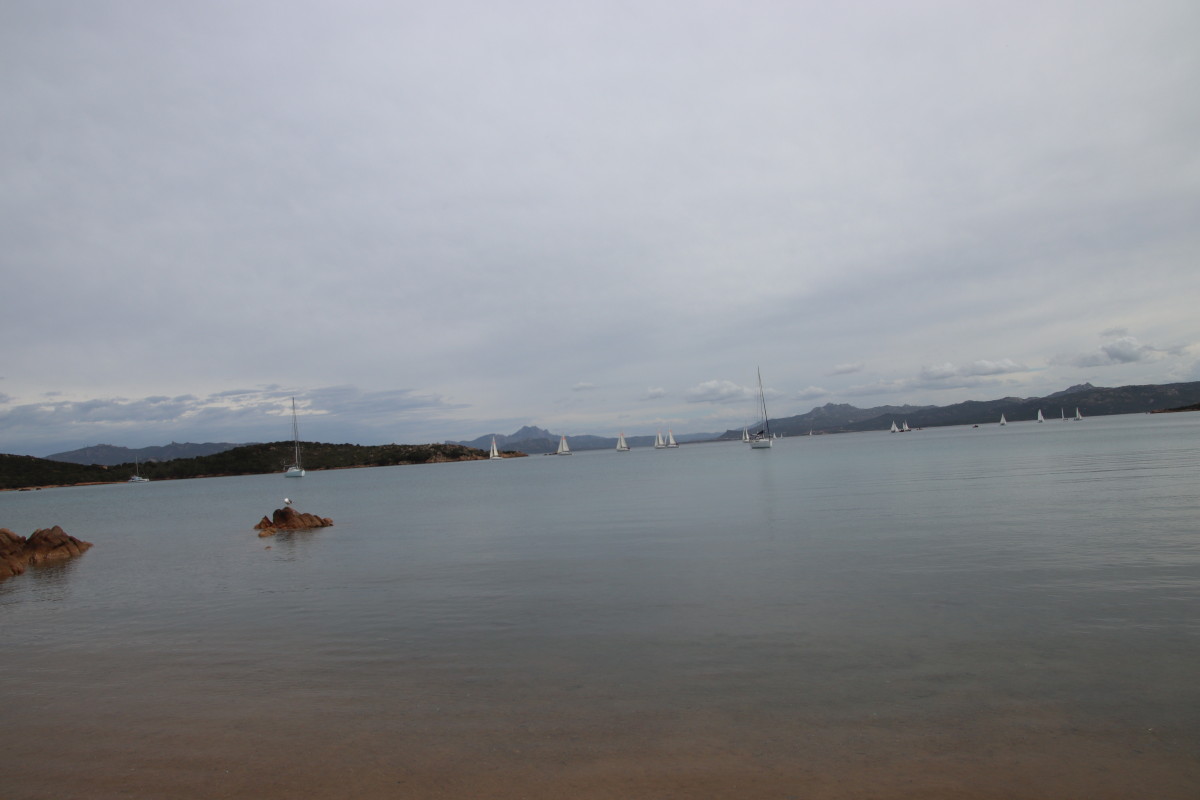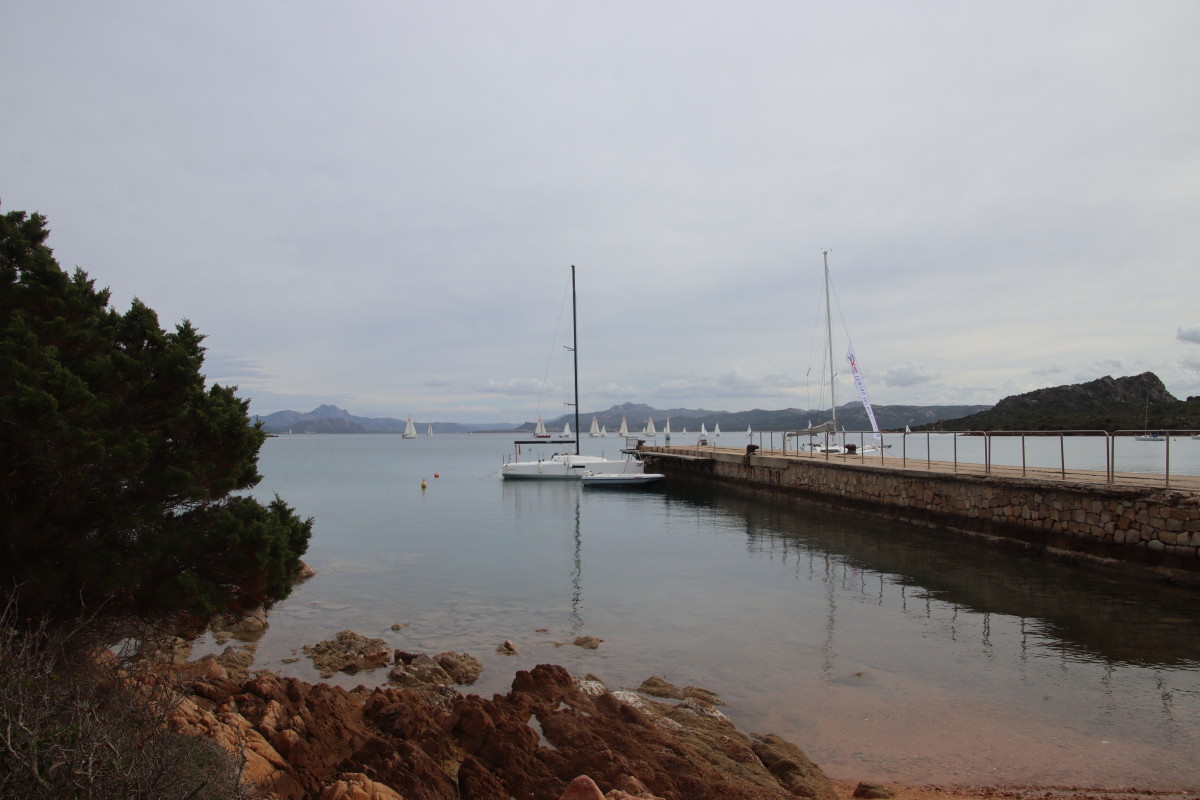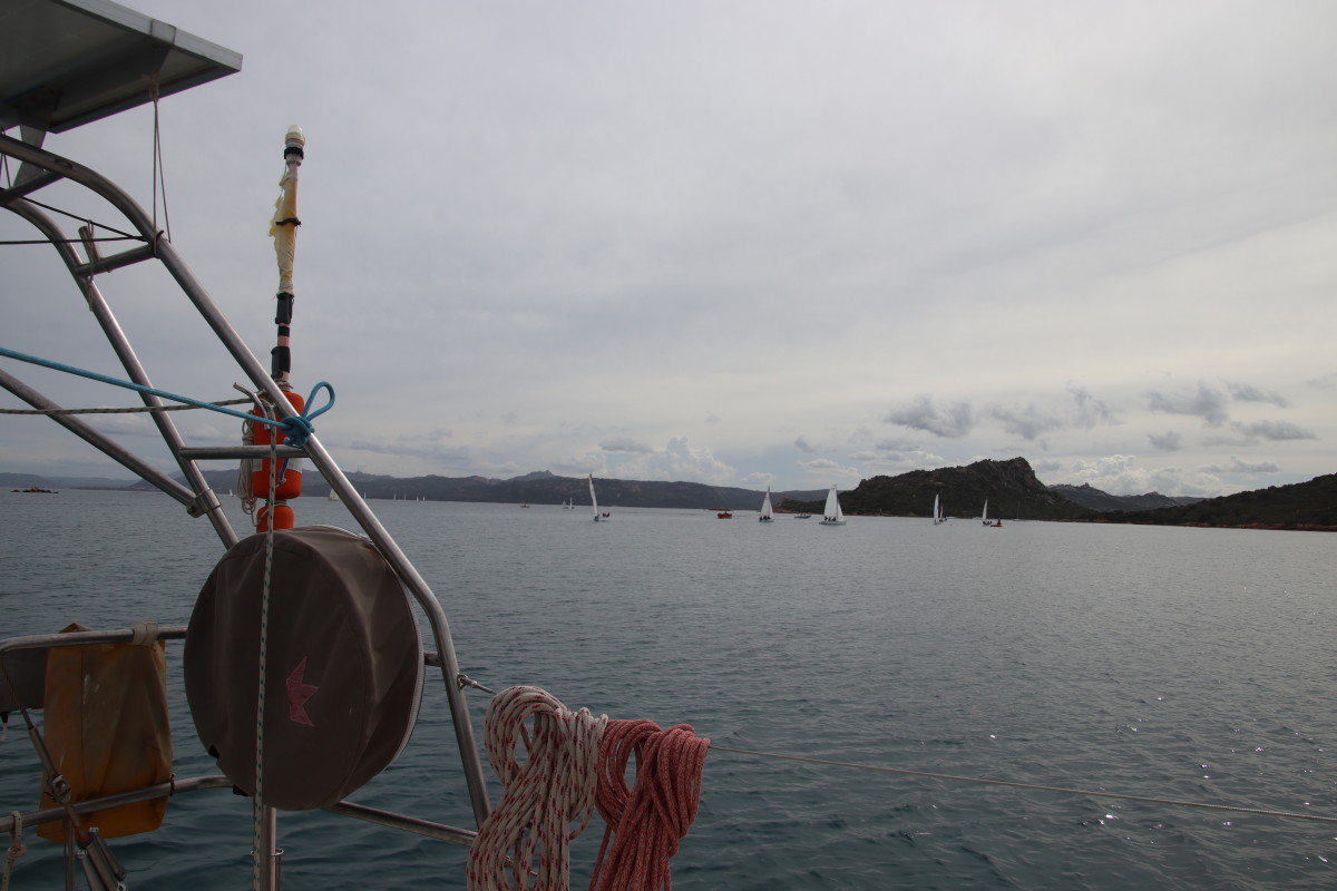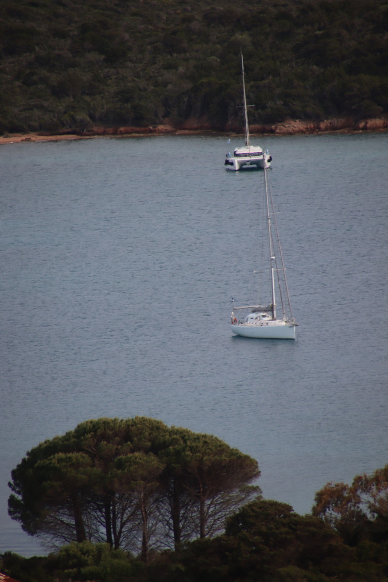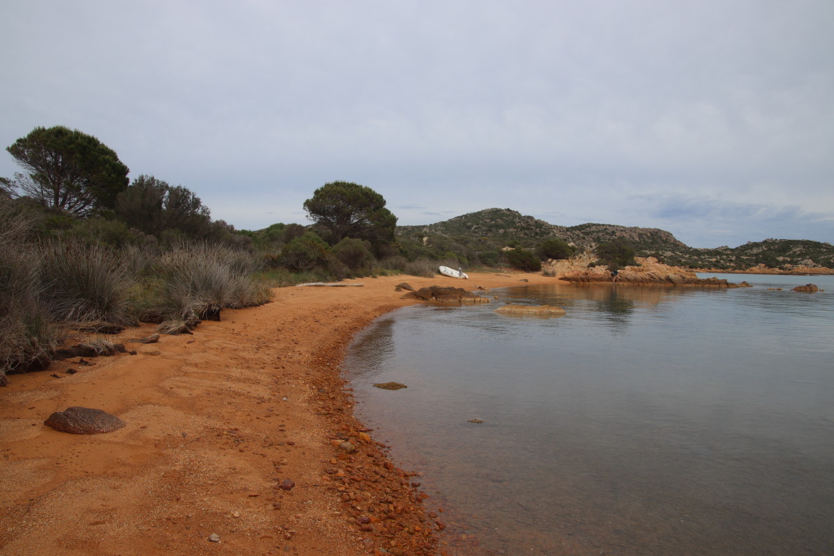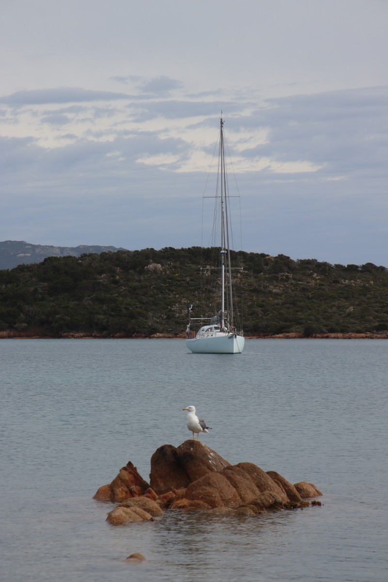 Nous commençons ce séjour par 2 jours dans la baie de Porto Palma sur la côte sud de Caprera. Encore tranquille en cette saison nous avons toute la place pour choisir un beau patch de sable sans posidonie pour y déposer notre ancre. La baie est le terrain de jeu d’une école de voile très active (ça nous rappelle des souvenirs de jeunesse) et toute la journée dériveurs et petits habitables de régate s’ébattent dans un ballet incessant d’empannages, virements de bords et autres manœuvres.
